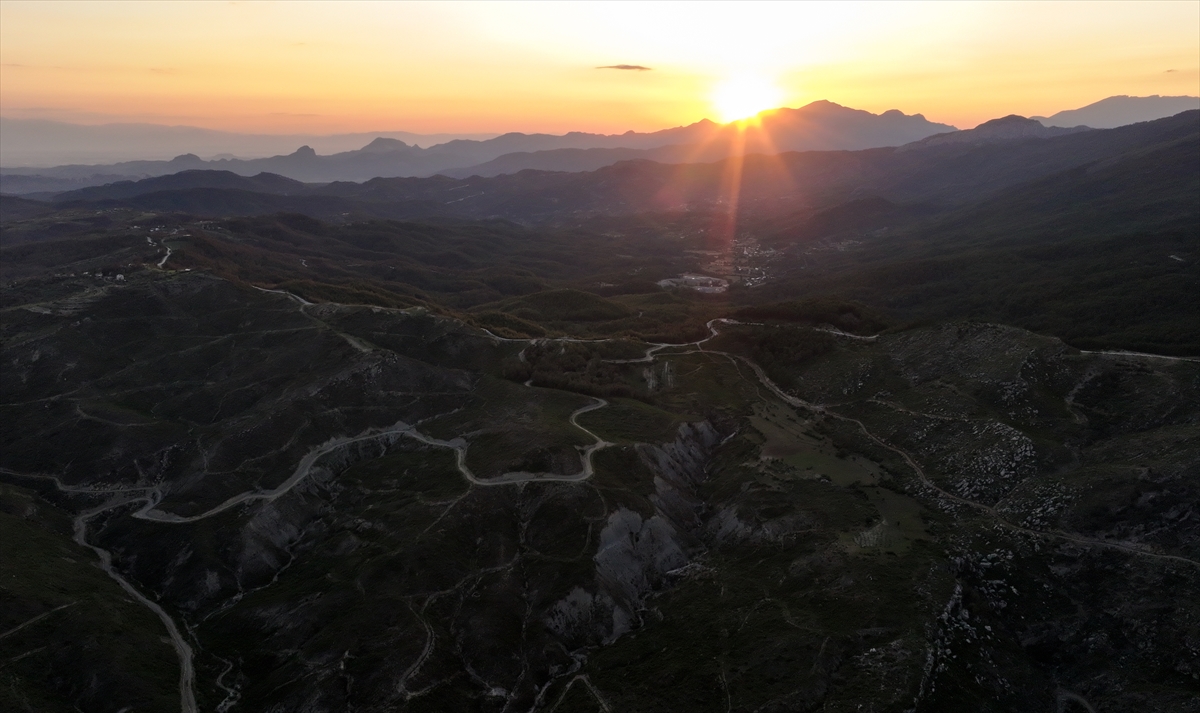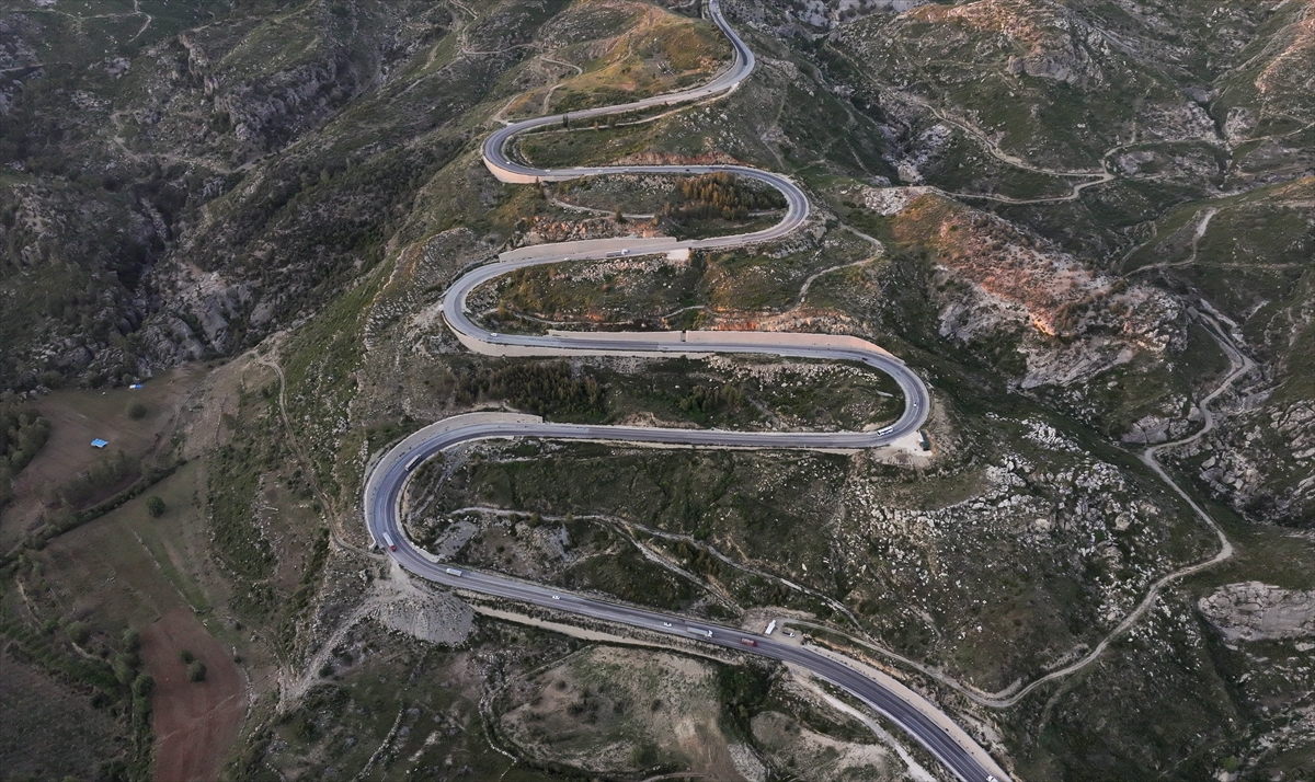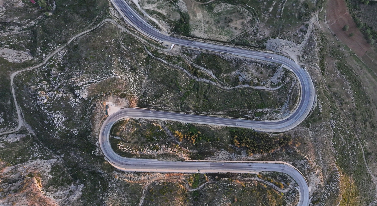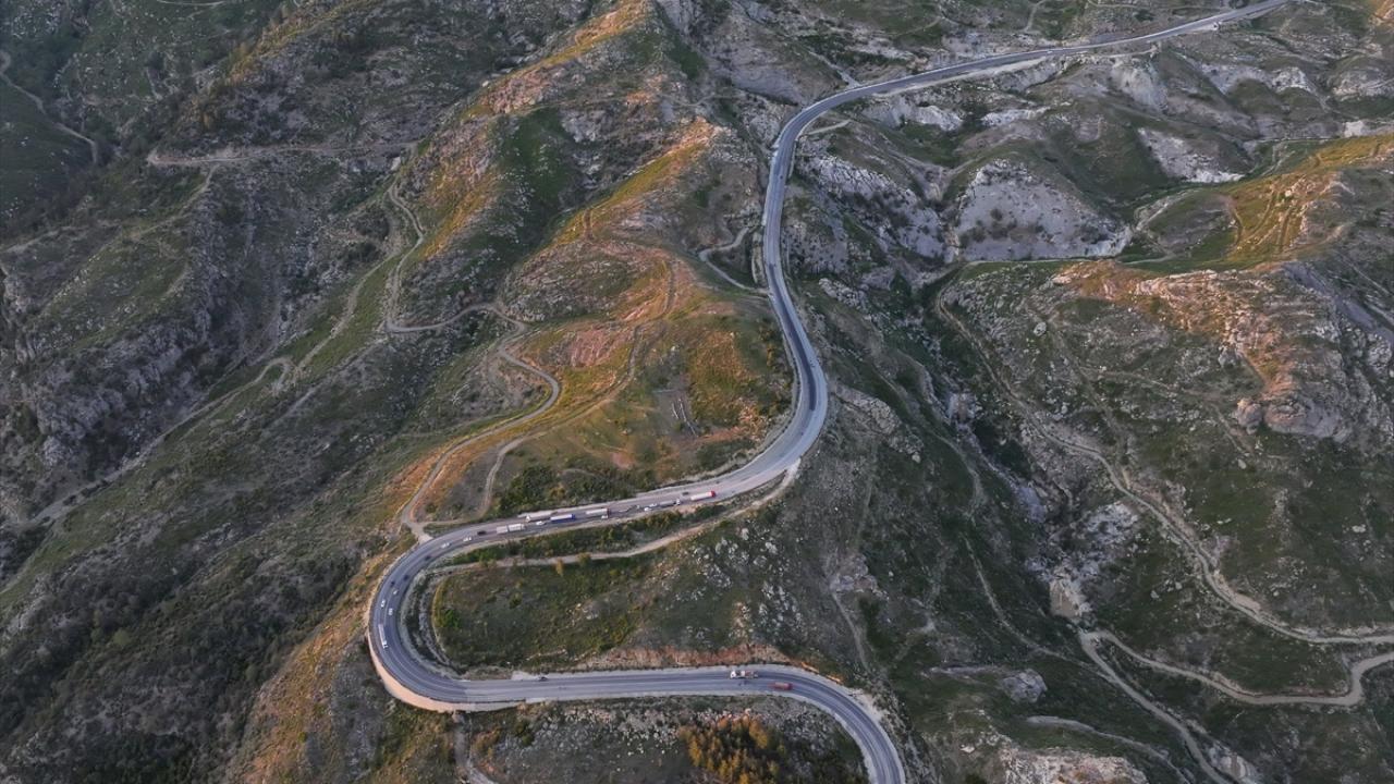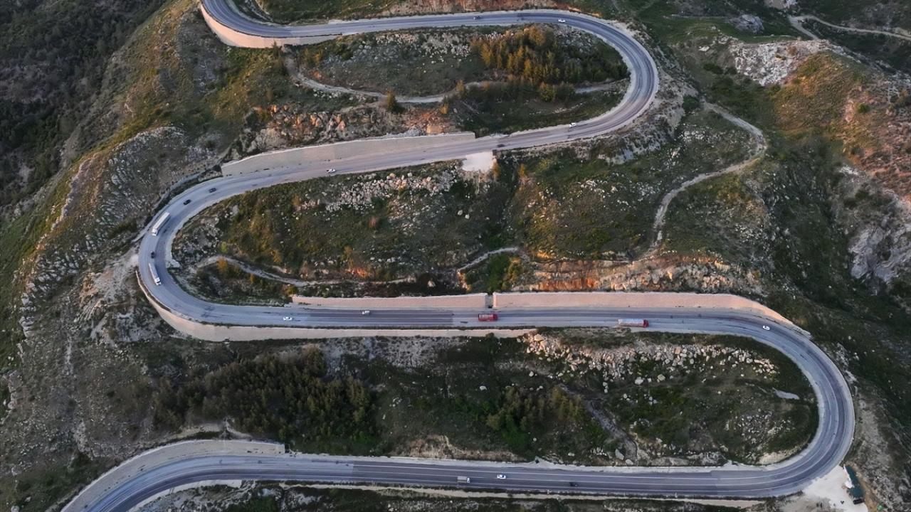 Antalya`yı, Konya`ya ve iç kesimlere bağlayan kuzey-güney aksı konumundaki Demirkapı Tüneli`ne bağlanan Antalya-Manavgat Ayrımı-Taşağıl-Derebucak Yolu güzergahında kıvrımlı yol, gün batımında dronla görüntülendi.