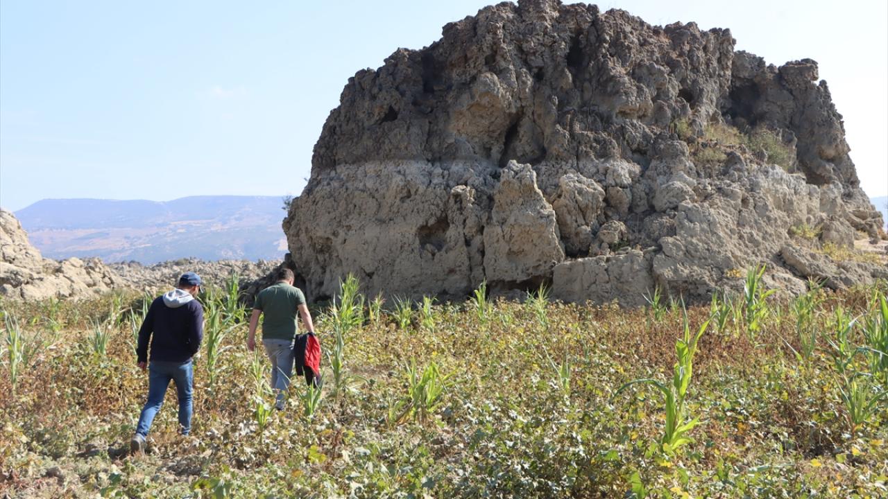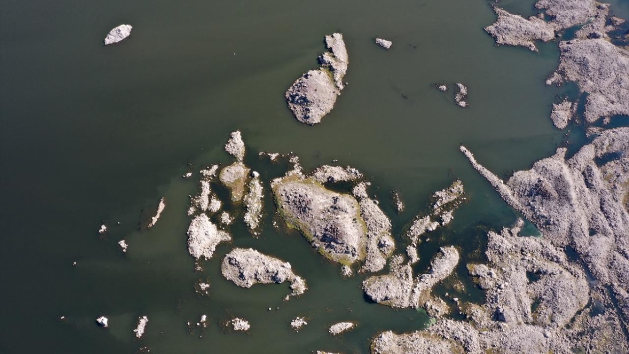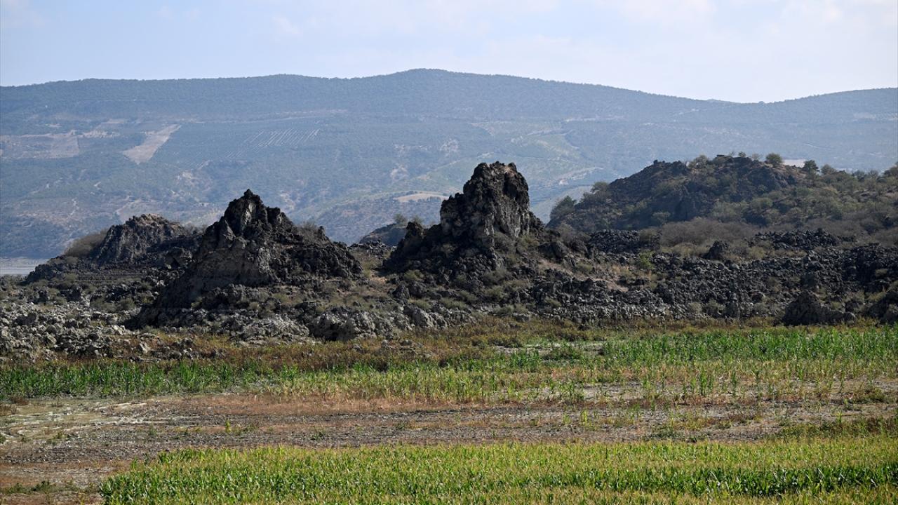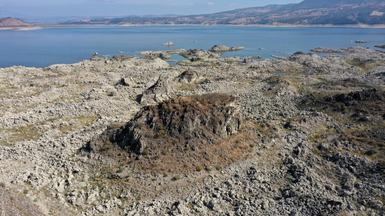 Suların çekilmesiyle baraj kıyısında ilginç görüntünün oluştuğunu dile getiren Karakuzu, "Koyu renkli lavlar, baraj yapılınca sular altında kaldı. Daha sonra suları çekilen baraj bize bu görüntüyü sundu. Çok ilgi çekici olduğu için meraklıları fotoğraf çekmeye buraya geliyor." diye konuştu.