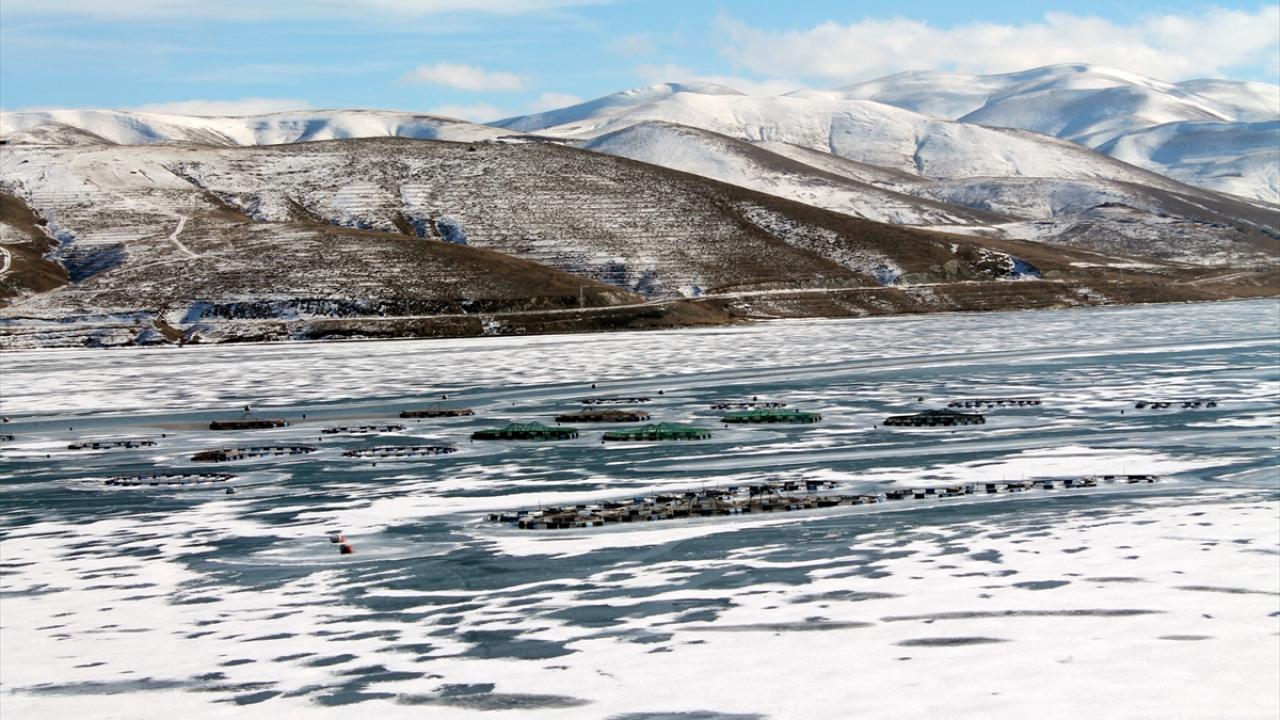 Kafes balıkçılığının yapıldığı baraj gölündeki balık kafesleri, buz kütlesinin altında kaldı.