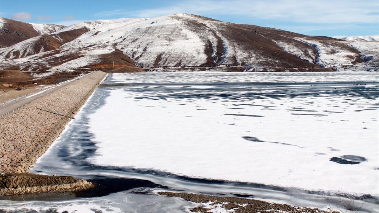 Bayburt'ta dondurucu soğuklar nedeniyle Demirözü Barajı gölünün yüzeyi buzla kaplandı.