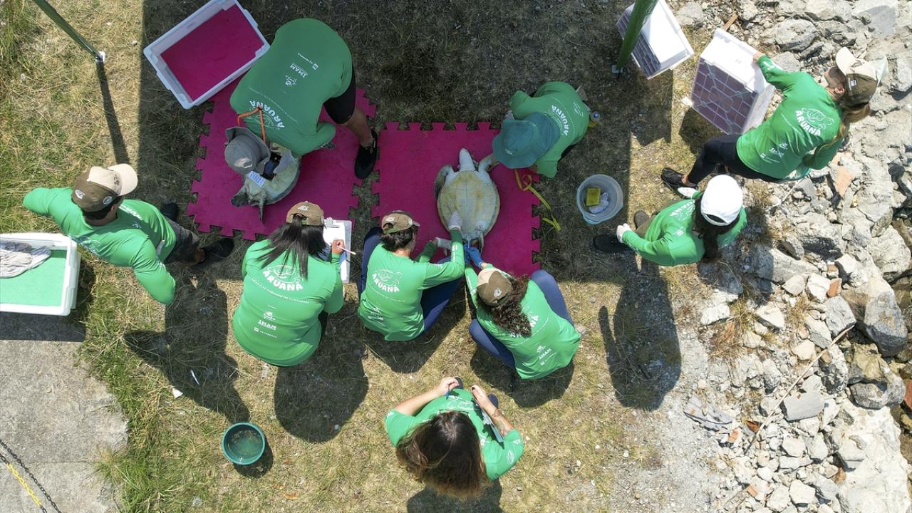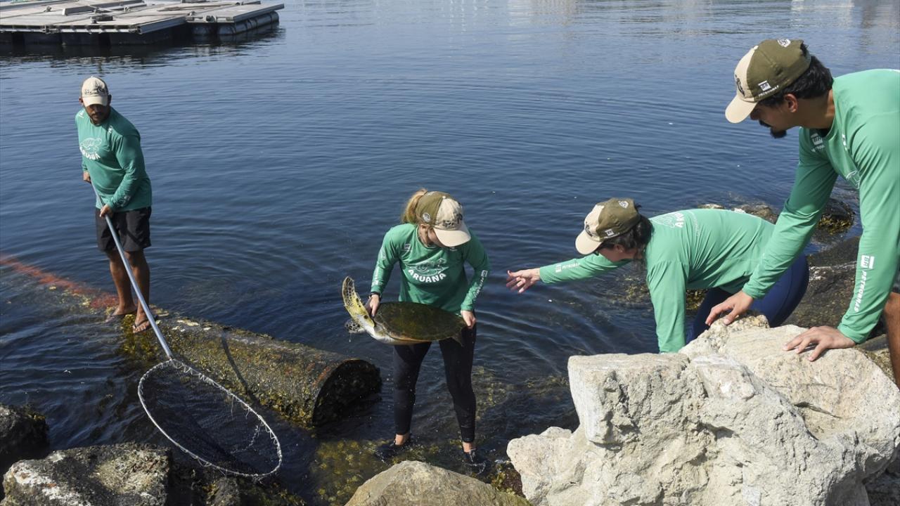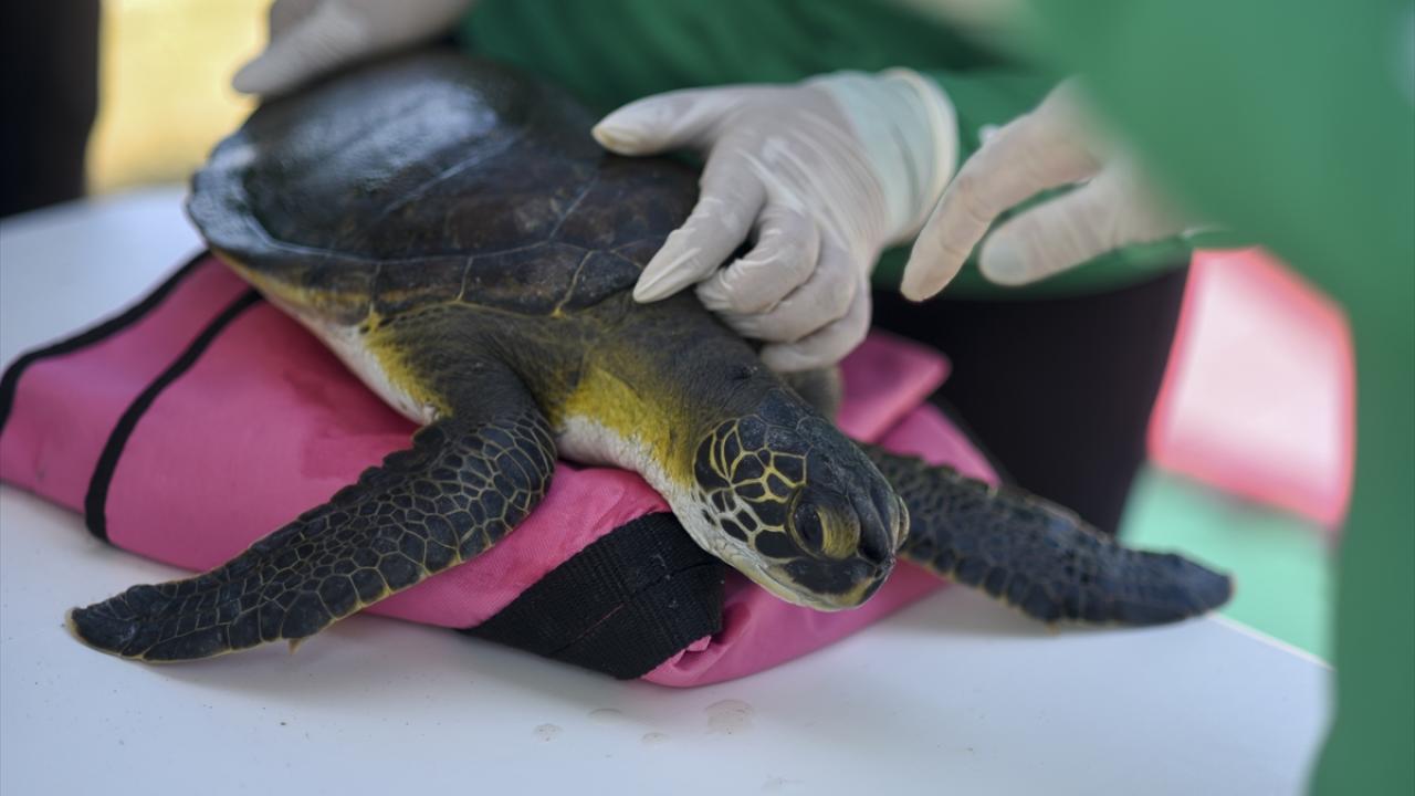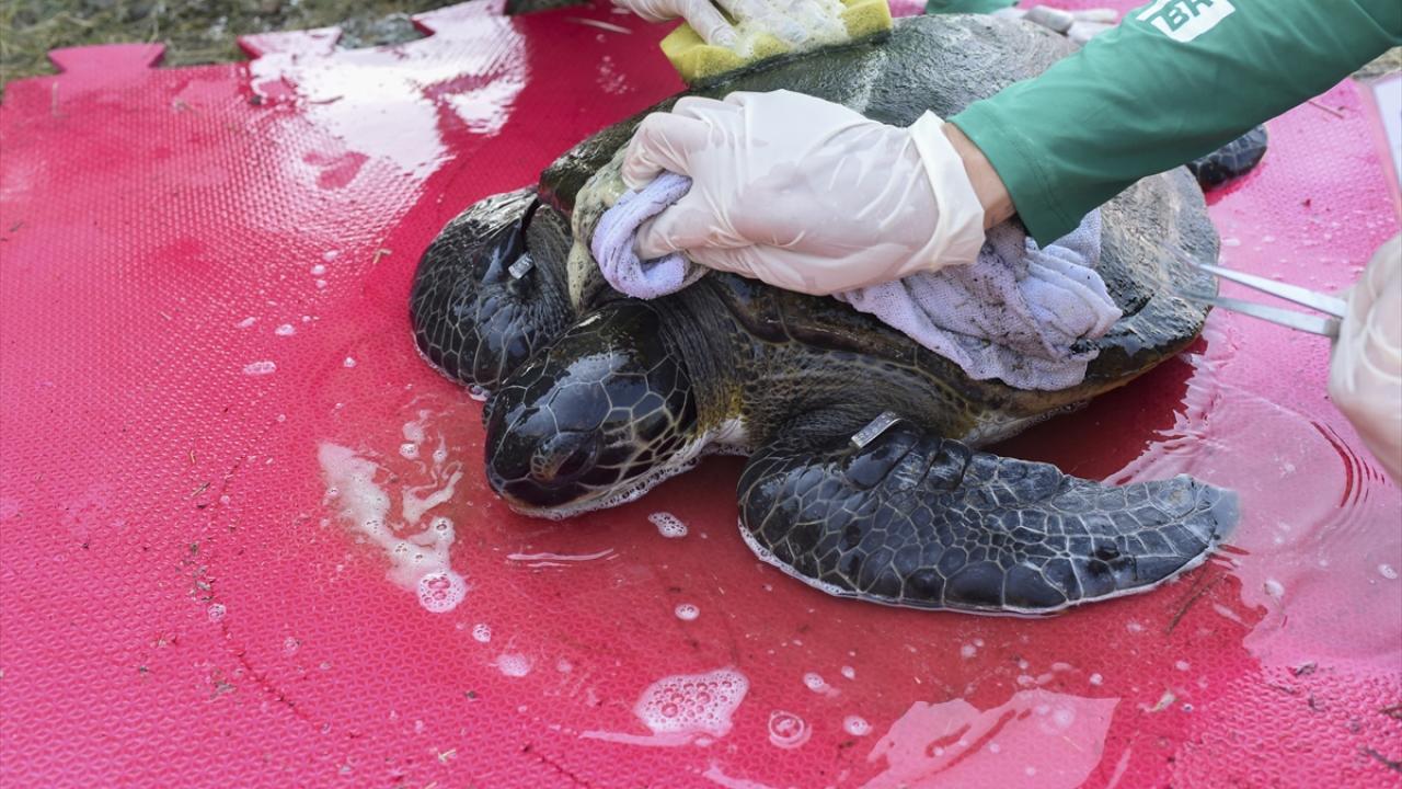 Kan testleri yapılıp, kalp atışları ve hayati fonksiyonları kontrol edilen kaplumbağalar, temizlenip bakımları yapıldıktan sonra denize döndürülüyor.