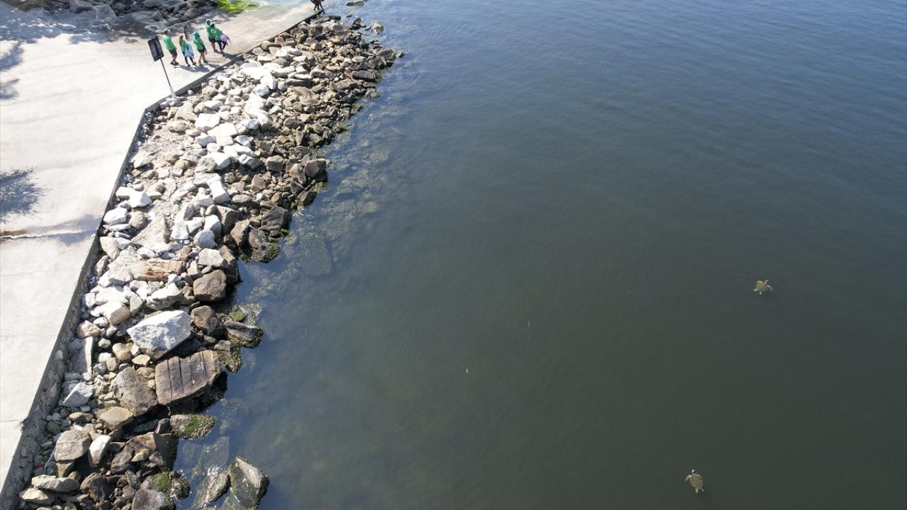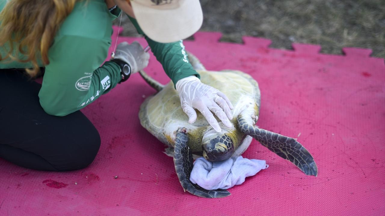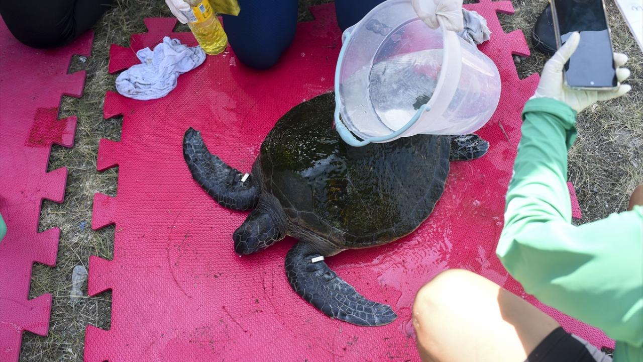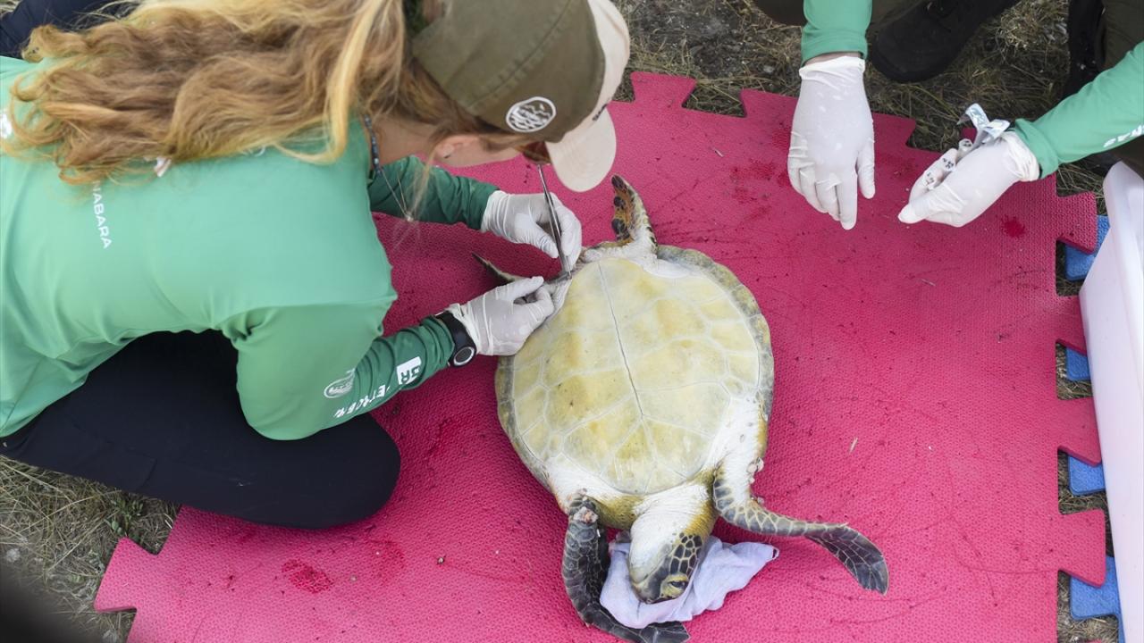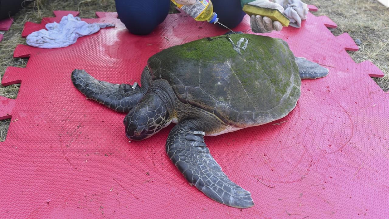 Kan testleri yapılıp, kalp atışları ve hayati fonksiyonları kontrol edilen kaplumbağalar, temizlenip bakımları yapıldıktan sonra denize döndürülüyor.
