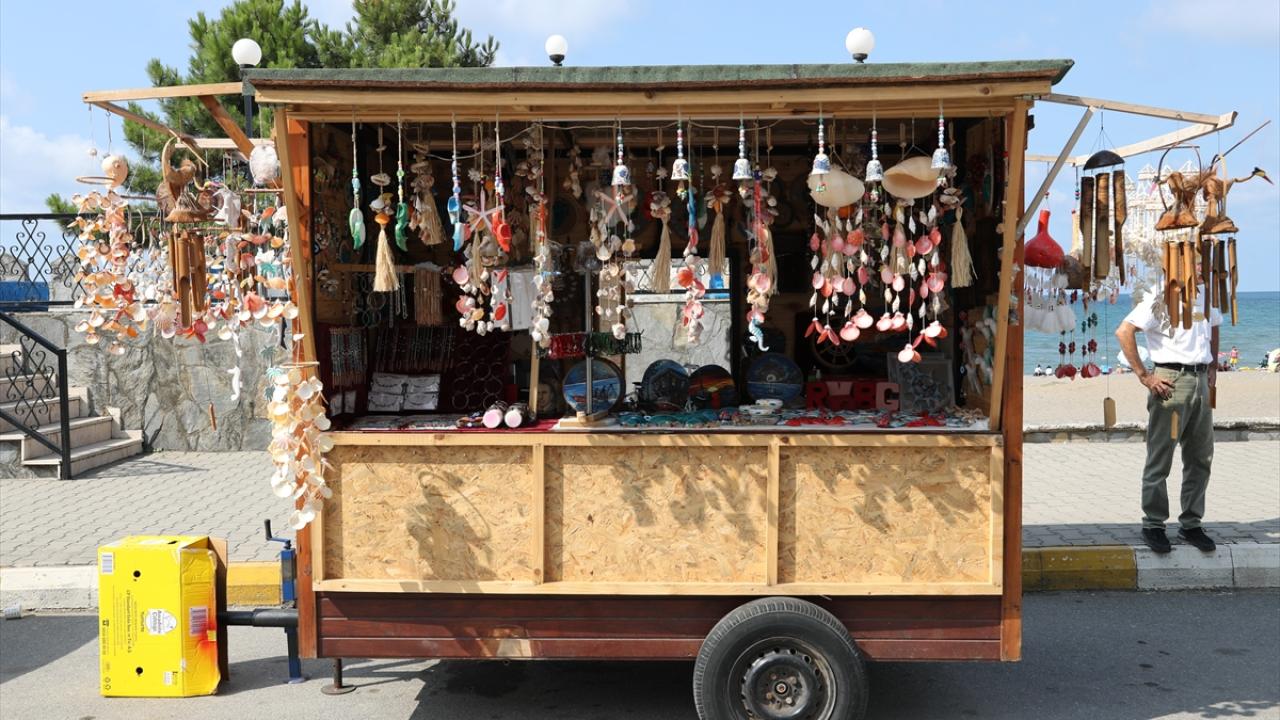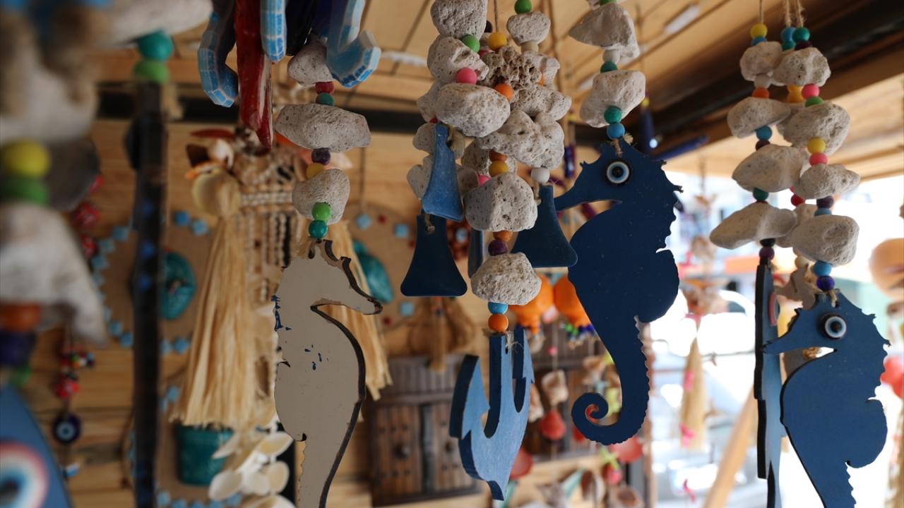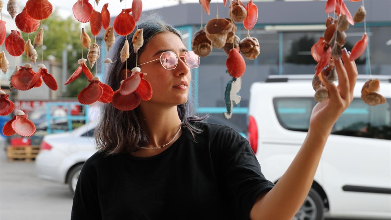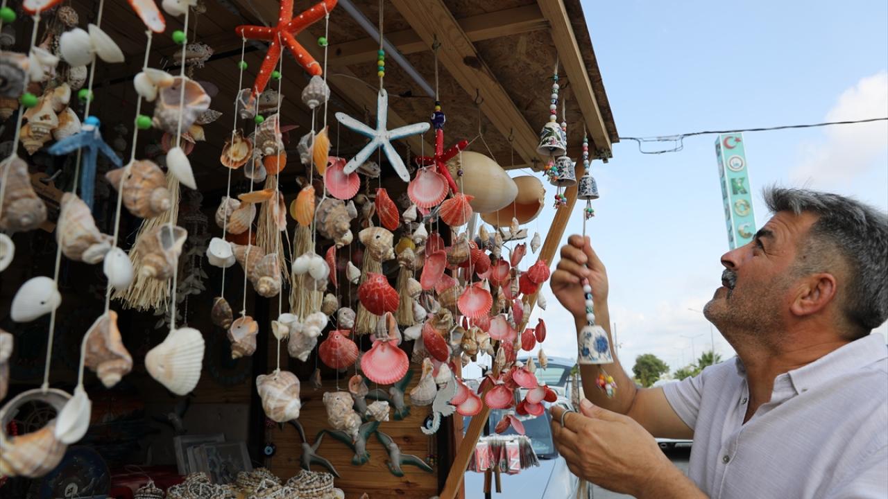 Sahilden topladığı deniz kabuklarından süs eşyası üreten, ahşap malzemeleri çeşitli hediyelik ürünlere dönüştüren Deniz, bunları seyyar tezgahında satıyor.