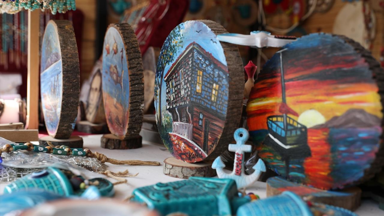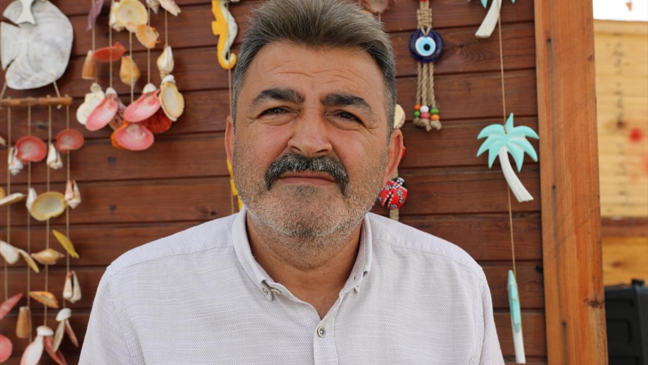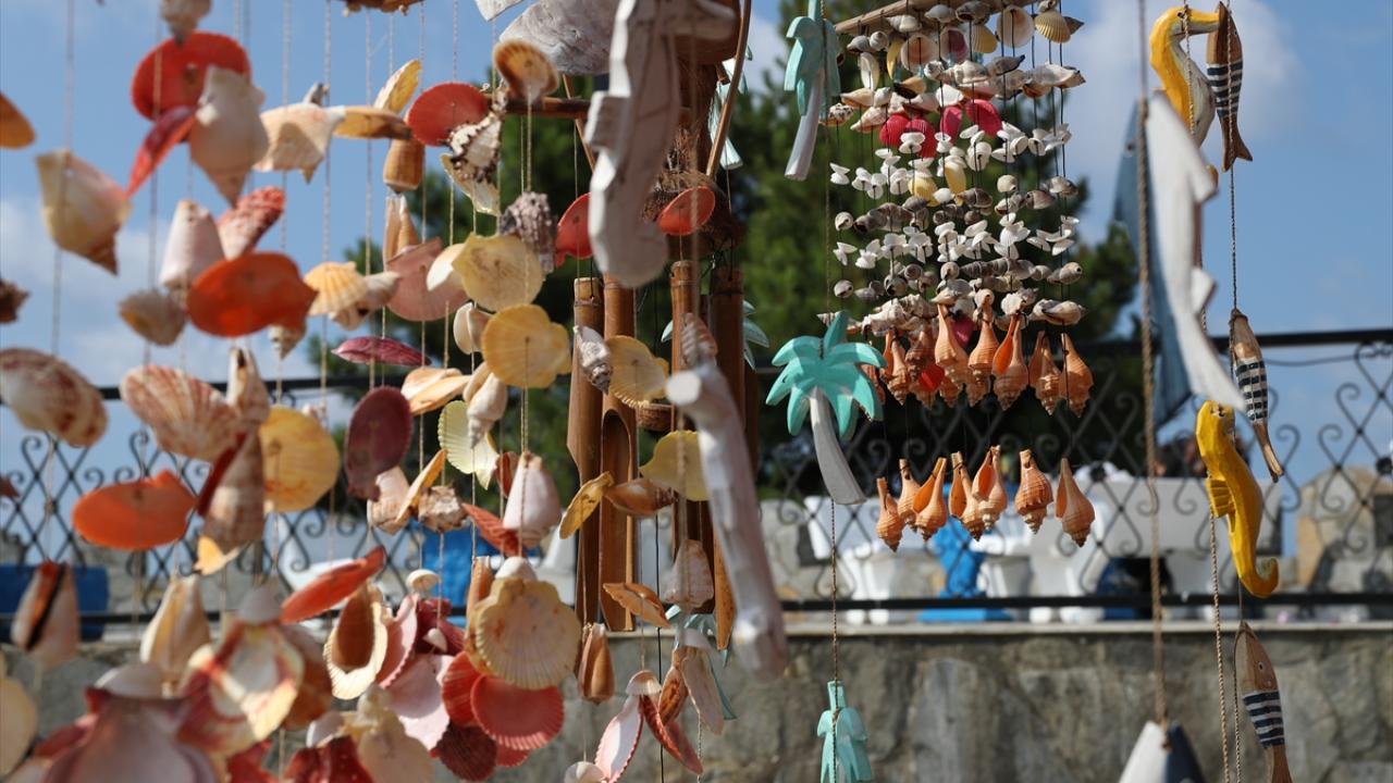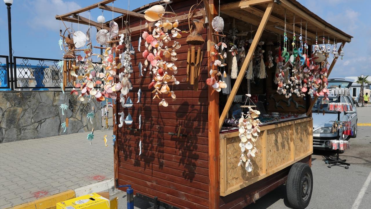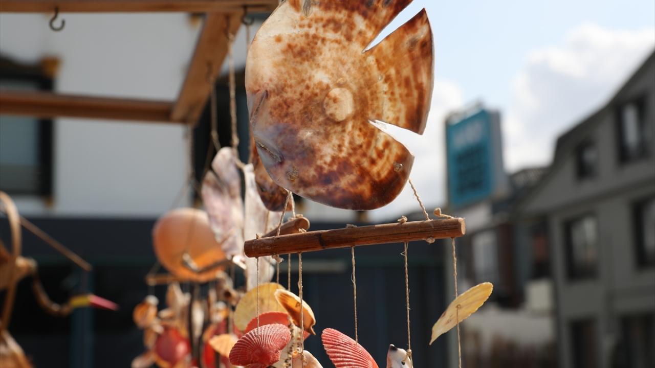 Sahilden topladığı deniz kabuklarından süs eşyası üreten, ahşap malzemeleri çeşitli hediyelik ürünlere dönüştüren Deniz, bunları seyyar tezgahında satıyor.