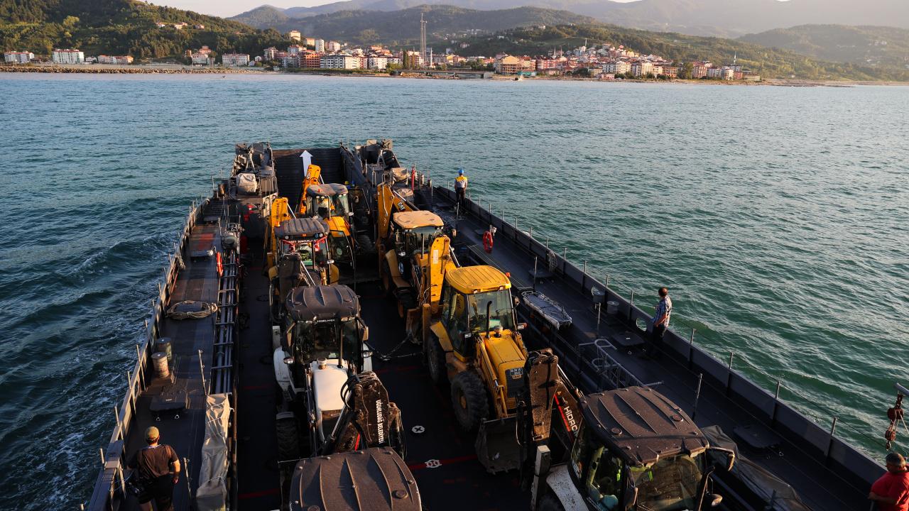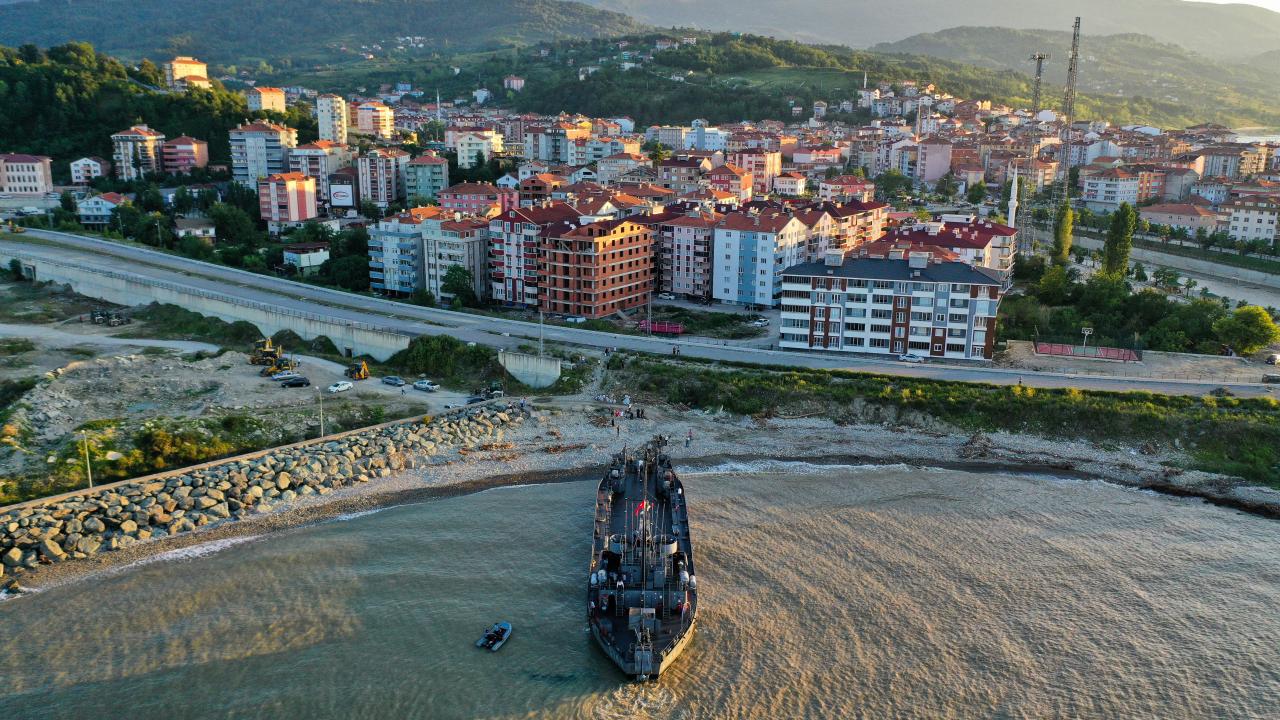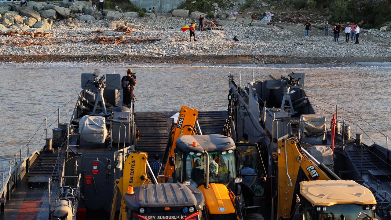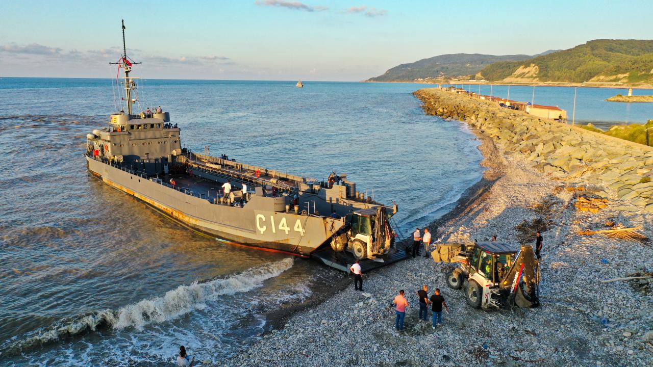 Sel bölgesinde kullanılacak iş makinelerini taşıyan Deniz Kuvvetleri Komutanlığı'nın çıkarma gemisi, Sinop'un Türkeli ilçesinde vatandaşlar tarafından Türk bayraklarıyla karşılandı.