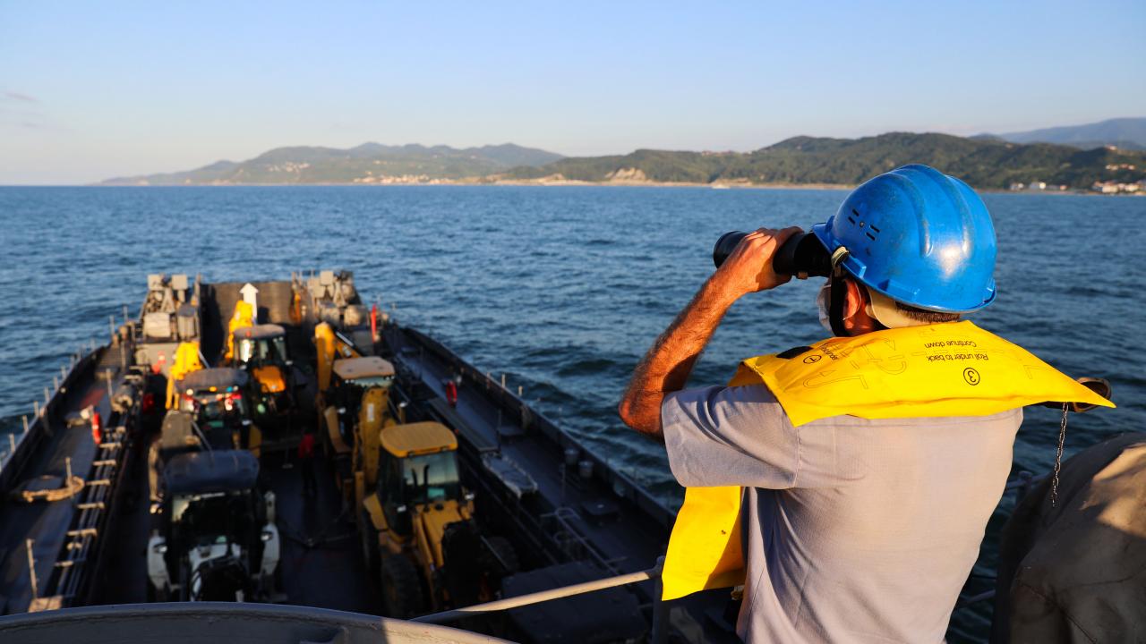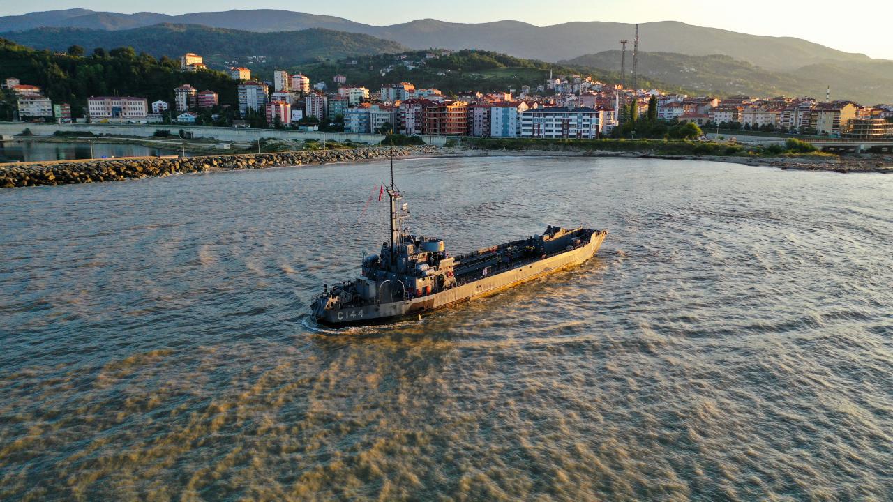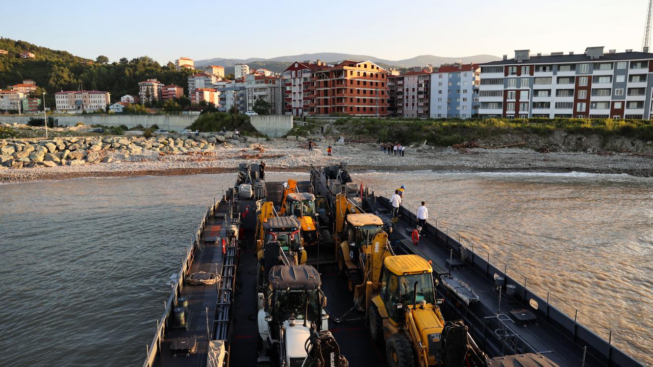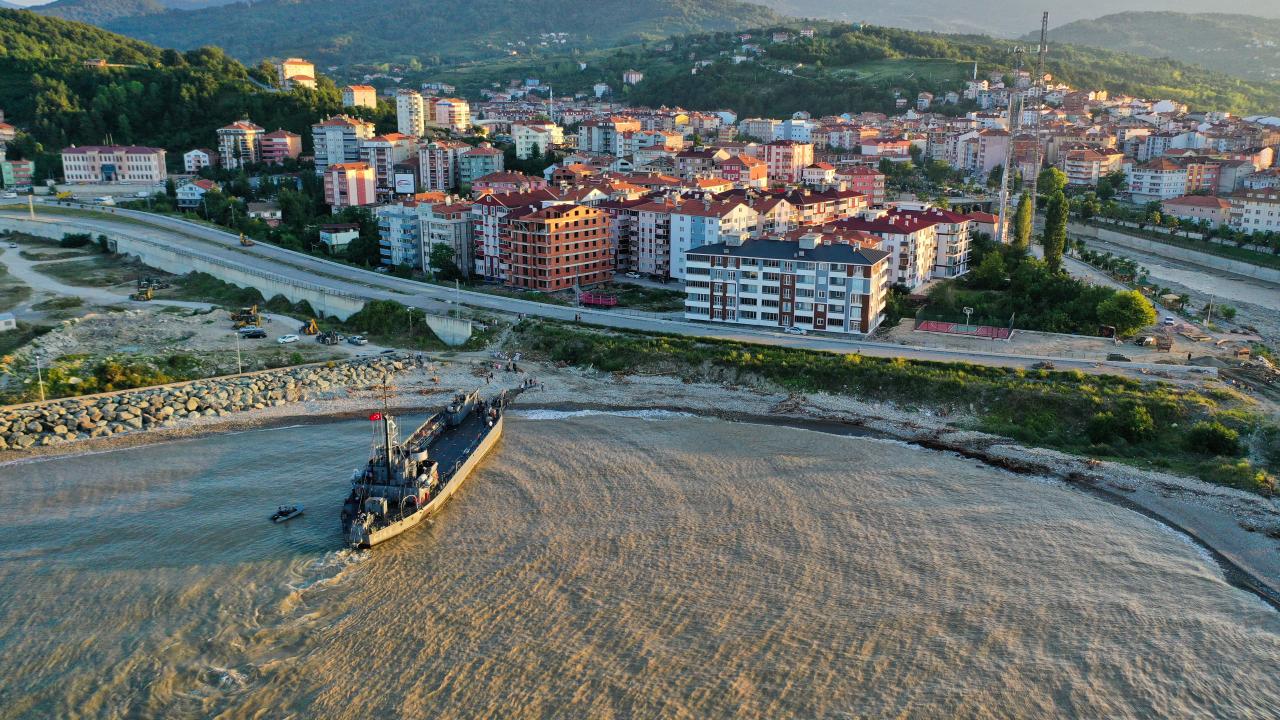 Sel bölgesinde kullanılacak iş makinelerini taşıyan Deniz Kuvvetleri Komutanlığı'nın çıkarma gemisi, Sinop'un Türkeli ilçesinde vatandaşlar tarafından Türk bayraklarıyla karşılandı.