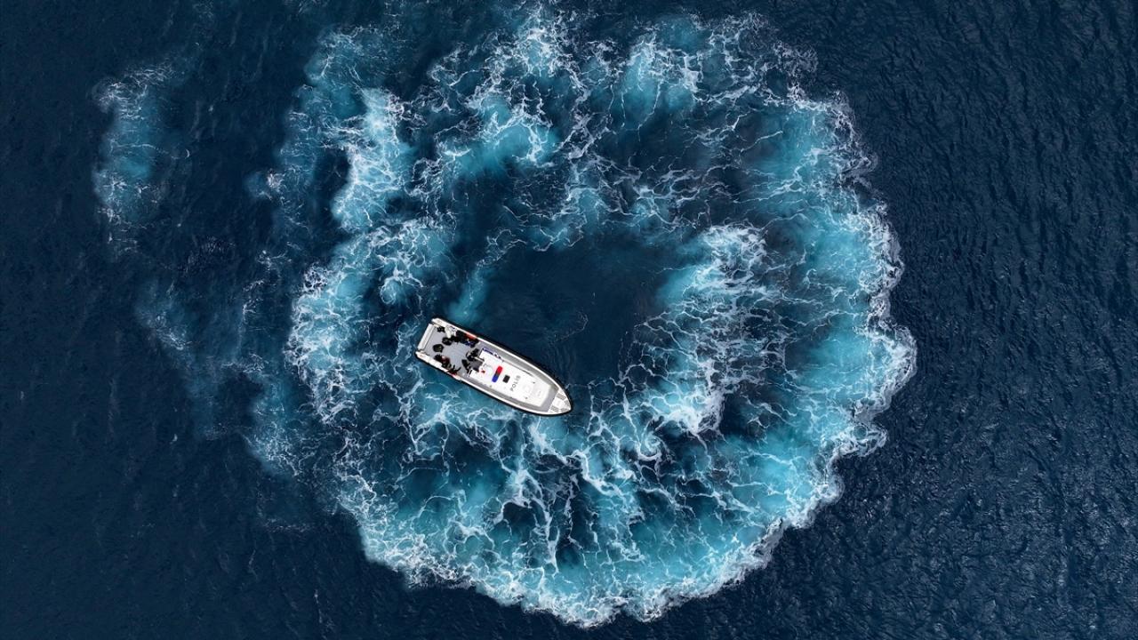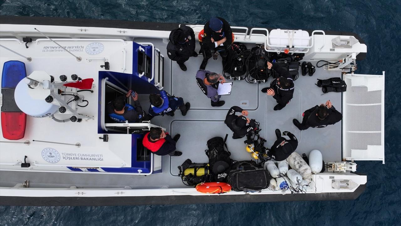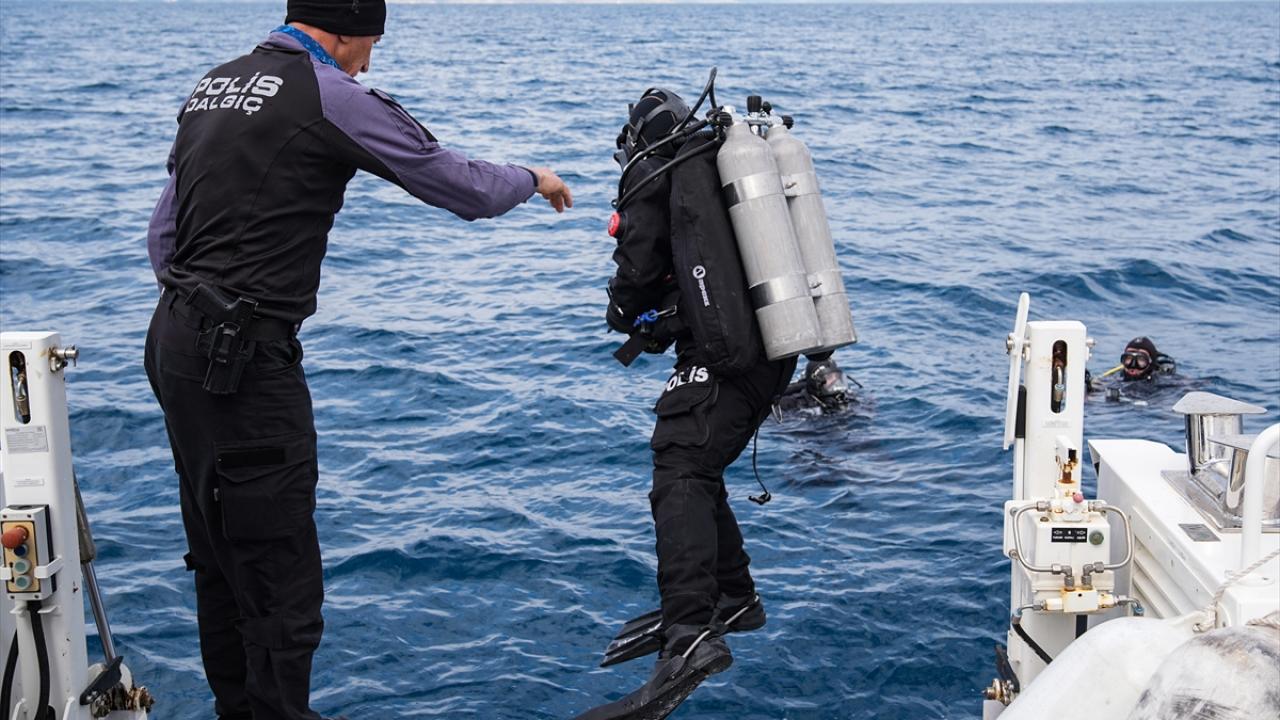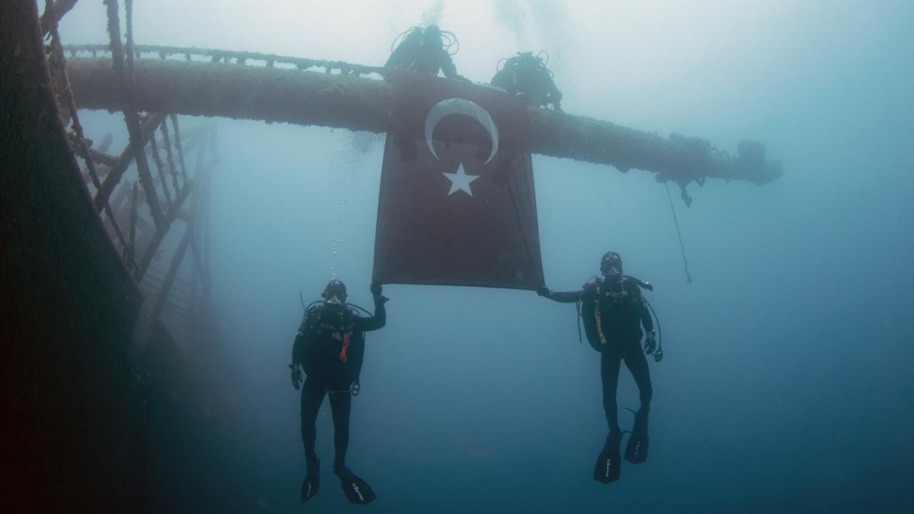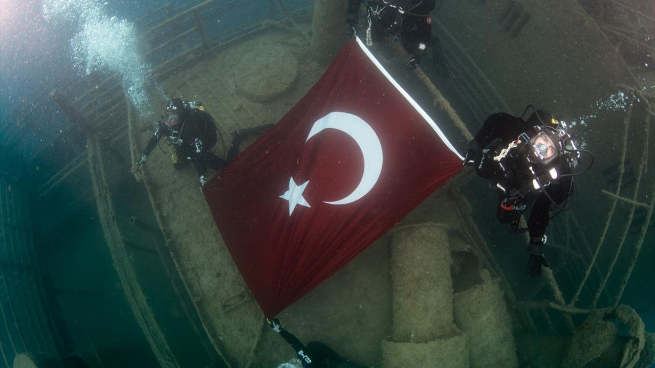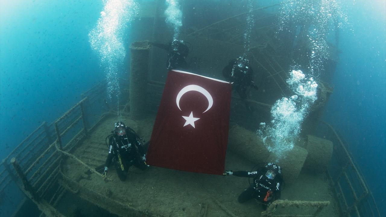 Suyun altında Türk bayrağı açarak Türk Polis Teşkilatının 181`inci kuruluş yıl dönümü kutlamalarını denizin derinliklerine taşıyan kurbağa adamların çalışması Anadolu Ajansı (AA) ekibince su altından ve dronla havadan görüntülendi.
