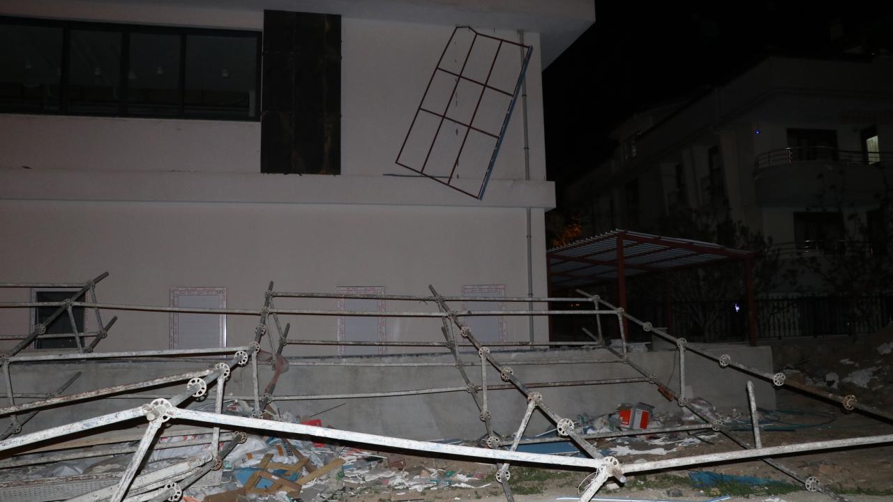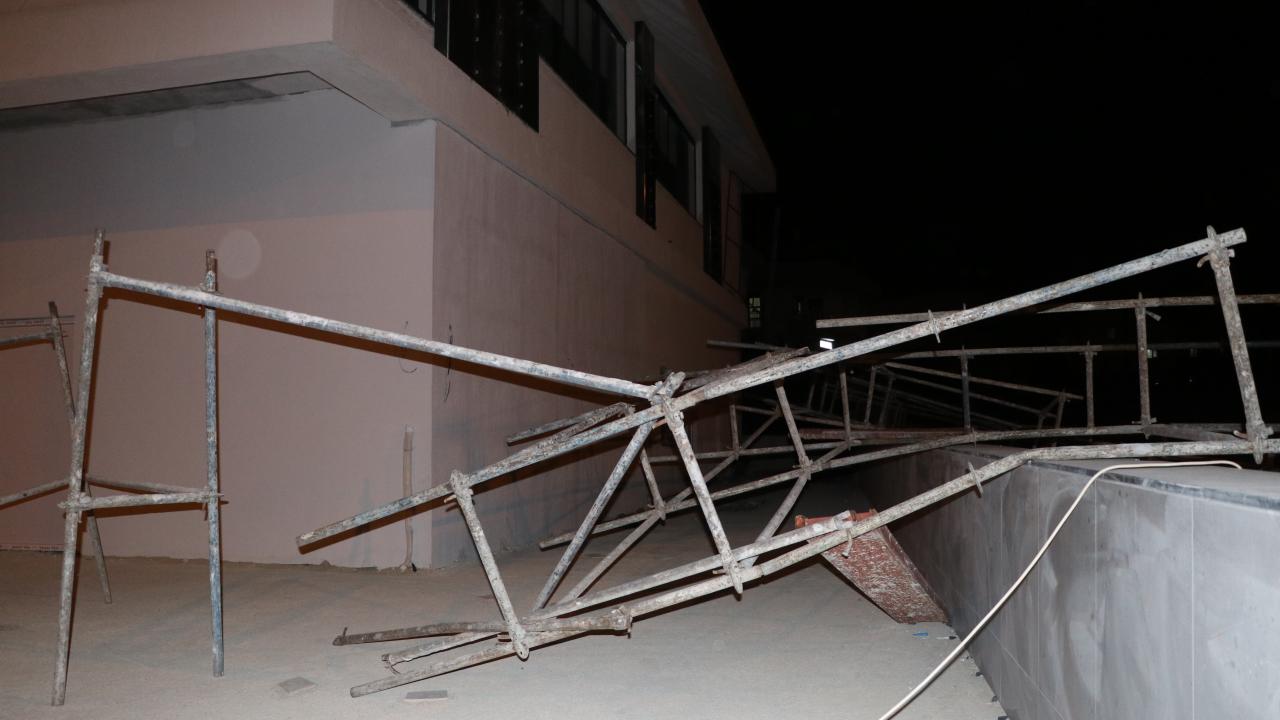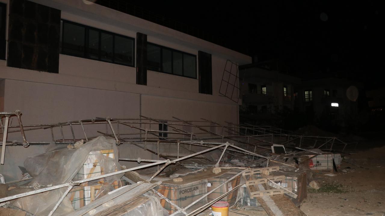 Yine aynı ilçenin Şehit Öğretmen Yusuf Batur Caddesi`nde inşaatı devam eden bir binaya kurulan demir iskele yan tarafta bulunan boş arsaya yıkıldı.