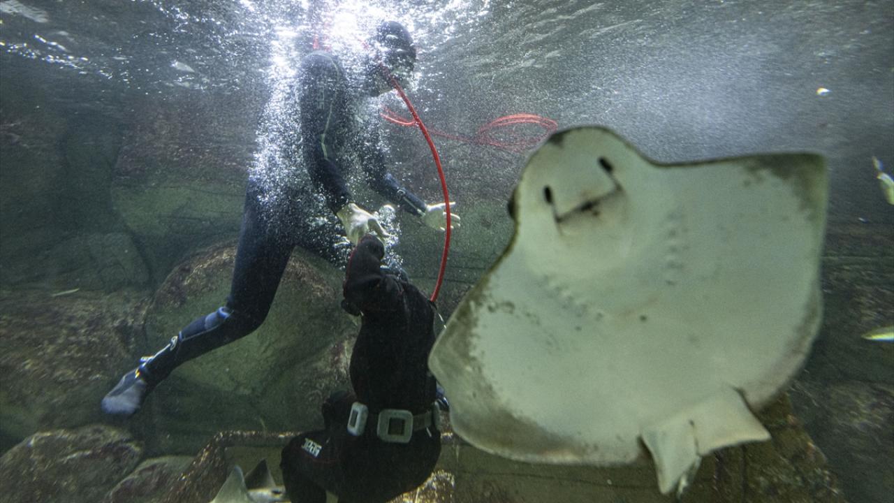 Sanayi dalgıçları, akvaryum temizliğinin yanı sıra düzenli aralıklarla dalış yaparak tehlikeli deniz canlılarından sayılan vatoz ve köpekbalıklarını elleriyle besliyor.