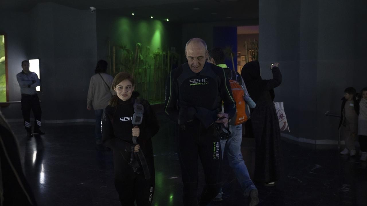 Önce akvaryumdaki teknik işlerden sorumlu olduğunu anlatan Sürek, zamanla dalış yaparak balıkların beslenmesine yardım ettiğini anlattı.