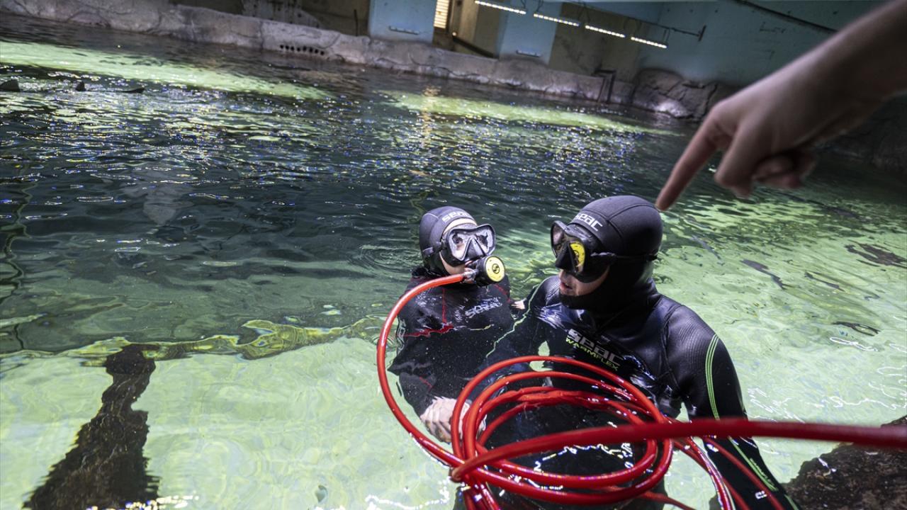Ankara`da büyük bir akvaryumda görev yapan sanayi dalgıçları, su altı yaşamının tehlikeli türleriyle ilgileniyor.