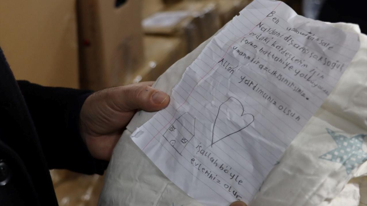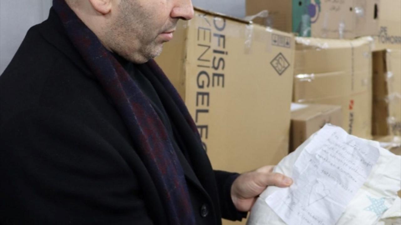 Başta giyim olmak üzere ısıtıcı, gıda, temizlik ve ihtiyaç malzemelerinin bulunduğu yardımları teslim alan görevliler, üzerlerinde notların bulunduğu çok sayıda paketle karşılaştı.