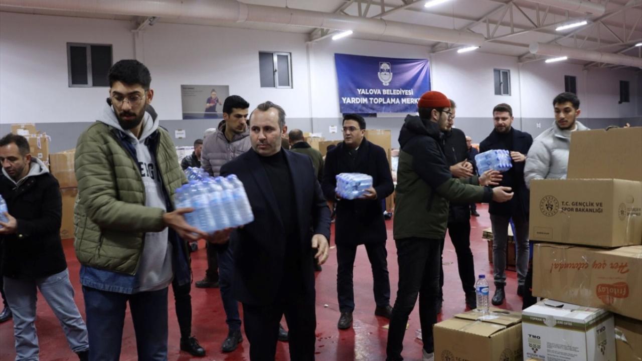 Kahramanmaraş merkezli, 10 ili etkileyen 7,7 ve 7,6 büyüklüğündeki depremlerin ardından bölgeye gönderilmek üzere Yalova ve ilçelerde oluşturulan birçok noktaya giden vatandaşlar yardım paketlerini görevlilere teslim ediyor.