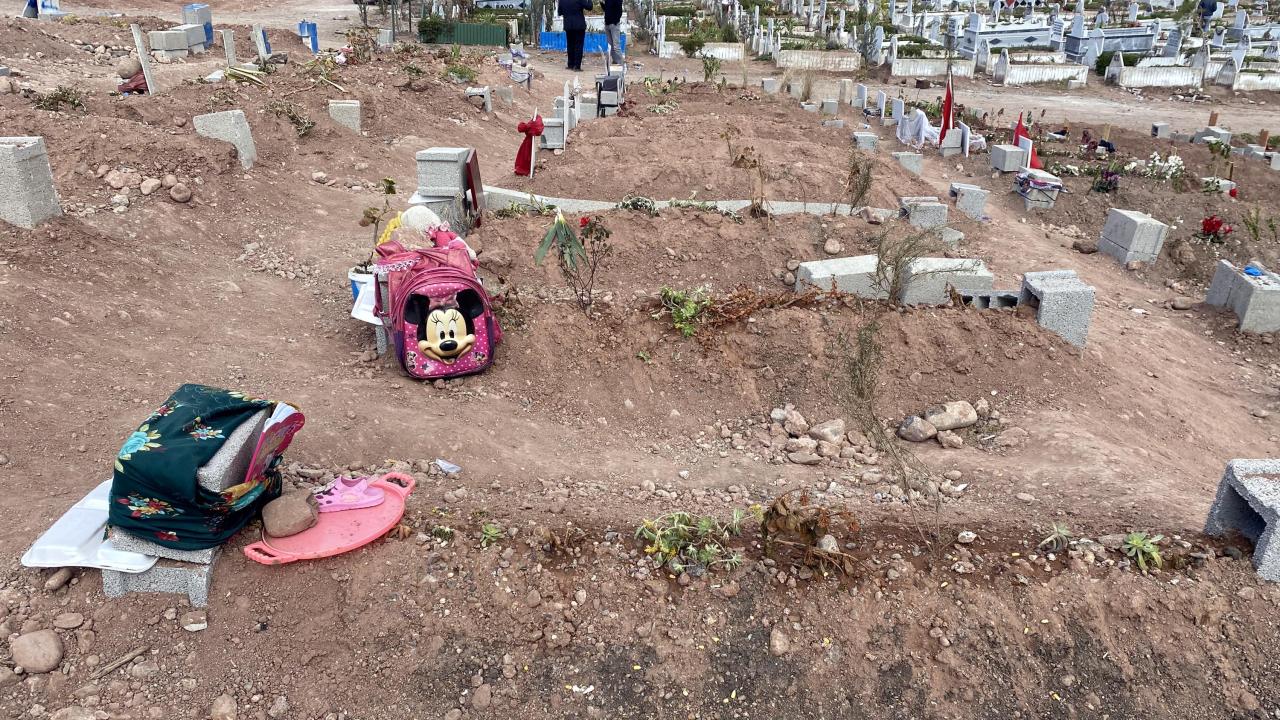 Depremde hayatını kaybedenlerin mezarlarının üzerine konulan eşyalar ise görenleri duygulandırıyor.