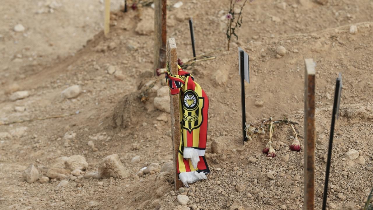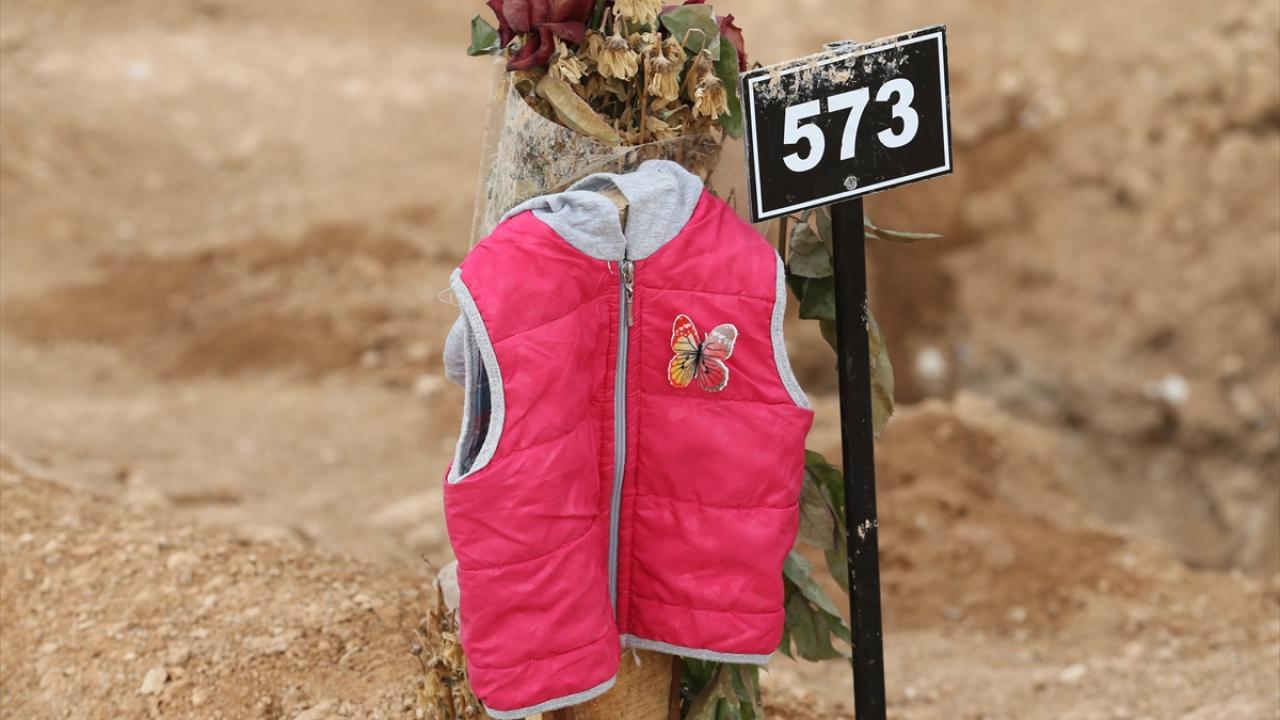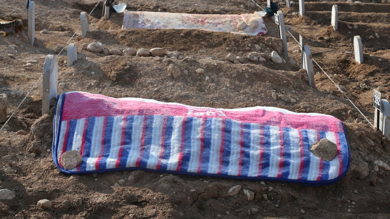 Defnedilen depremzedelerin mezarlarına gelinlik, duvak, çocuk terliği, Türk bayrağı, okul çantası ve oyuncak bırakıldığı görüldü.