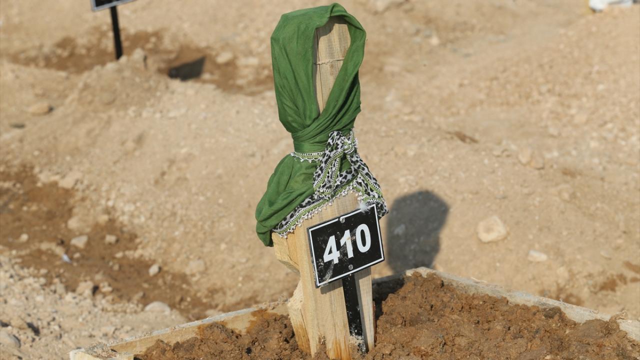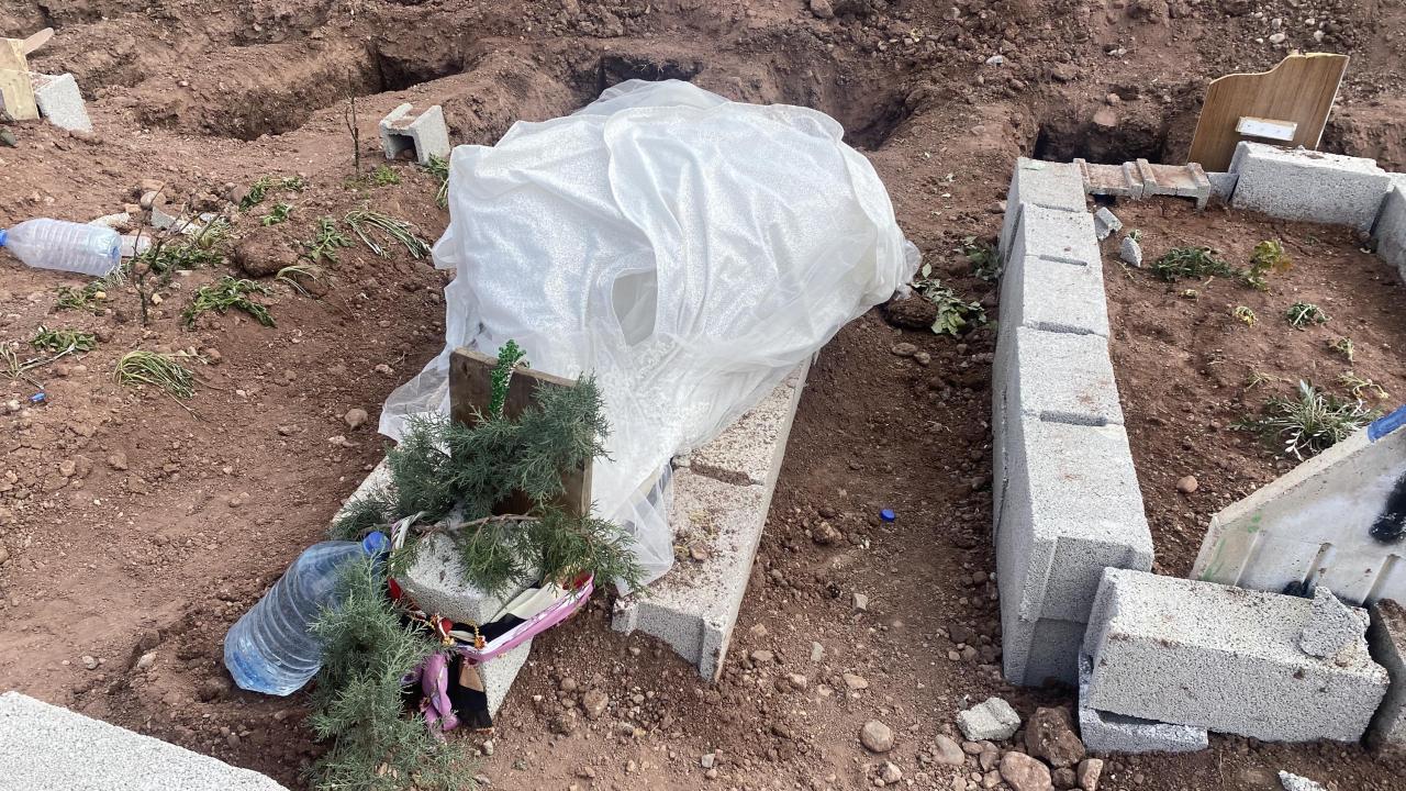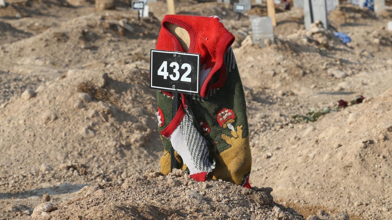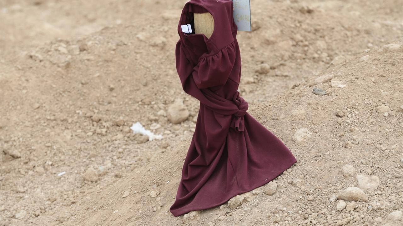 Defnedilen depremzedelerin mezarlarına gelinlik, duvak, çocuk terliği, Türk bayrağı, okul çantası ve oyuncak bırakıldığı görüldü.