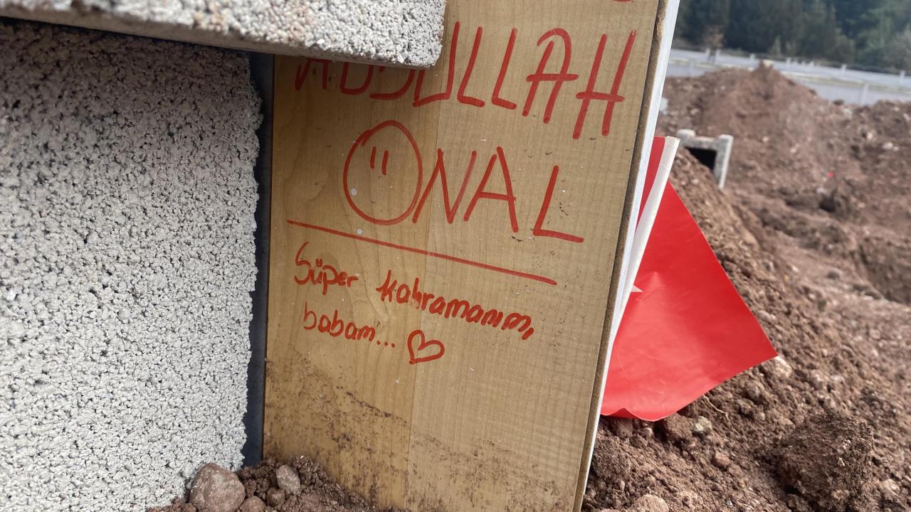 Hayatını kaybeden Abdullah Önal`ın mezarının başına yerleştirilen ahşaba, çocuğunun `Süper kahramanım, babam` yazması dikkat çekti.