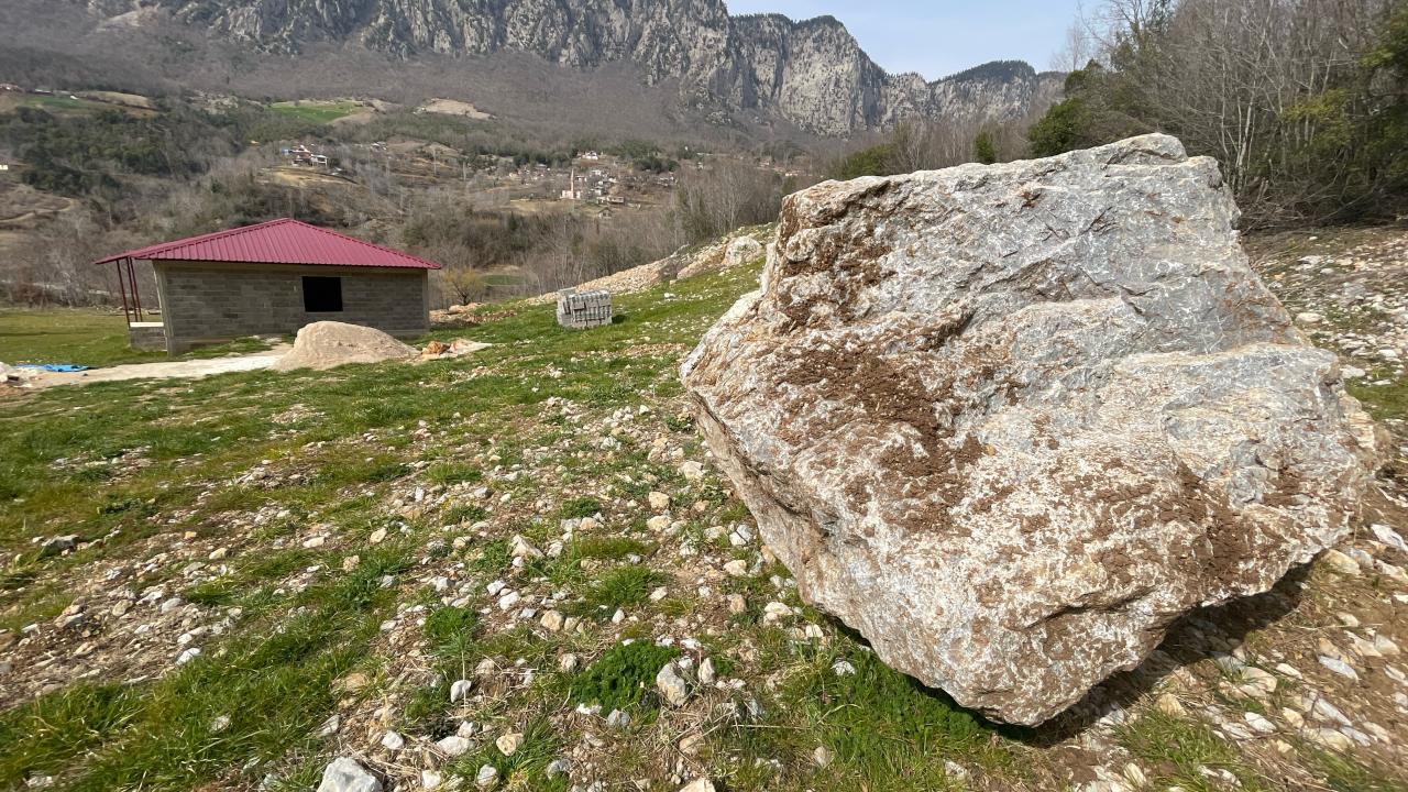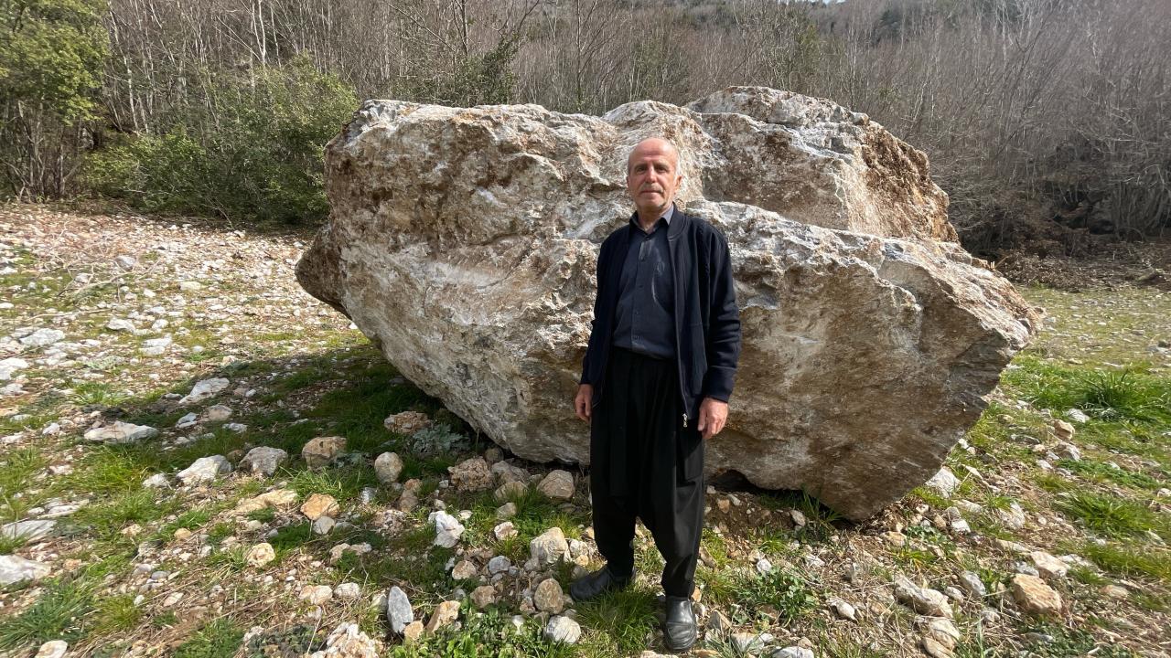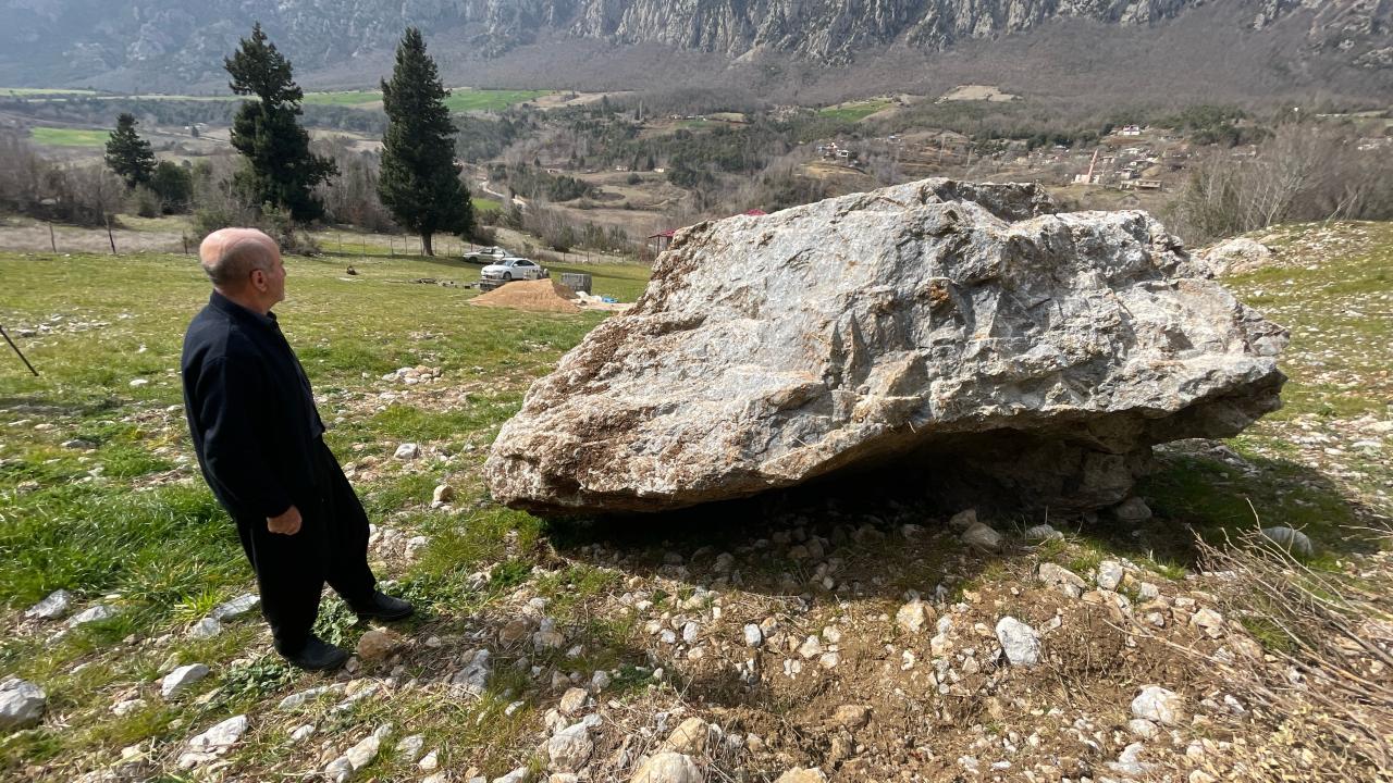 Osmaniye'nin Sumbas ilçesinde, 6 Şubat'ta meydana gelen depremlerde yerinden koparak vadideki Esenli köyüne doğru yuvarlanan kaya, bir eve 20 metre kala durdu.