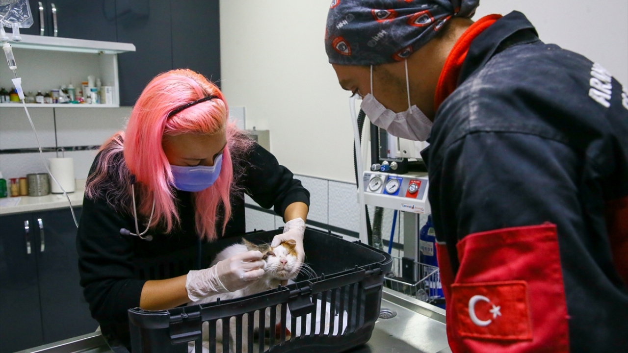 İzmir'deki depremde yerle bir olan apartmanların enkazında arama kurtarma ekiplerinin bulduğu iki kediden biri tedavi altına alındı, diğeri sahibine teslim edildi.