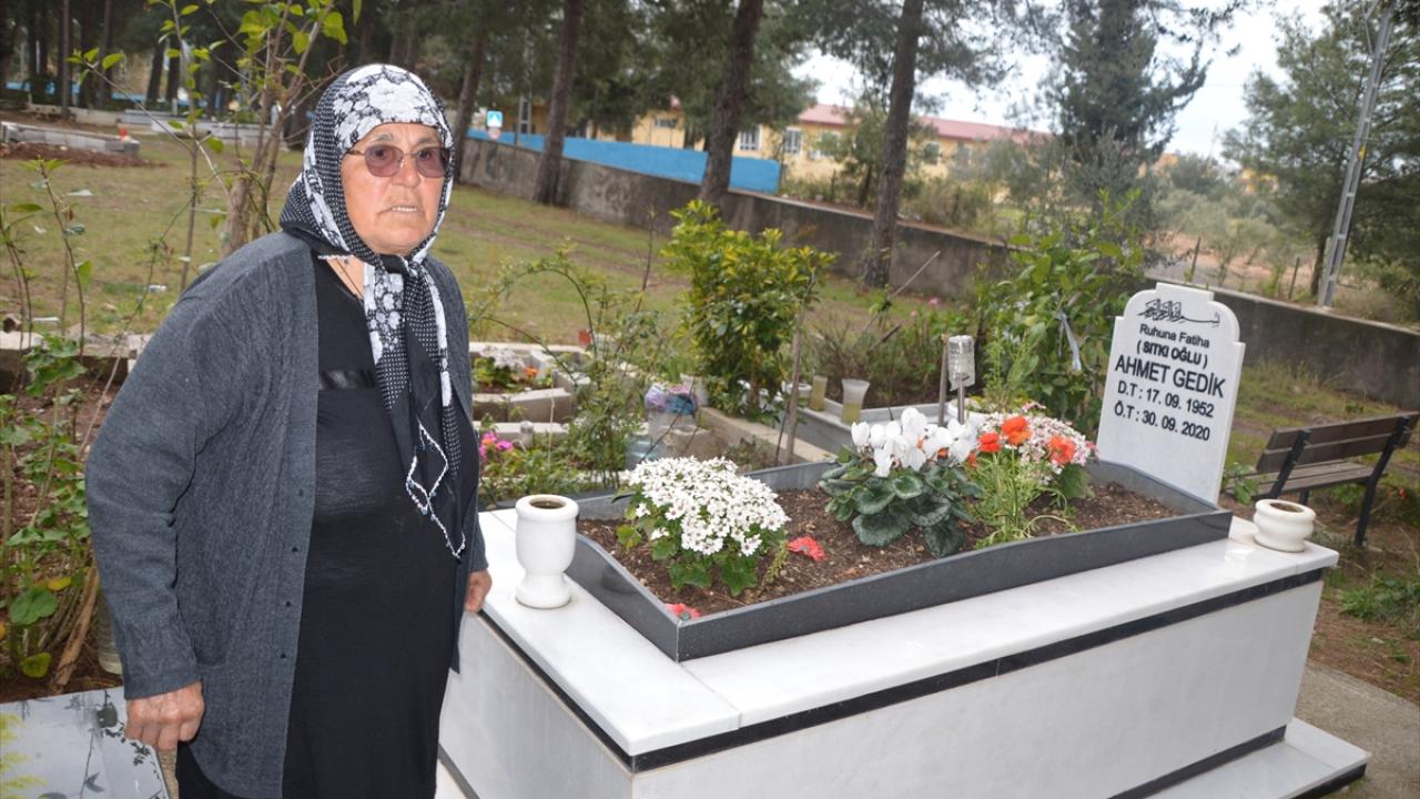 Covid-19 salgını nedeniyle 2020`de vefat eden eşi Ahmet Gedik, oğlu, kızı ve torununun mezarlarını her gün ziyaret eden Hatice Gedik, gözyaşı döküyor.