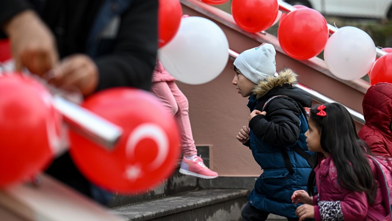 Okullarının merdivenini Türk bayraklı balonlarla süsleyen Tufanpaşa İlköğretim Okulu`ndaki öğrenciler, saygı duruşu ve İstiklal Marşı`nın okunmasının ardından sınıflara alındı.