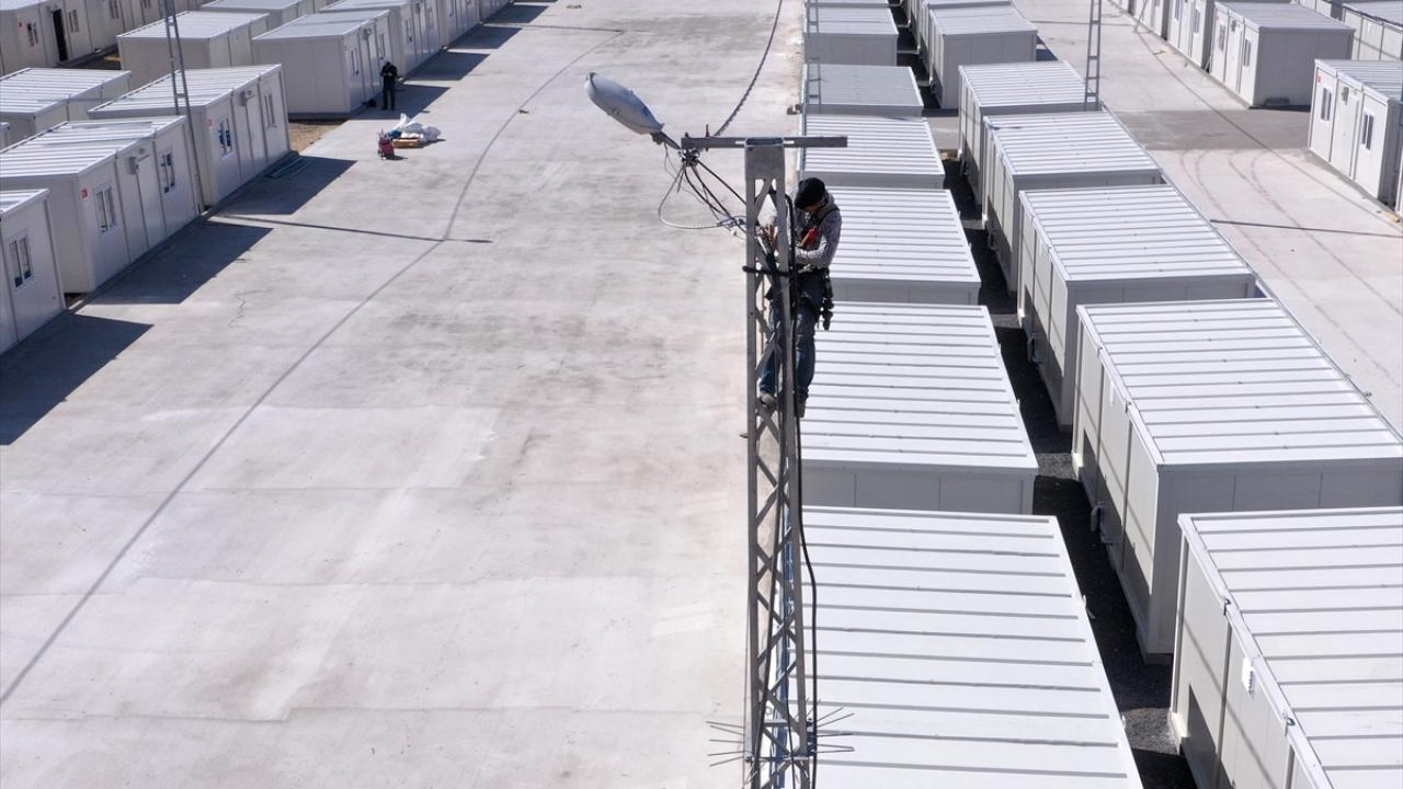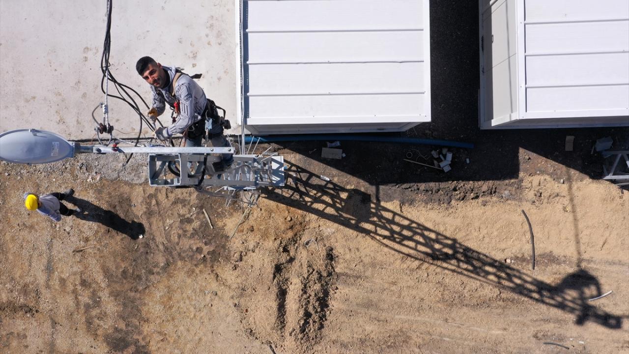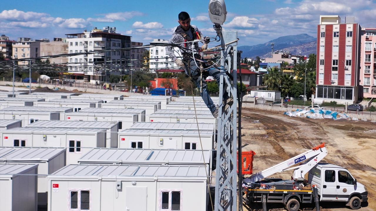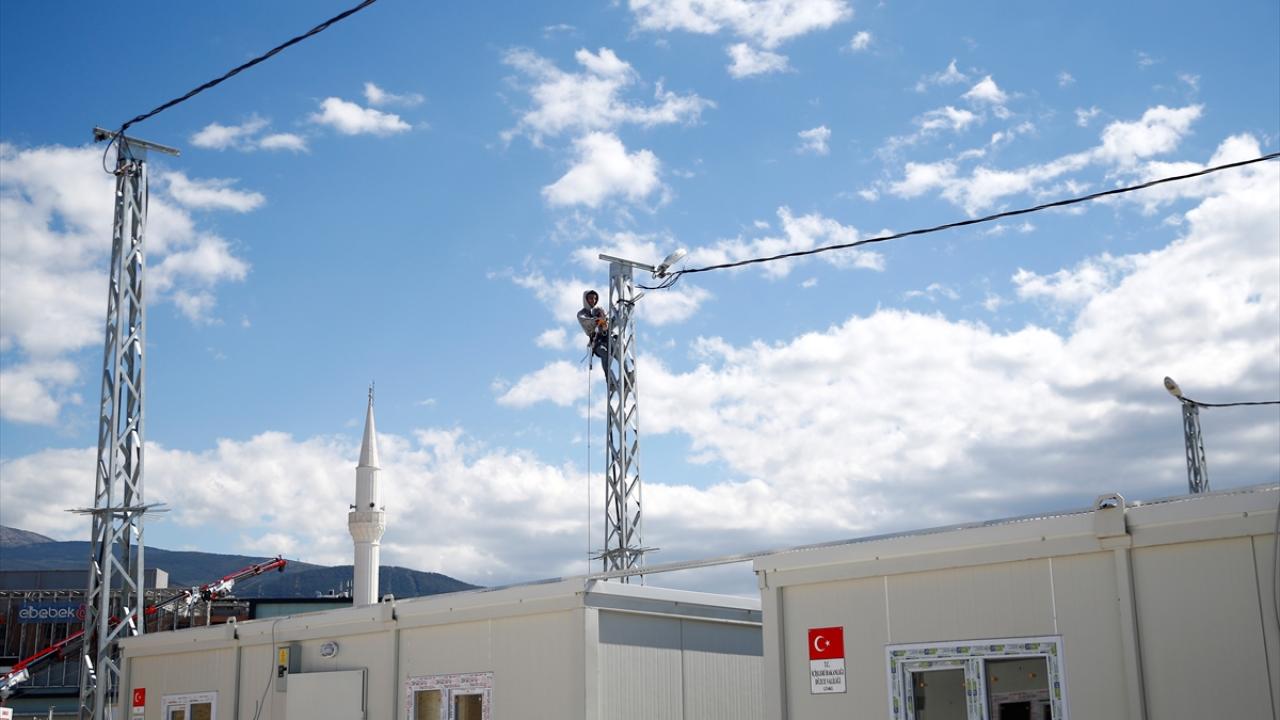 Kahramanmaraş merkezli depremlerden sağ kurtulan elektrik ustası Ali Alyanak, Hatay'ın İskenderun ilçesinde, depremzedelerin barınması için yapımı süren konteyner kentlerin aydınlatılması için çalışıyor.