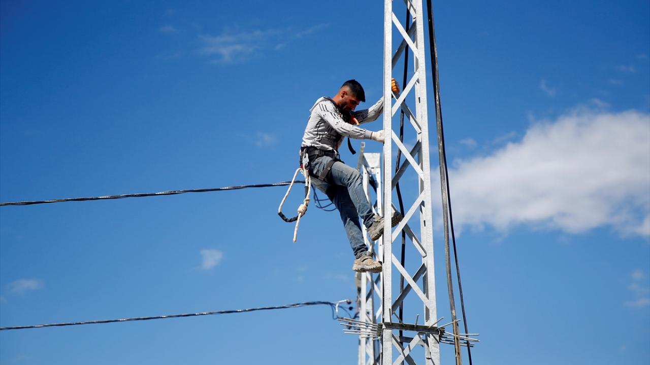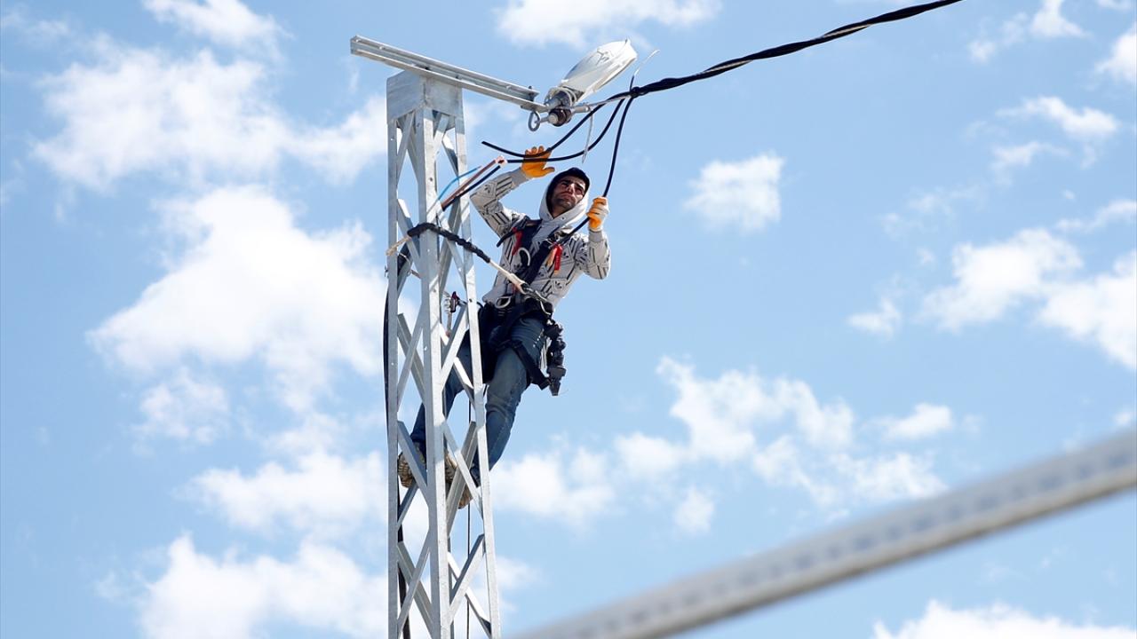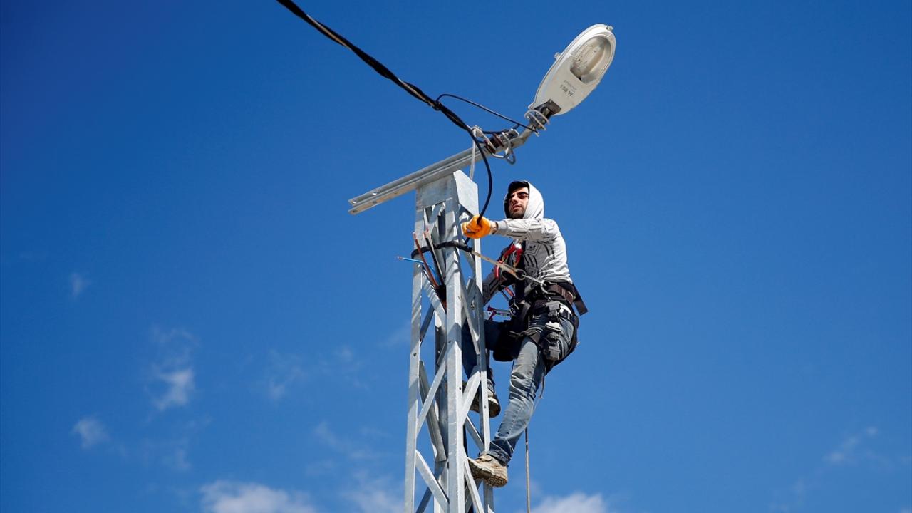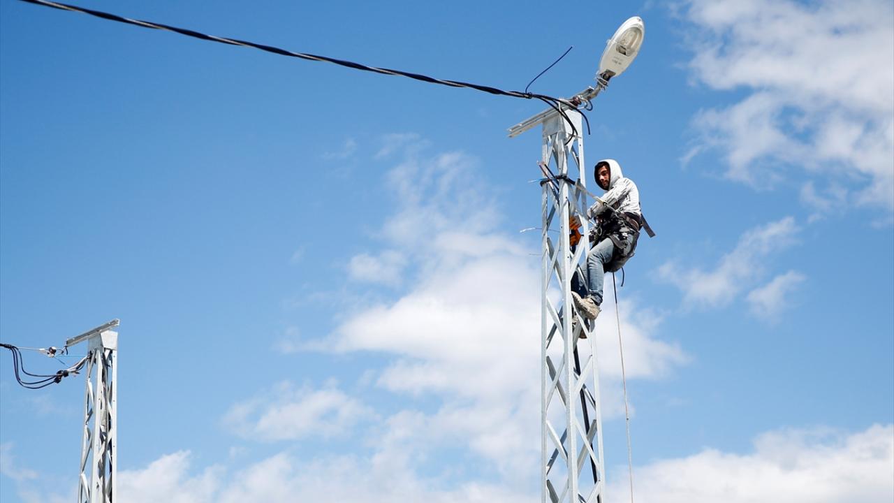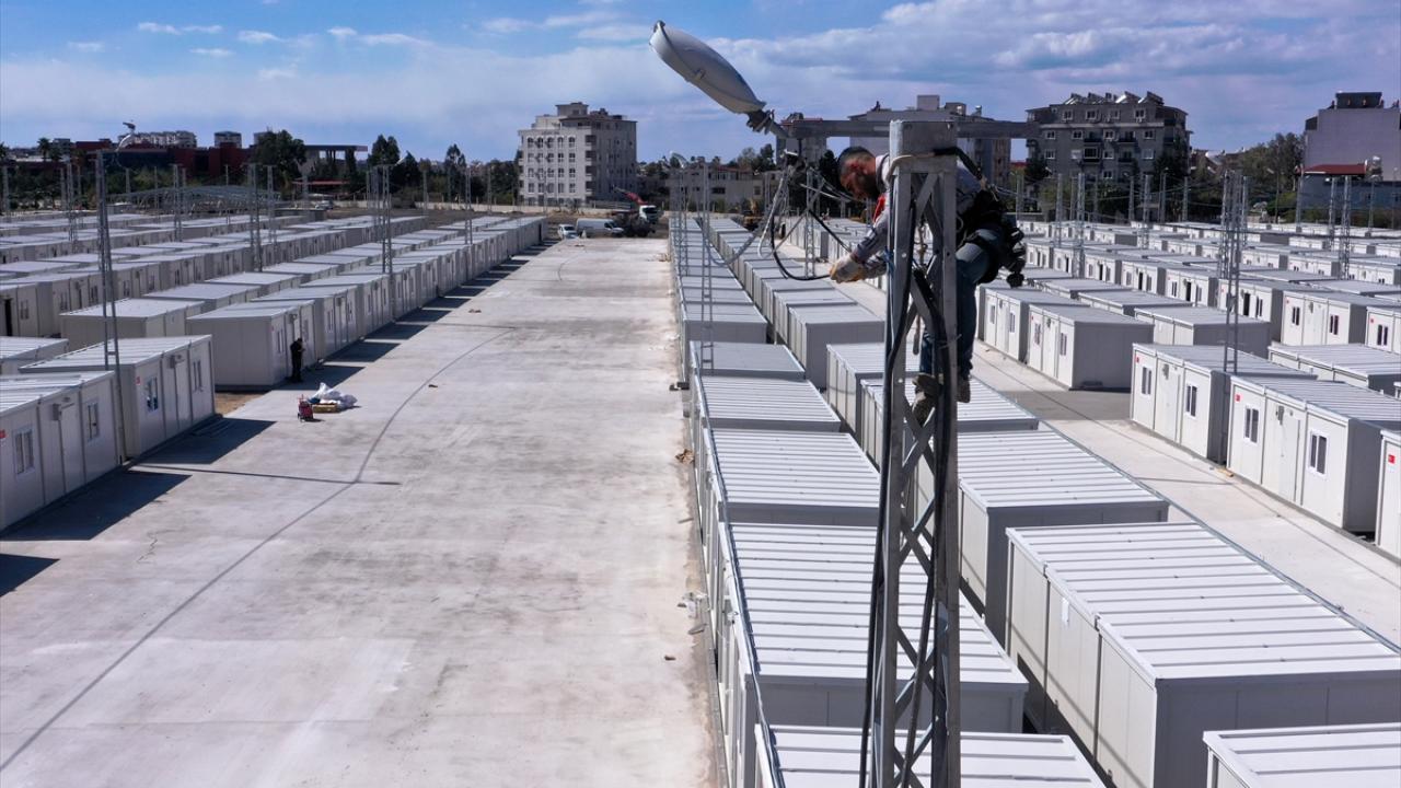 Kahramanmaraş merkezli depremlerden sağ kurtulan elektrik ustası Ali Alyanak, Hatay'ın İskenderun ilçesinde, depremzedelerin barınması için yapımı süren konteyner kentlerin aydınlatılması için çalışıyor.