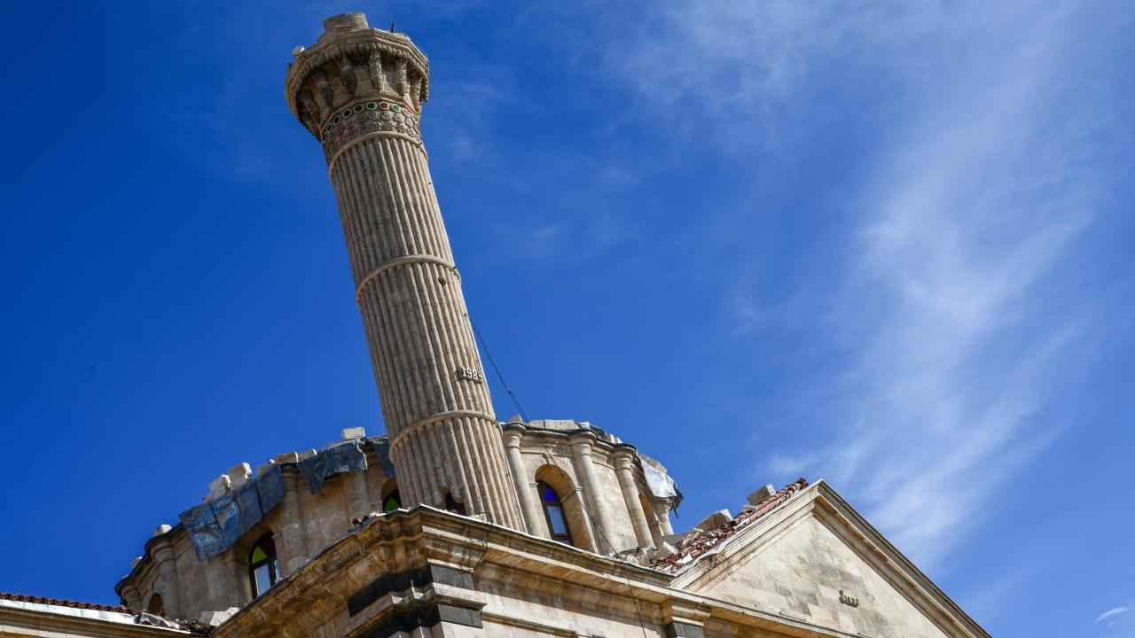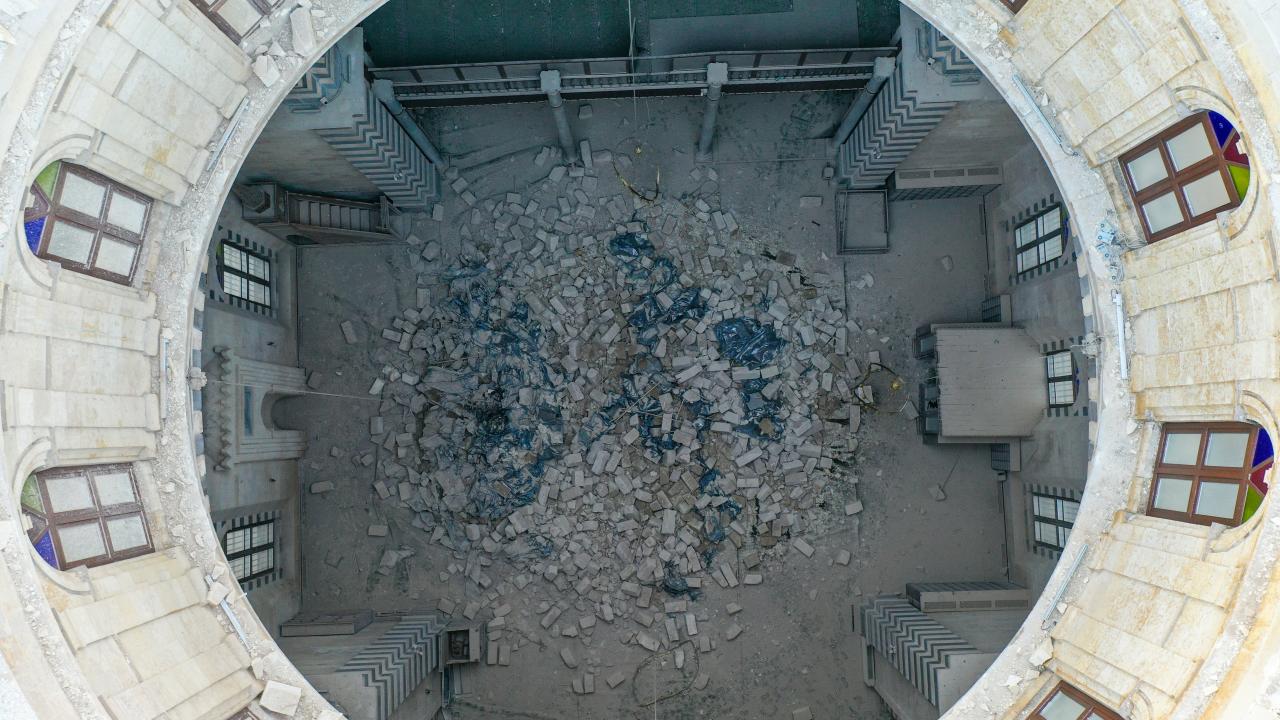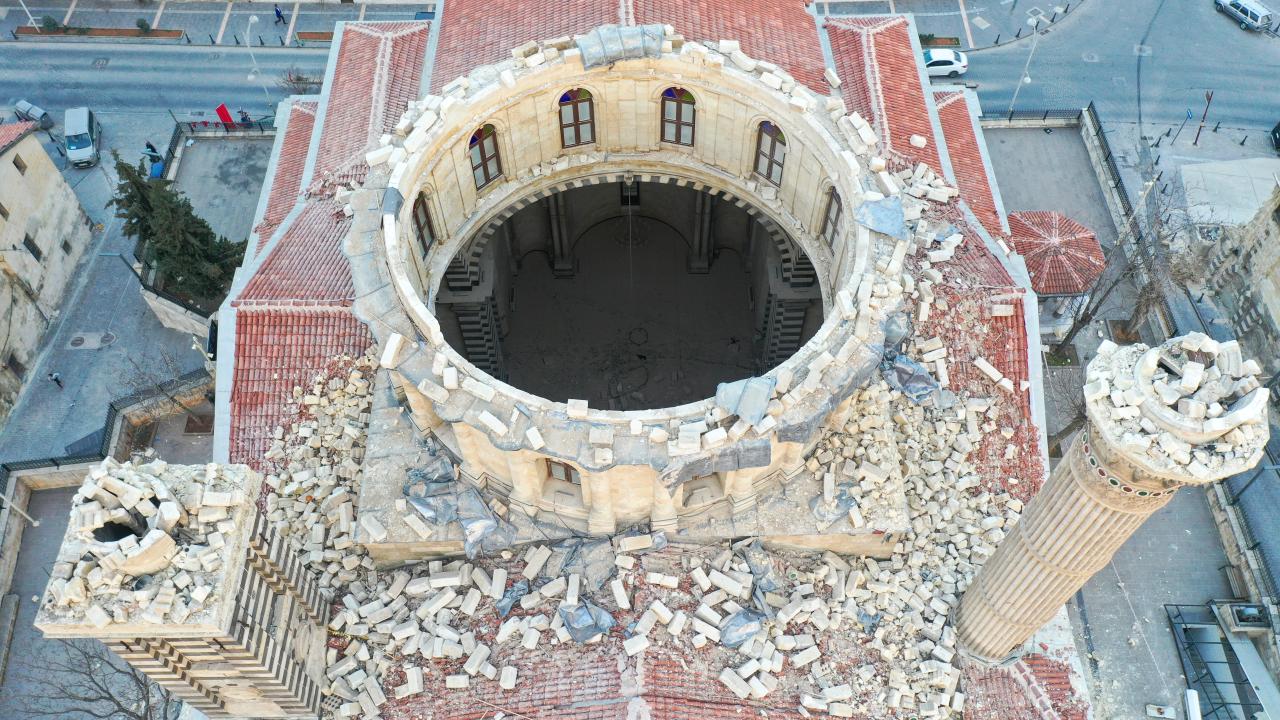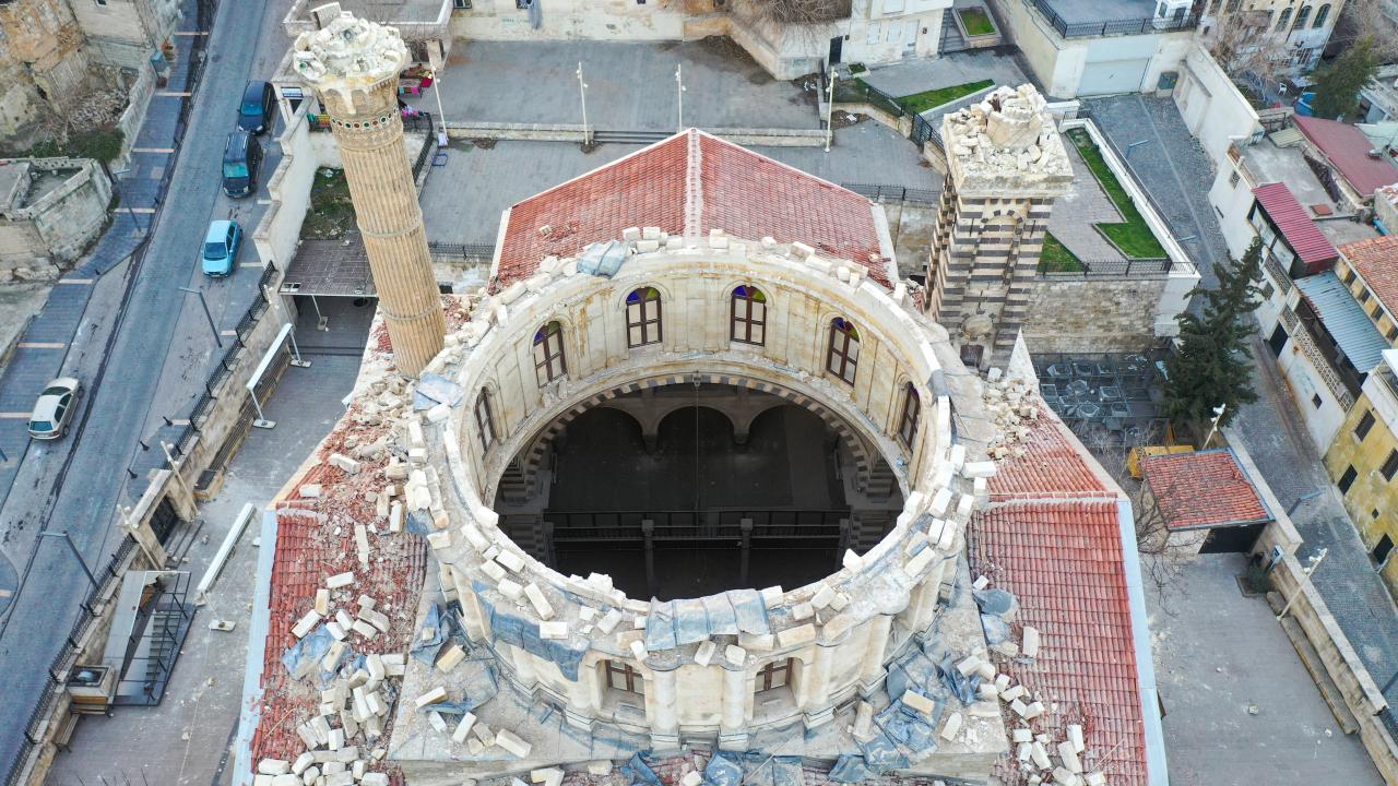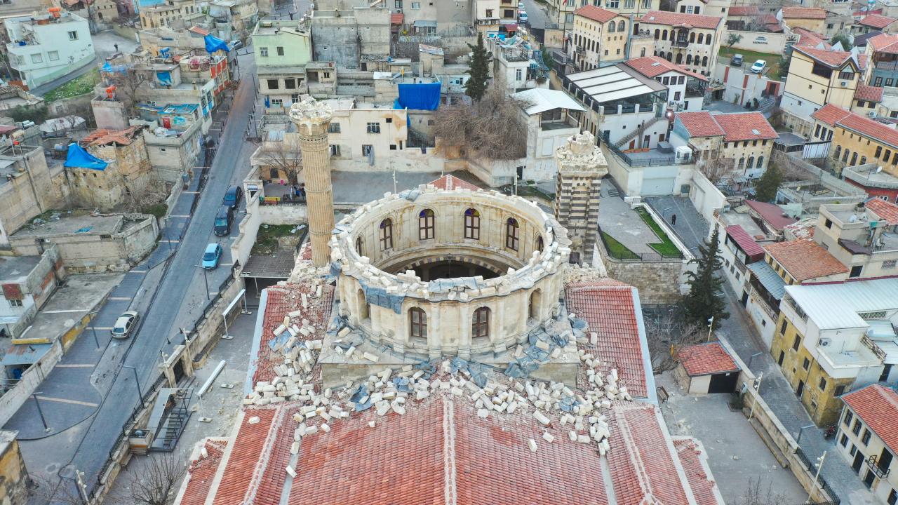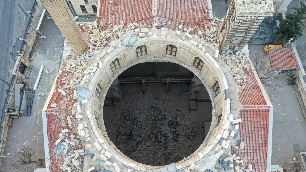 Depremin etkisiyle kubbesi çöken caminin minarelerinde de kısmi hasar oluştu.