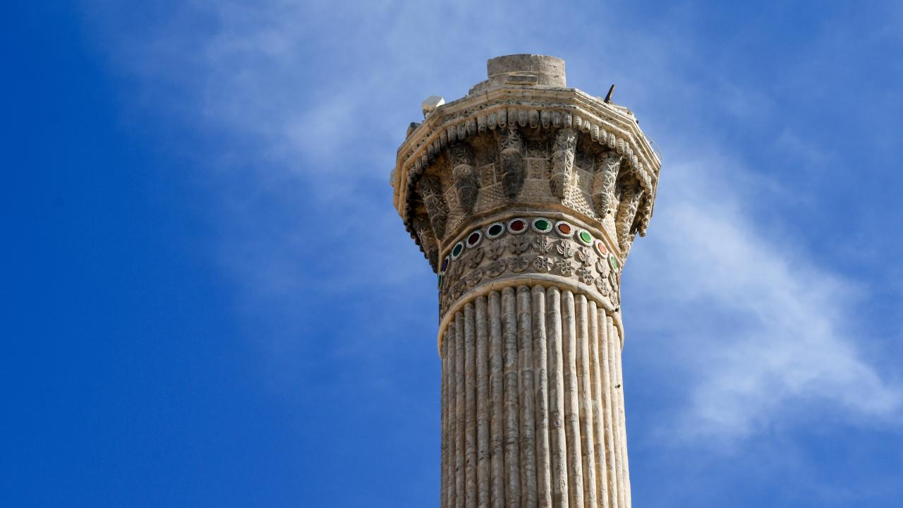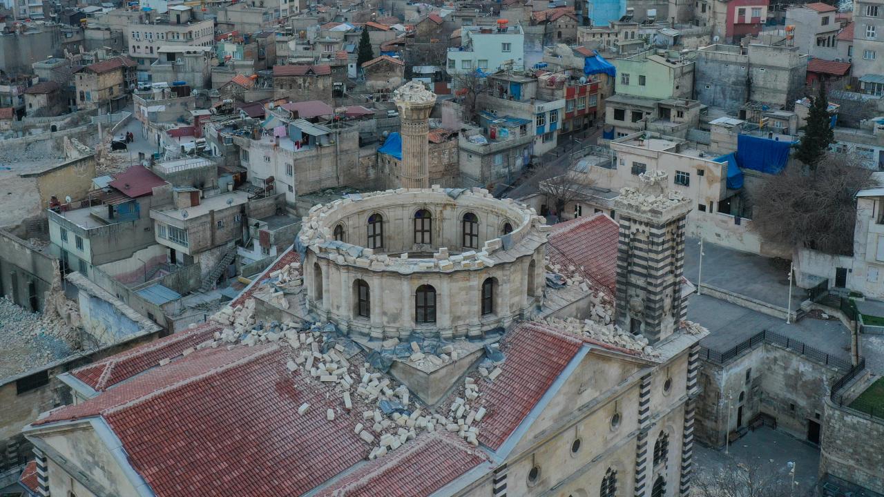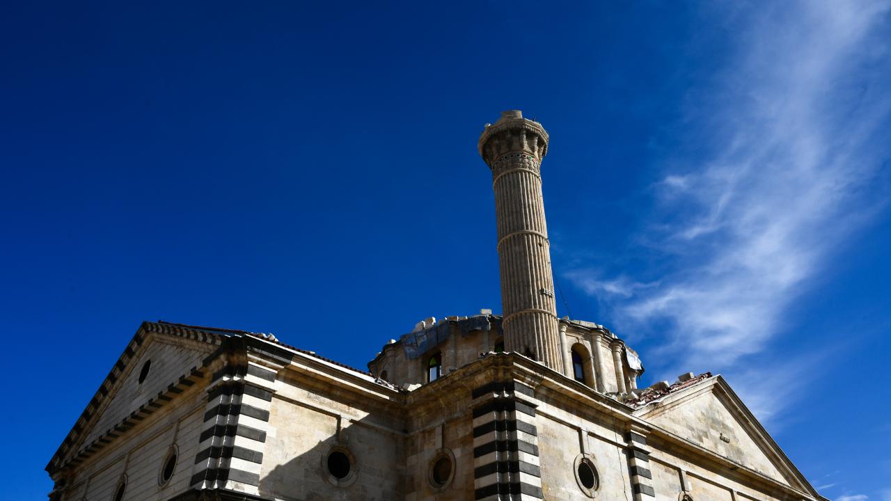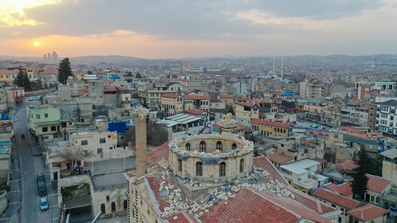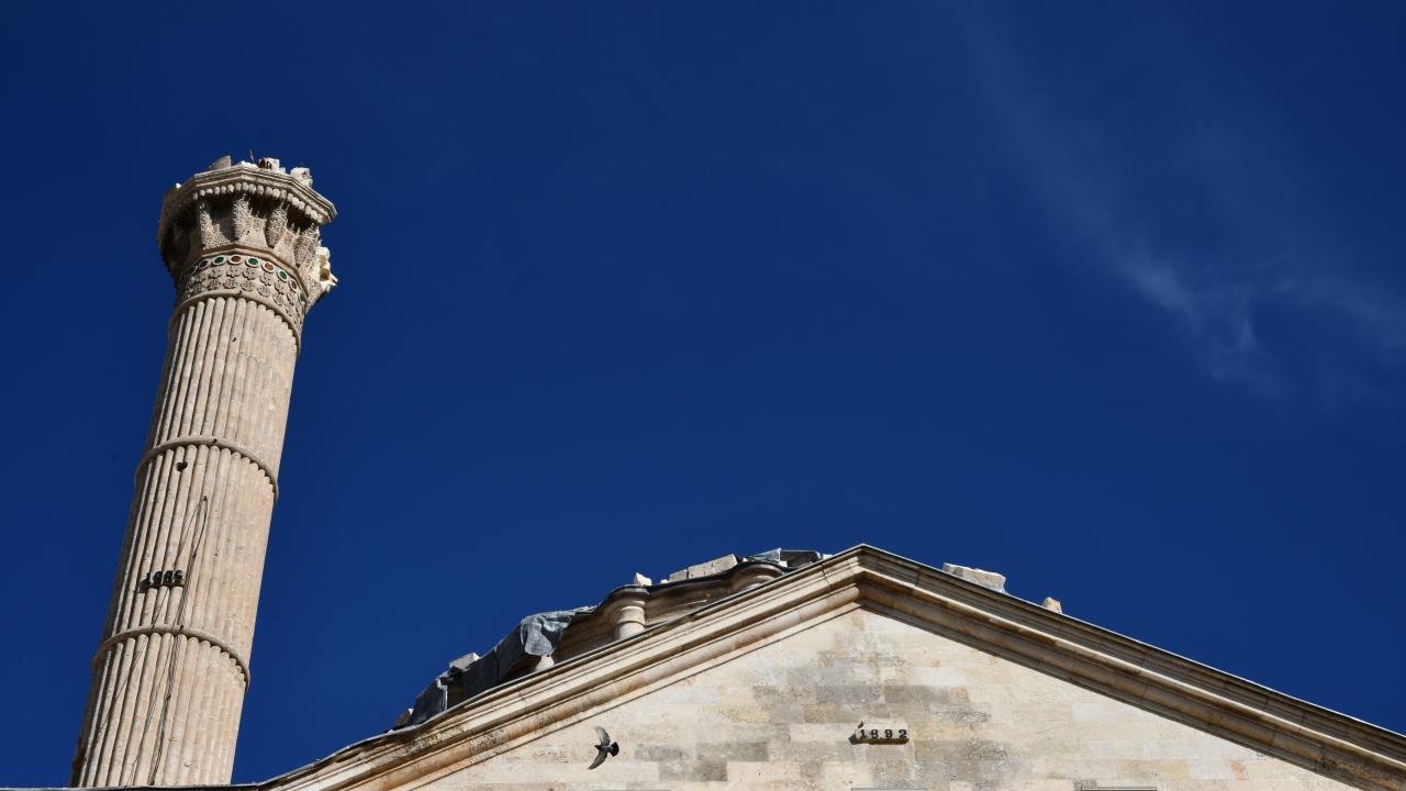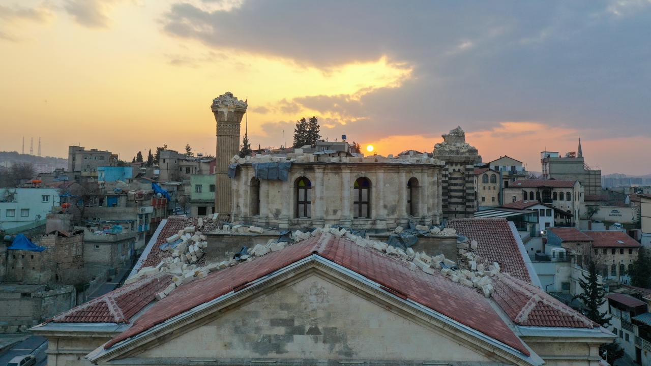 Depremin etkisiyle kubbesi çöken caminin minarelerinde de kısmi hasar oluştu.