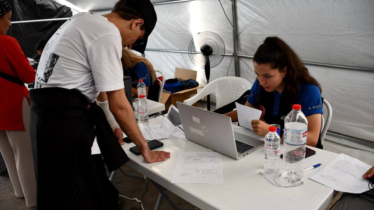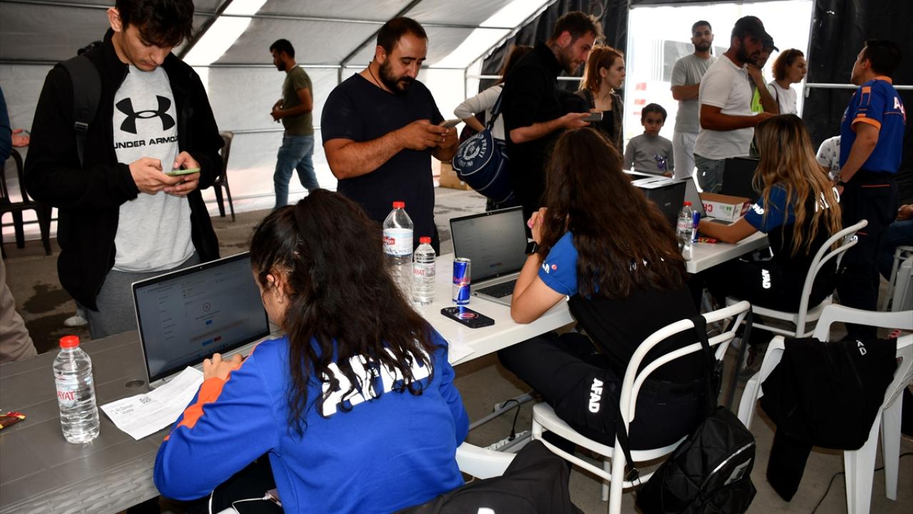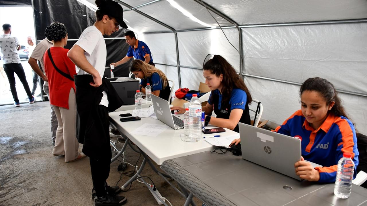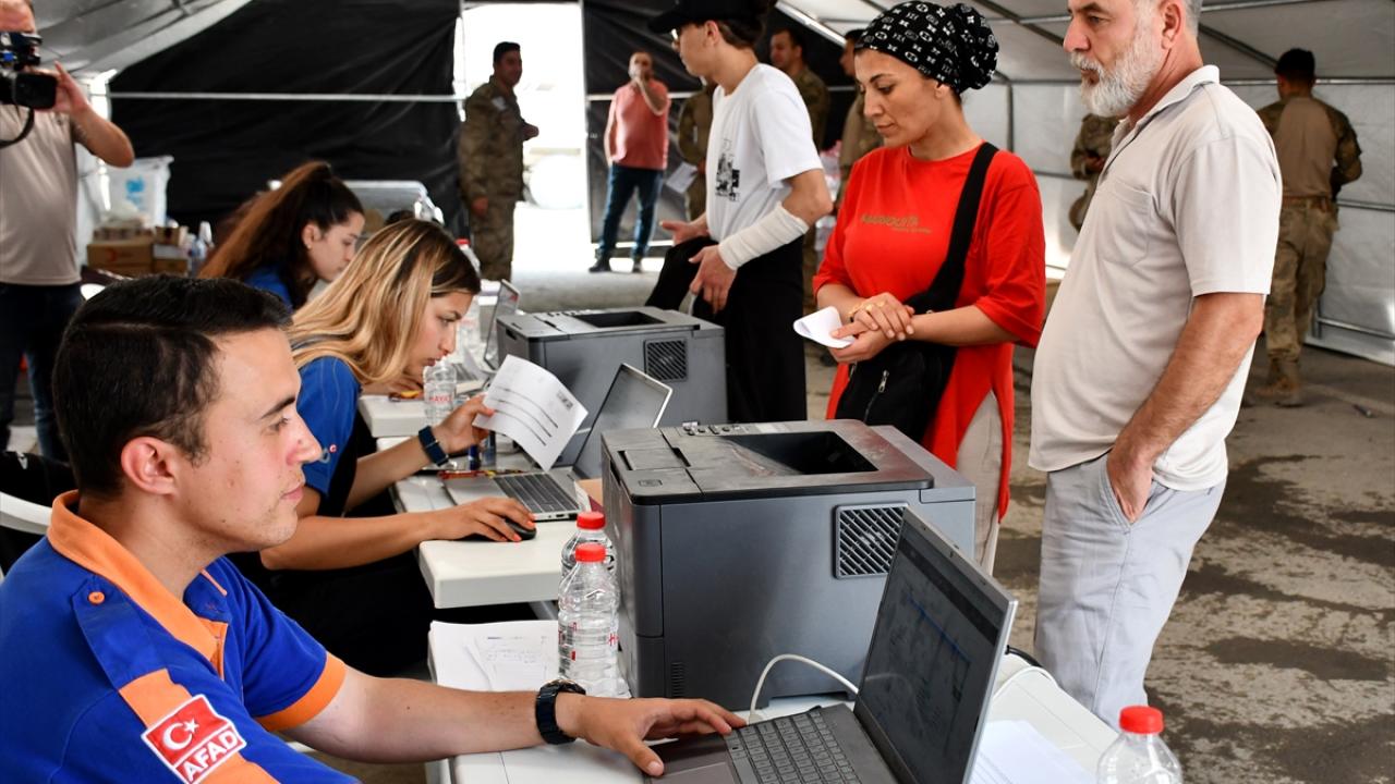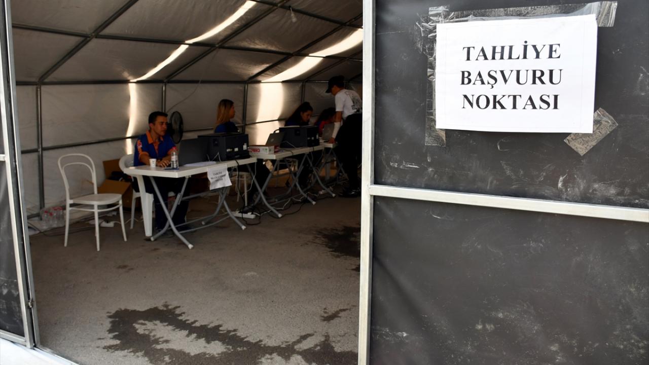 Hatay Otogarı içerisinde çadırdan oluşturulan tahliye başvuru noktasına gelen vatandaşlar, yol ücretlerini alabilmek için burada kayıt oluşturuyor.