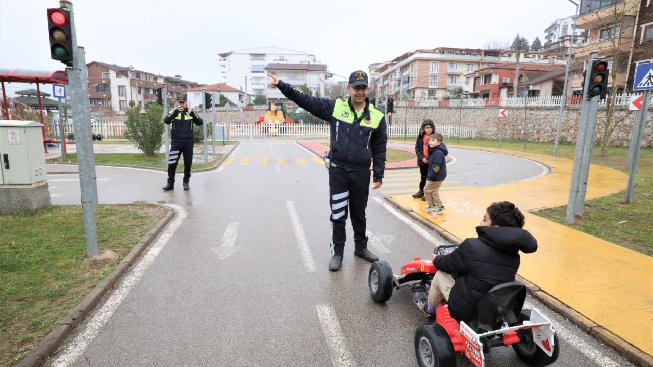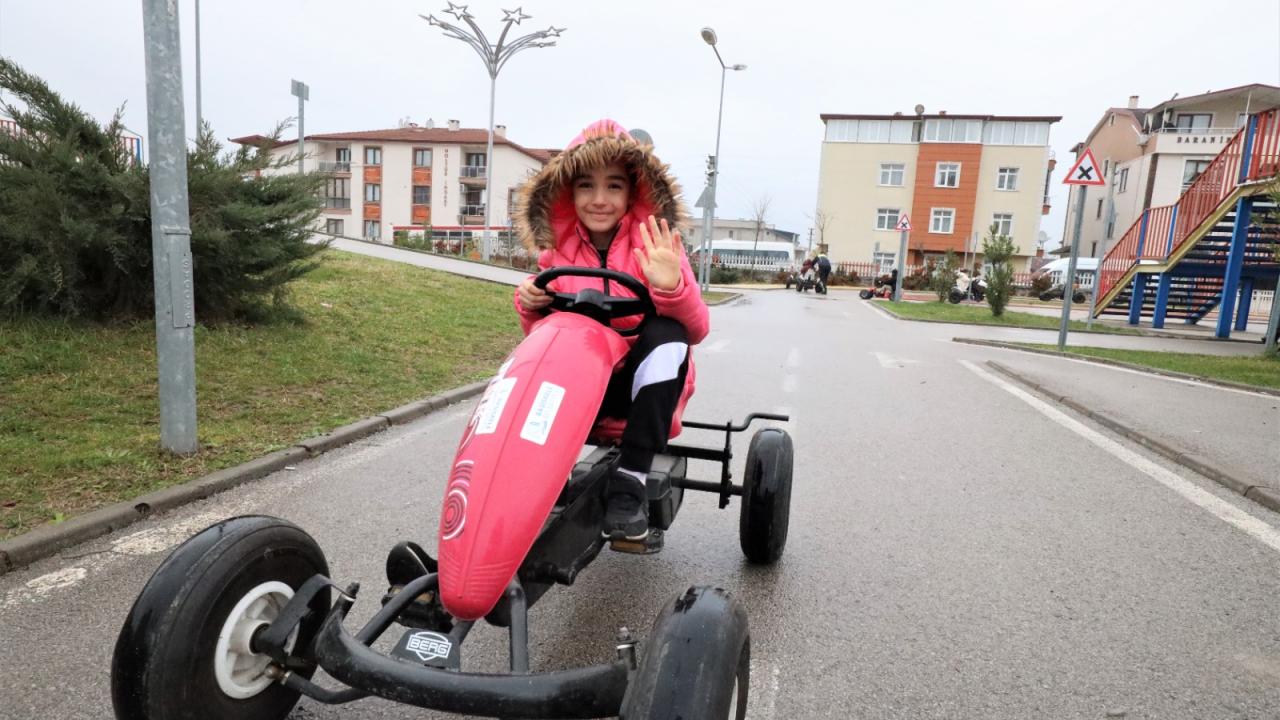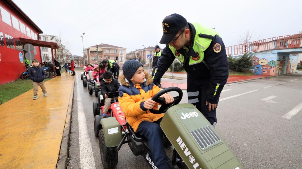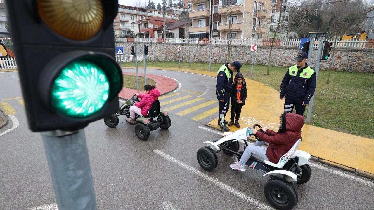 Jandarma trafik ekipleri rehberliğinde yayaların ve araç sürücülerinin trafikte uyması gereken kuralları önce eğitim videoları eşliğinde teorik olarak öğrenen çocuklar, daha sonra uygulamalı eğitim için direksiyon başına geçti.