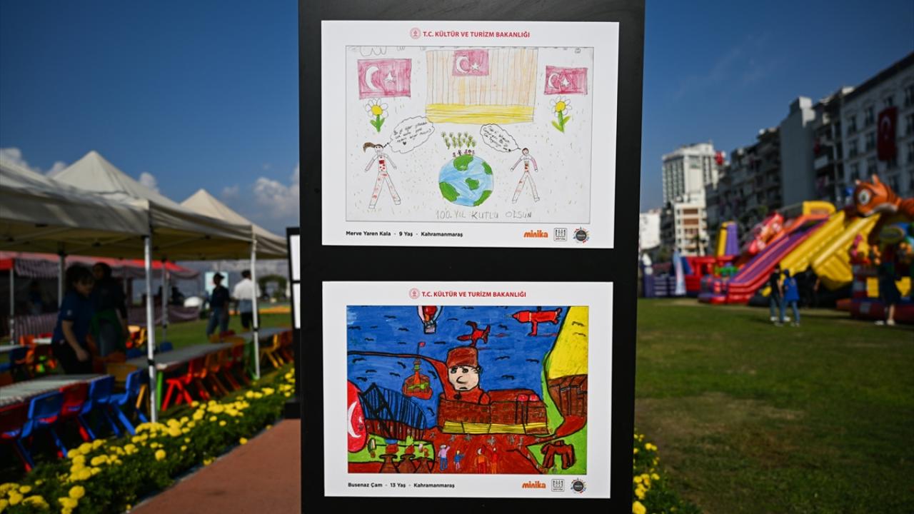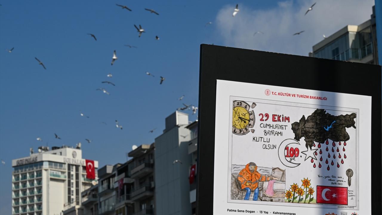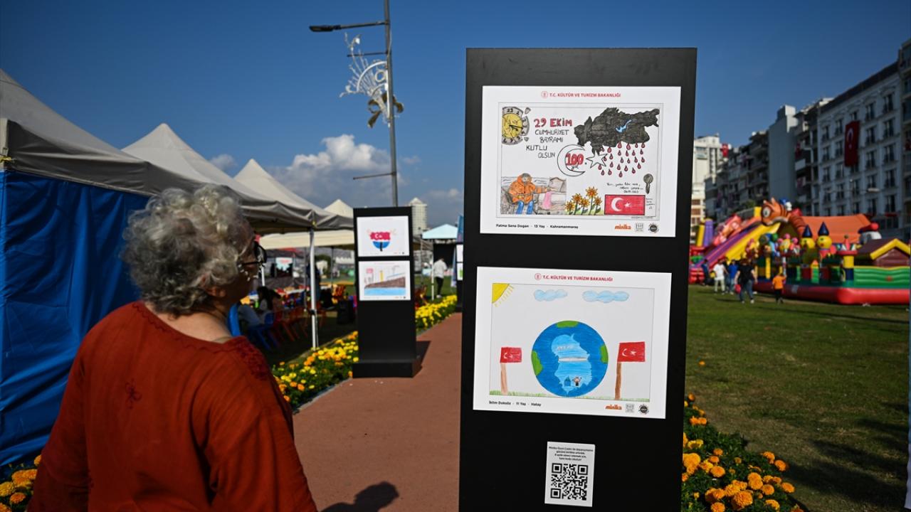 Kahramanmaraş merkezli depremlerden etkilenen çocukların, Cumhuriyet'in 100. yılı dolayısıyla çizdiği resimler, Kültür ve Turizm Bakanlığının Efes Kültür Yolu Festivali kapsamında İzmir'in merkezindeki Gündoğdu Meydanı'nda oluşturulan etkinlik alanında sergileniyor.