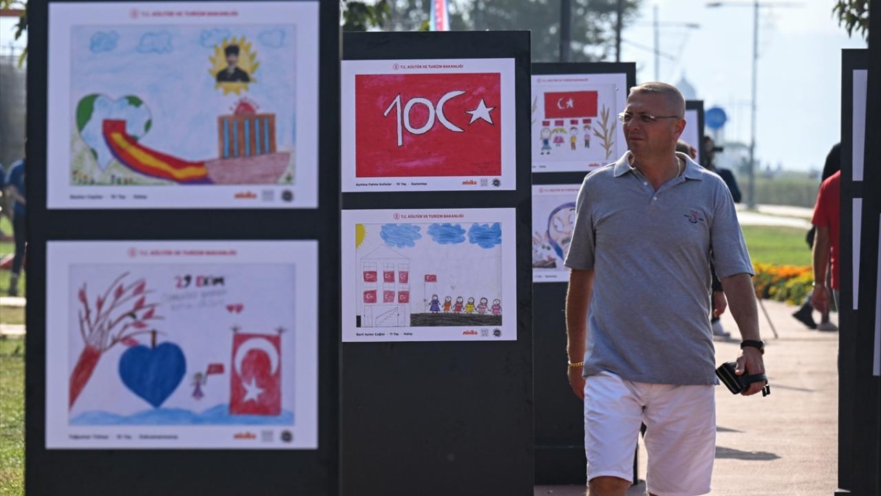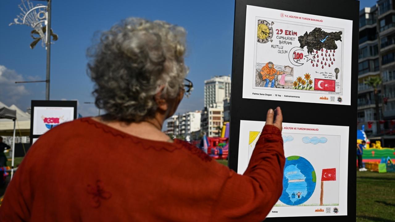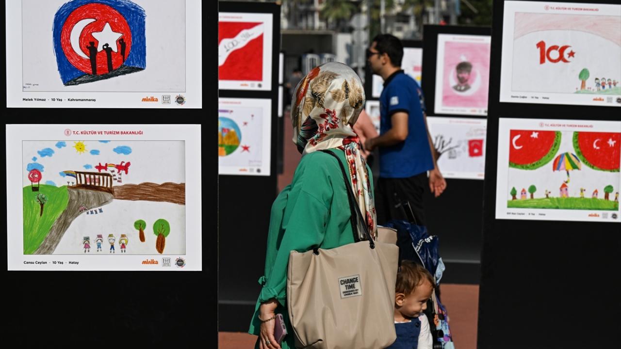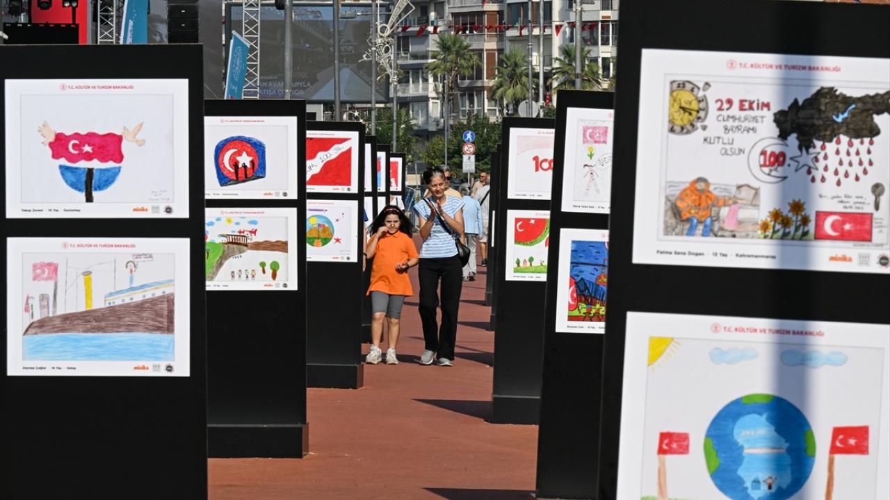 Kahramanmaraş merkezli depremlerden etkilenen çocukların, Cumhuriyet'in 100. yılı dolayısıyla çizdiği resimler, Kültür ve Turizm Bakanlığının Efes Kültür Yolu Festivali kapsamında İzmir'in merkezindeki Gündoğdu Meydanı'nda oluşturulan etkinlik alanında sergileniyor.