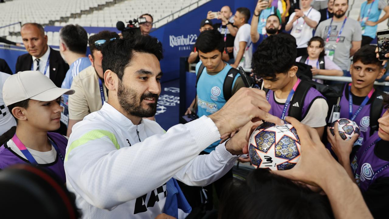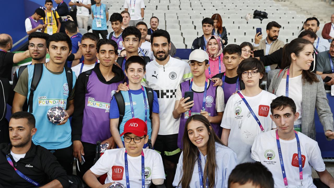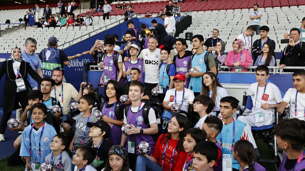 Depremzede gruptaki çocuklar, sahada futbolcularla hatıra fotoğrafı çektirdi, kendilerine hediye edilen formalar ile "UEFA Şampiyonlar Ligi İstanbul Mini Top"lara imza attırdı.