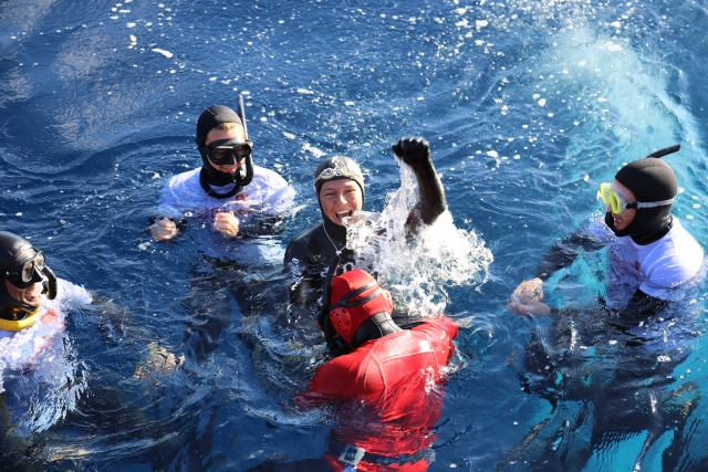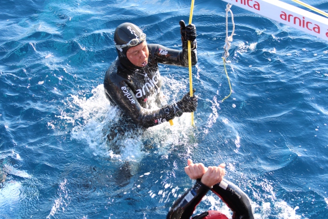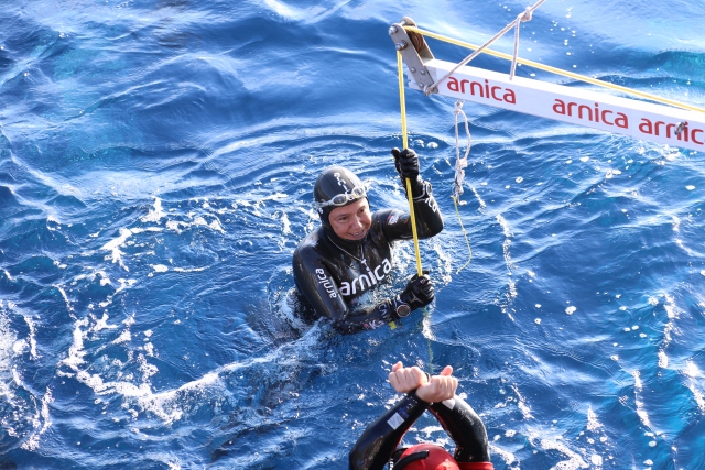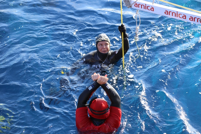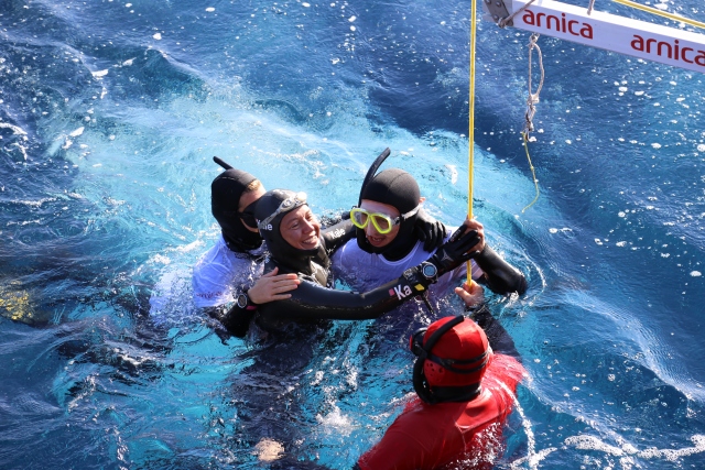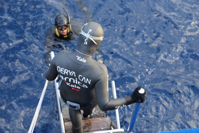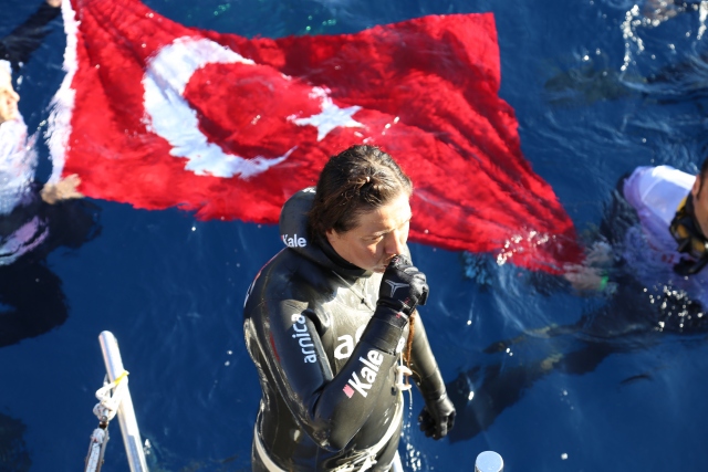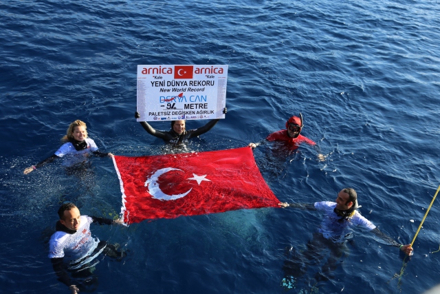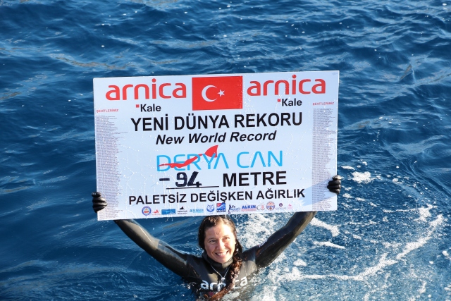 Dünya dalış rekortmeni Derya Can, Antalya'nın Kaş ilçesinde, paletsiz değişken ağırlık ip destekli serbest dalış kategorisinde 94 metreye dalarak dünya rekoruna imza attı.