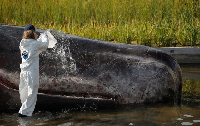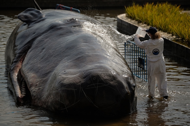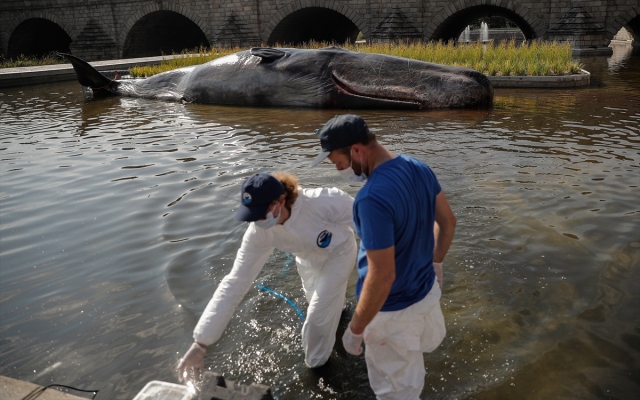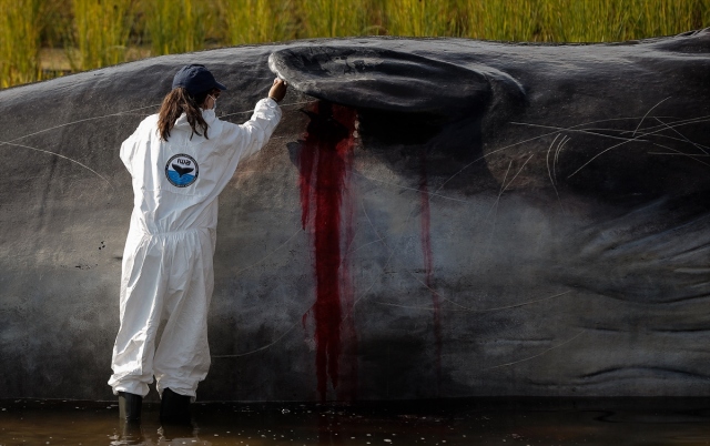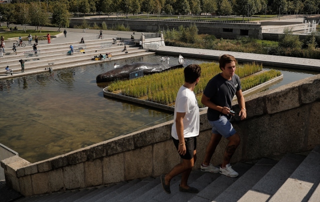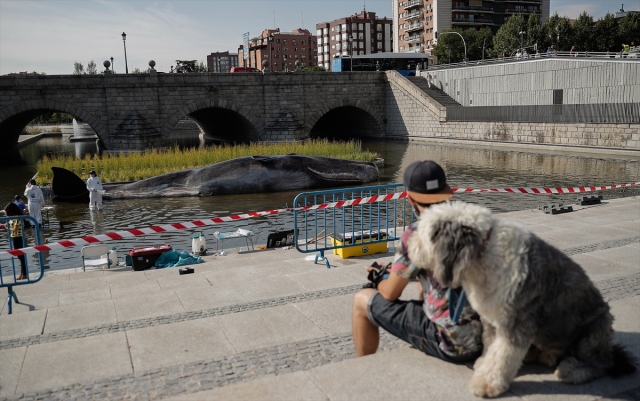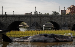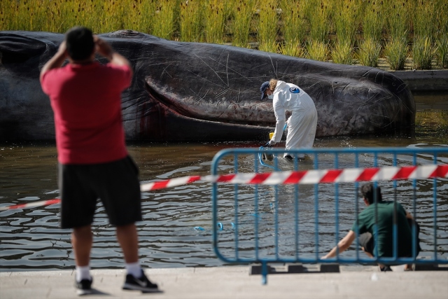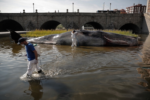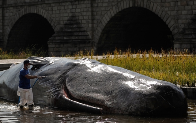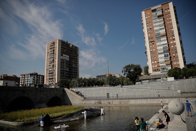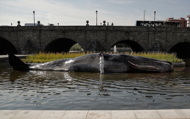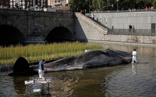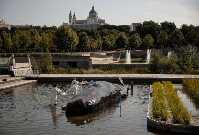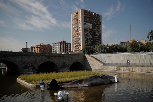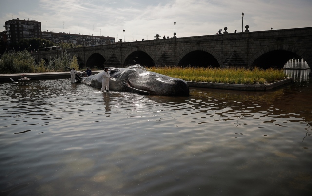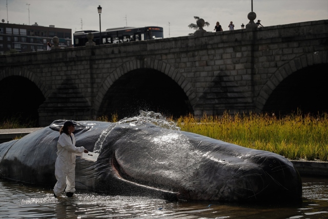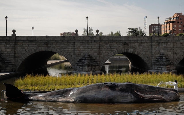 İspanya'nın başkenti Madrid'de, nehir kıyısına yerleştirilen balina heykeli ile okyanusların kirlenmesine dikkat çekildi. Belçika merkezli sanat kolektifi Captain Boomer'ın yaptığı 15 metre uzunluğunda, bir ton ağırlığındaki balina heykeli, sabah Manzanares Nehri'ne yerleştirildi. Gerçek bir balina gibi görünen heykele deniz biyoloğu kılığına girmiş sanatçılar, "müdahale" ederken, Madridliler de onları izledi.