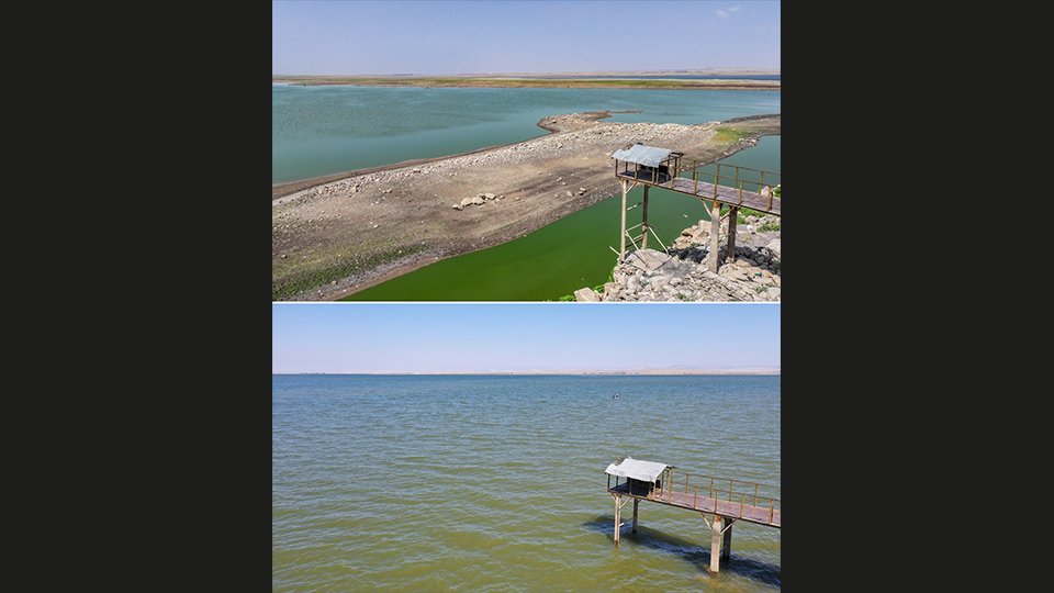 Kuşlar için önemli beslenme, konaklama ve üreme alanı olan, aynı zamanda tatlı su balıkçılığı ve tarımsal sulamada kullanılan baraj gölünde su seviyesindeki çekilme, yer yer kalan su birikintileri, göl tabanındaki çamurda besin arayan göçmen kuşlar ve bölgedeki hayvan sürüleri havadan görüntülendi.