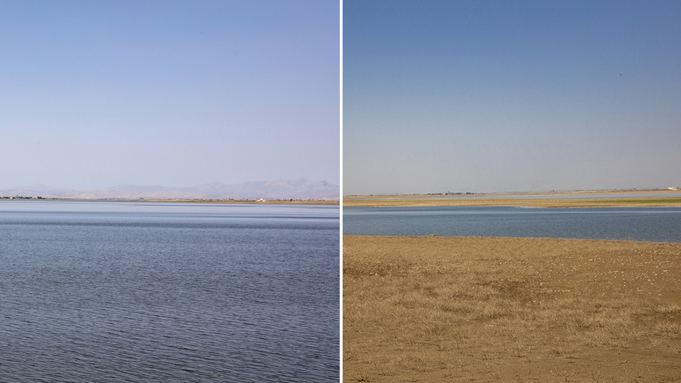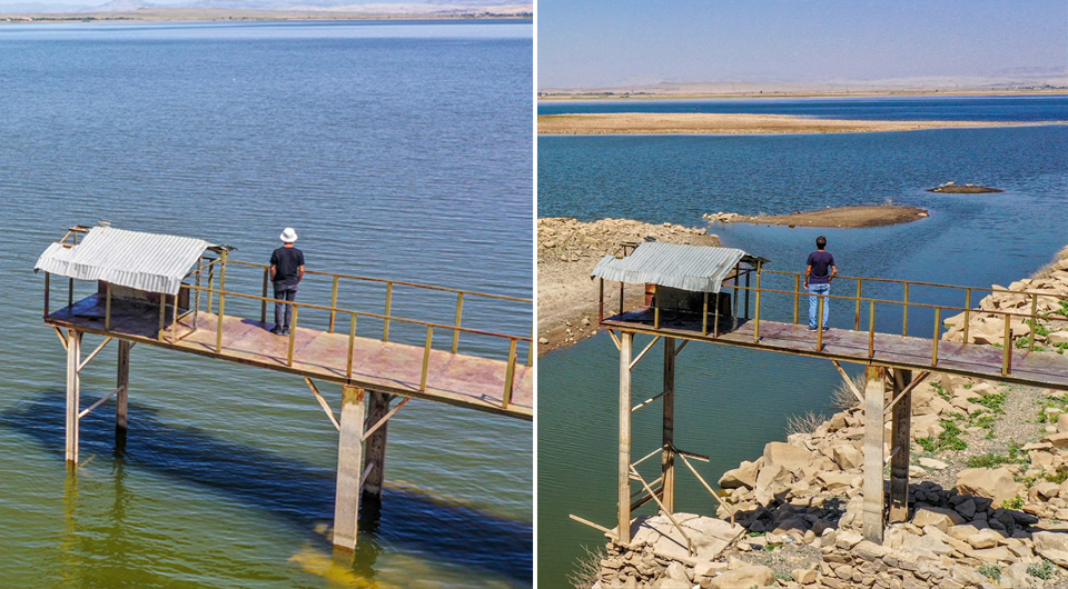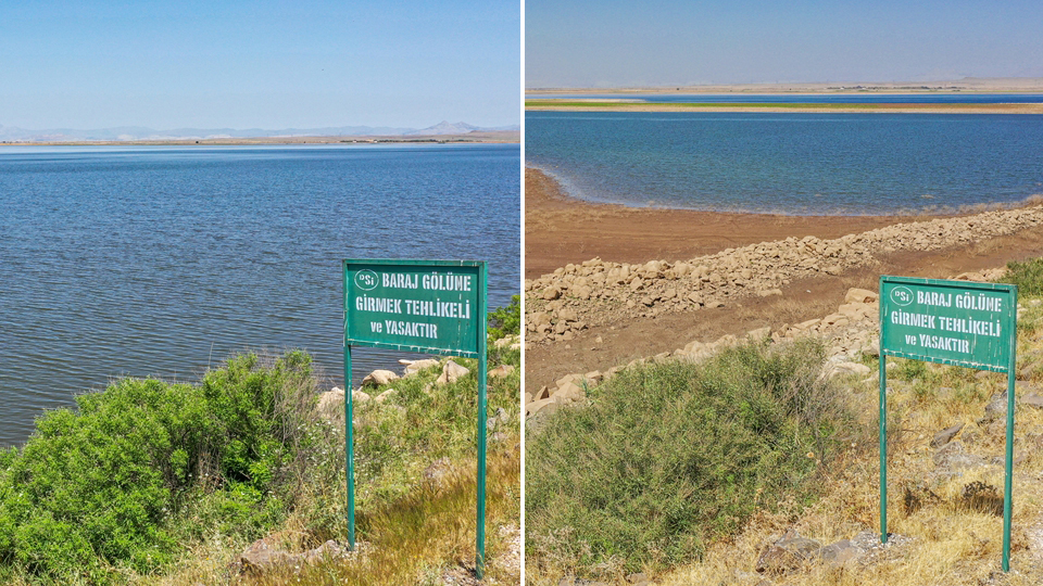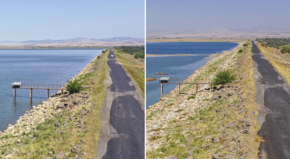 Gölde haziran ve eylül ayında çekilen görüntüler, su seviyesindeki düşüşü gözler önüne serdi.