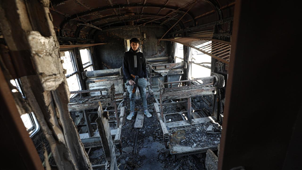 Hulvani, "Burası marangozluk bölümü. Bu Abdülhamid`in vagonu. Hazır hale getirmiştik. İçerisinde yemek ve karşılama bölümü, mutfak ve banyo vardı. Tam tekmildi. Şu an bakın sadece iskeleti kalmış durumda. Paramparça olmuş. Burayı yaktılar." şeklinde konuştu.
