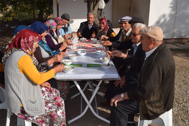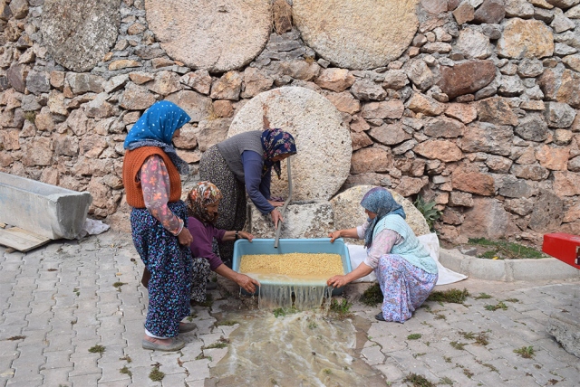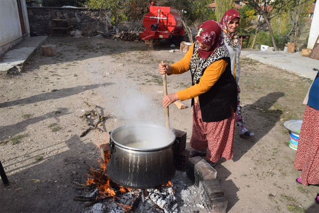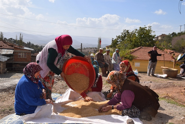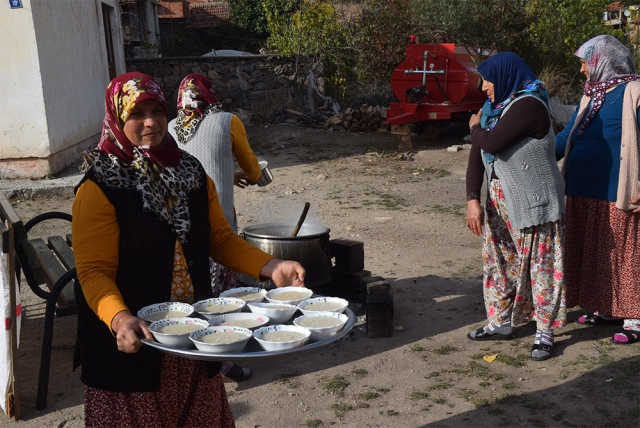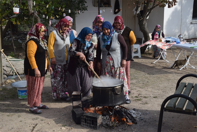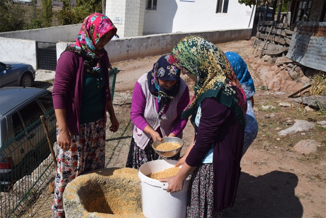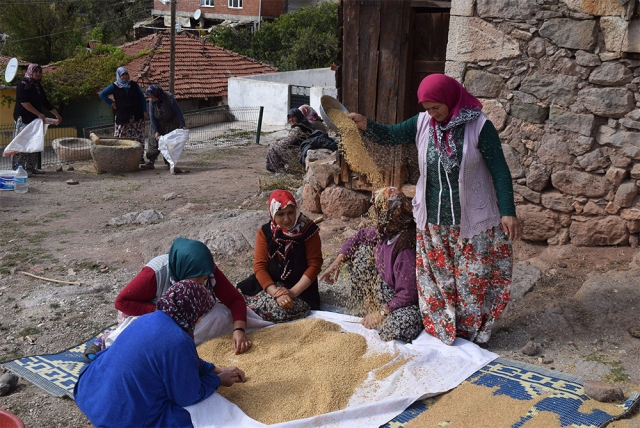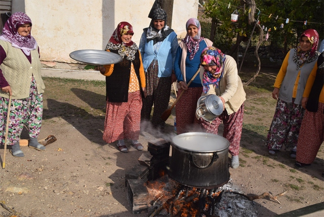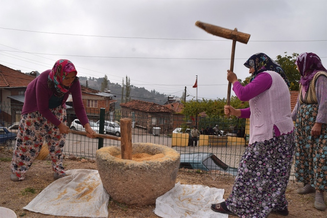 Balıkesir'in Sındırgı ilçesinin kırsal mahallelerinden Kıran'da kadınlar, düğün ve festivallerin vazgeçilmez lezzetlerinden keşkek yemeği için buğdayı dibekte döverek önceden hazırlıyor.Dibek taşında dövüldükten sonra hazır olan keşkek, mahalle meydanında yakılan kazanlarda en az 2 saat kaynatılıyor.