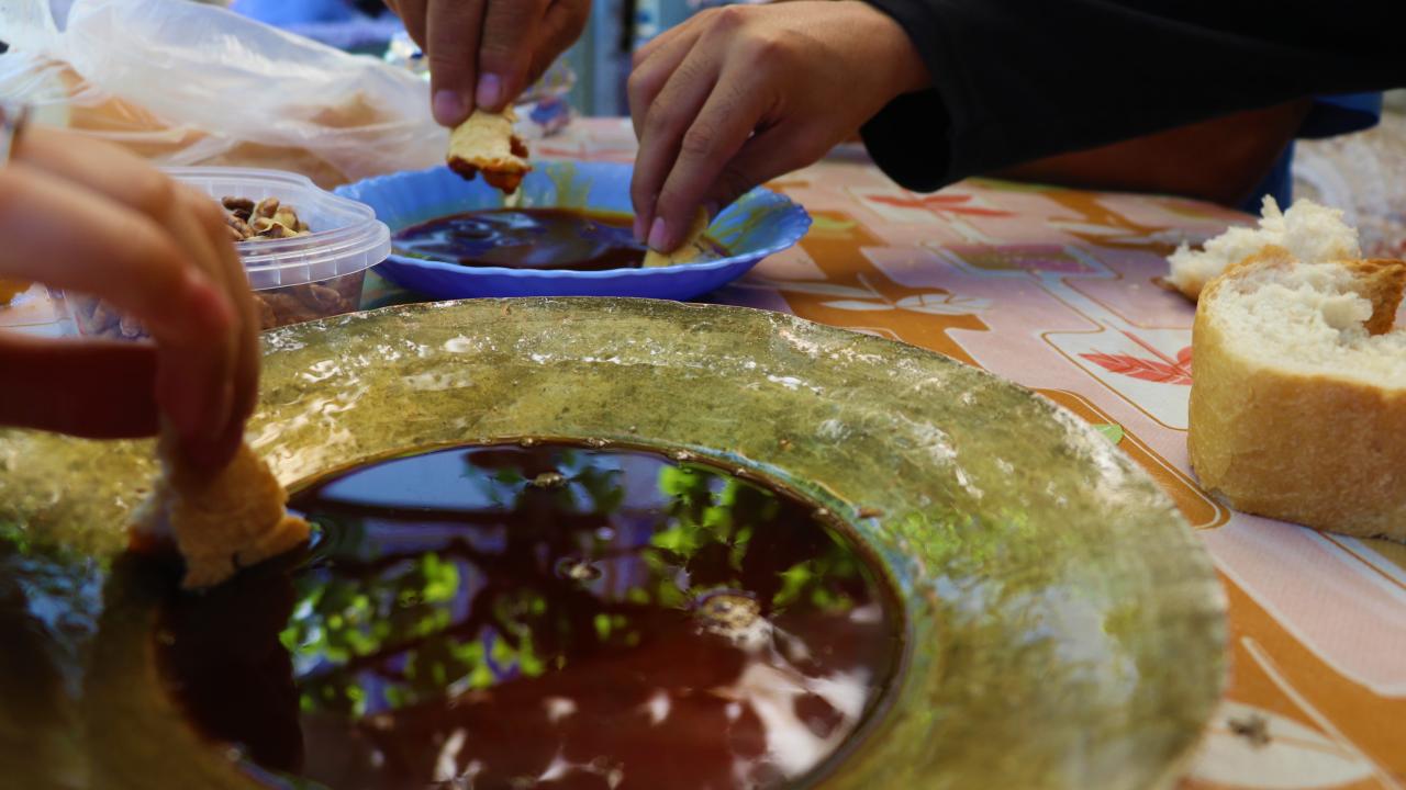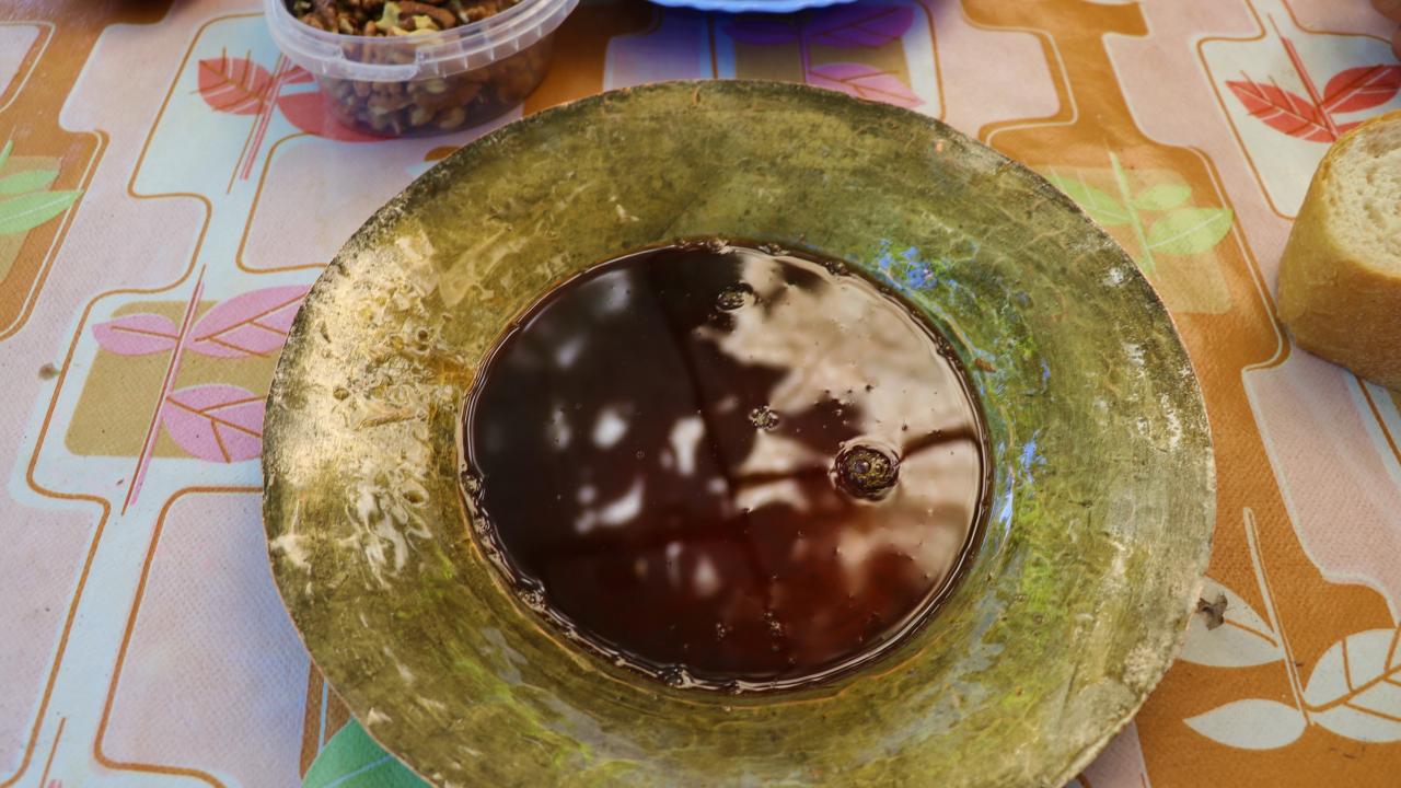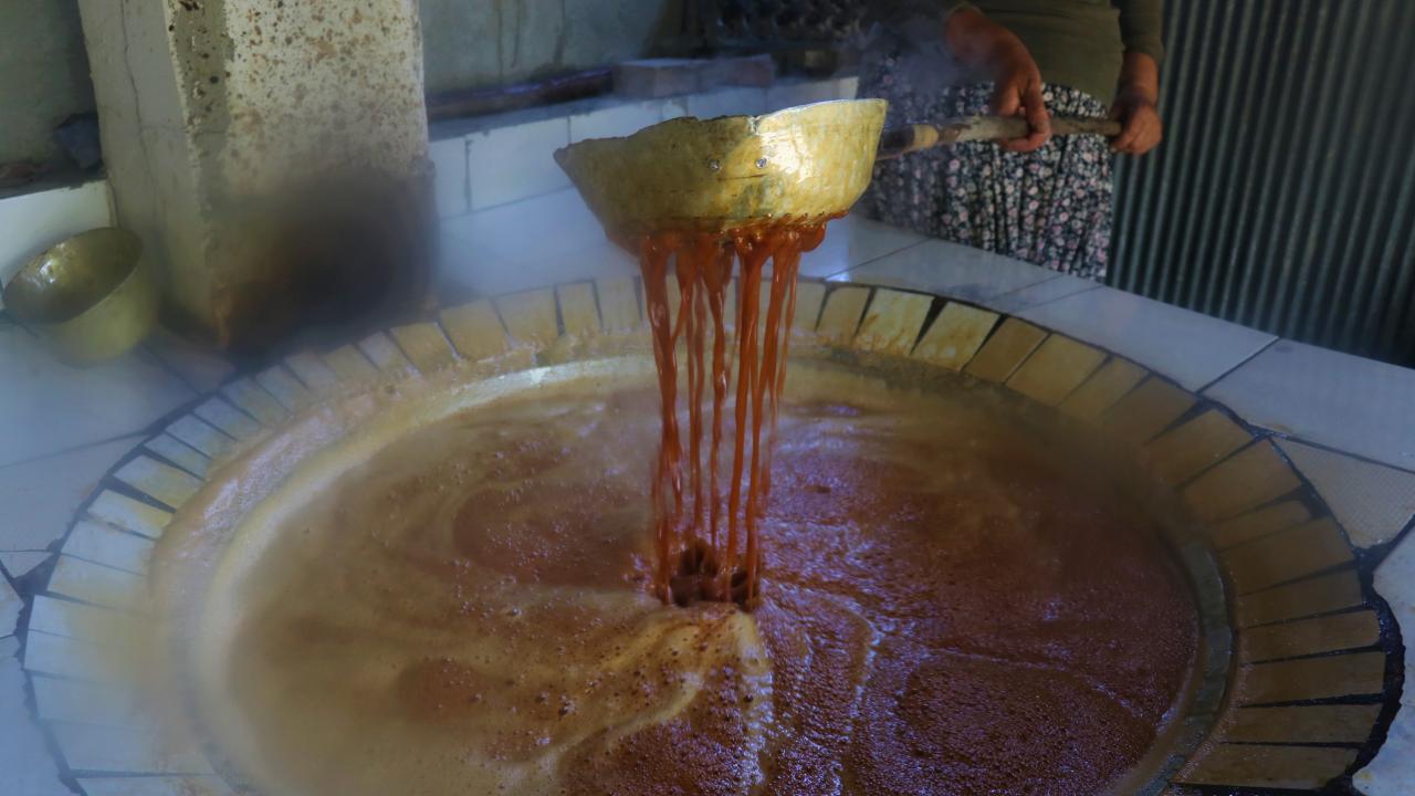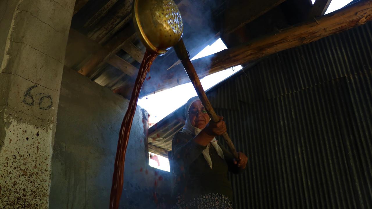 "Durulduktan sonra altı harlı odun ateşiyle yanan tavalara alıyoruz, 3,5 saat savurarak kaynatıyoruz. Kıvamı olunca ateşten alıp 20 gün bakır kazanlarda bekletiyoruz. 20 gün sonra pekmezimiz satışa hazır. Üzümü sıktıktan sonra elde ettiğimiz şırayı temiz toprakla kaynatıyoruz. Pekmezin mayası topraktır, o toprak olmazsa pekmez olmaz. Köyümüzde iki yerden çıkan özel topraktır bu, her topraktan pekmez olmaz."