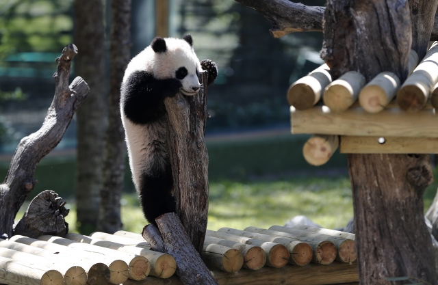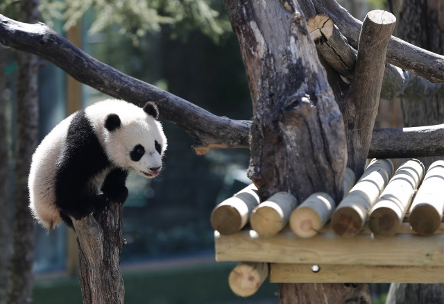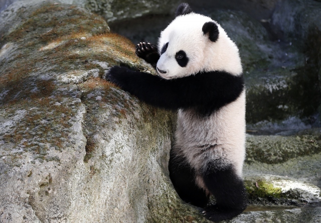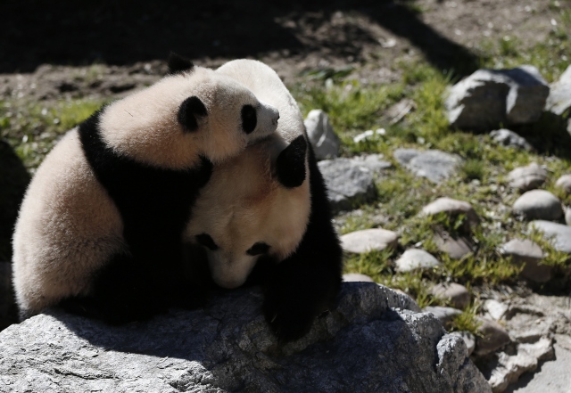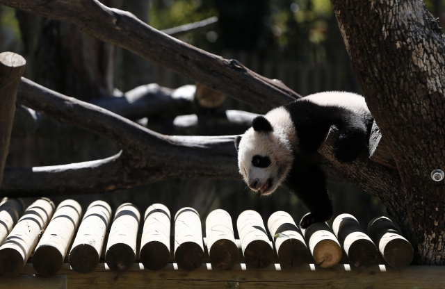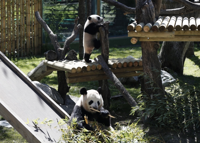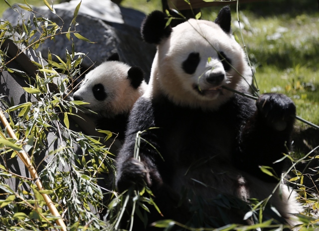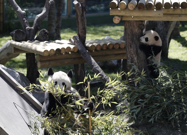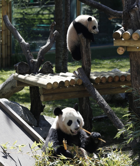 İspanya'nın başkenti Madrid'deki hayvanat bahçesinde geçtiğimiz ağustos ayında dünyaya gelen dişi dev panda Chulina, annesi Hua Zui Ba (fotoğrafta) ile birlikte ilk defa kapalı alandan açık alana çıktı.