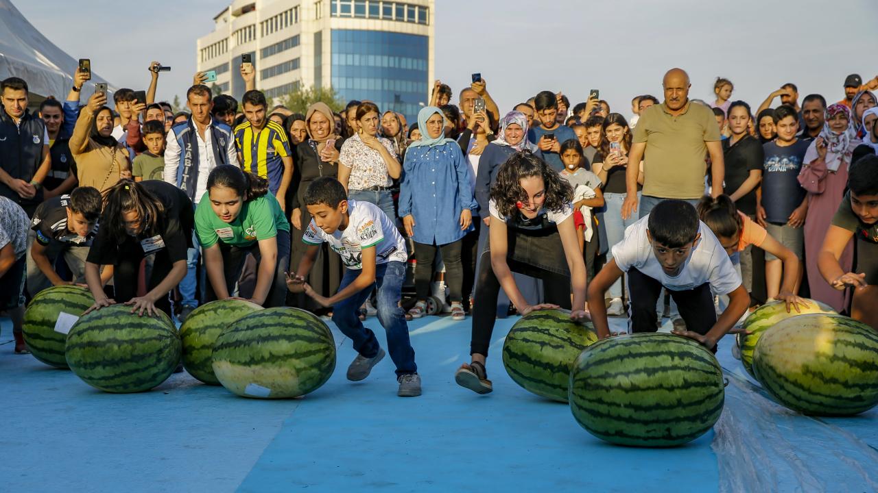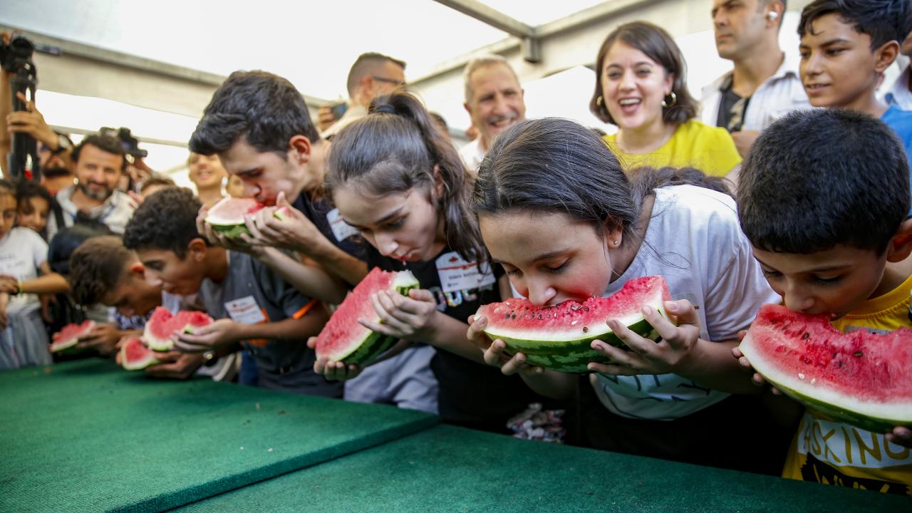Festivalde, çocuklar arasında karpuz yeme ve yuvarlama yarışması yapıldı.