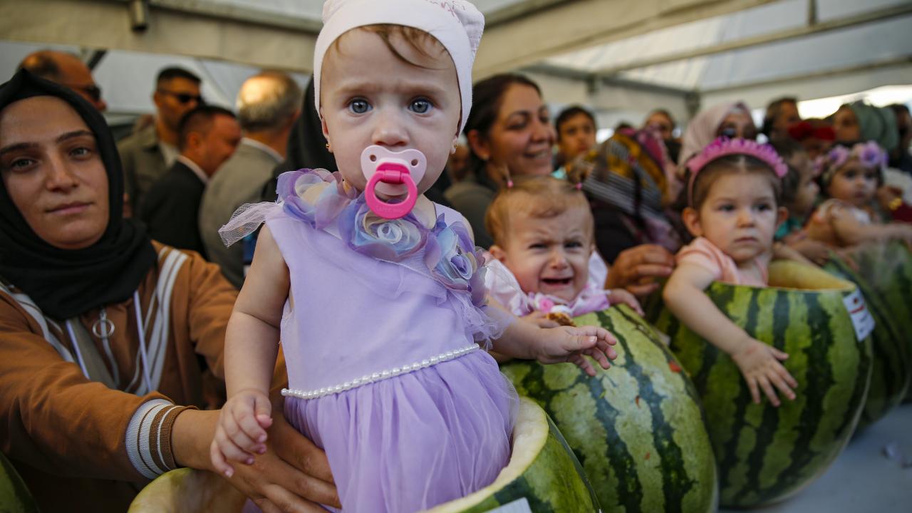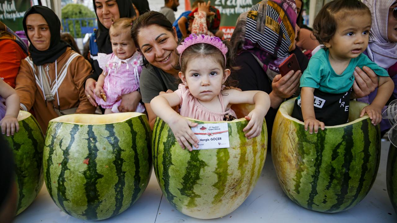 0-2 yaş arasındaki bebekler, karpuza en yakışan çocuk yarışmasında içi oyulan iri Diyarbakır karpuzlarının içinde poz verdi.