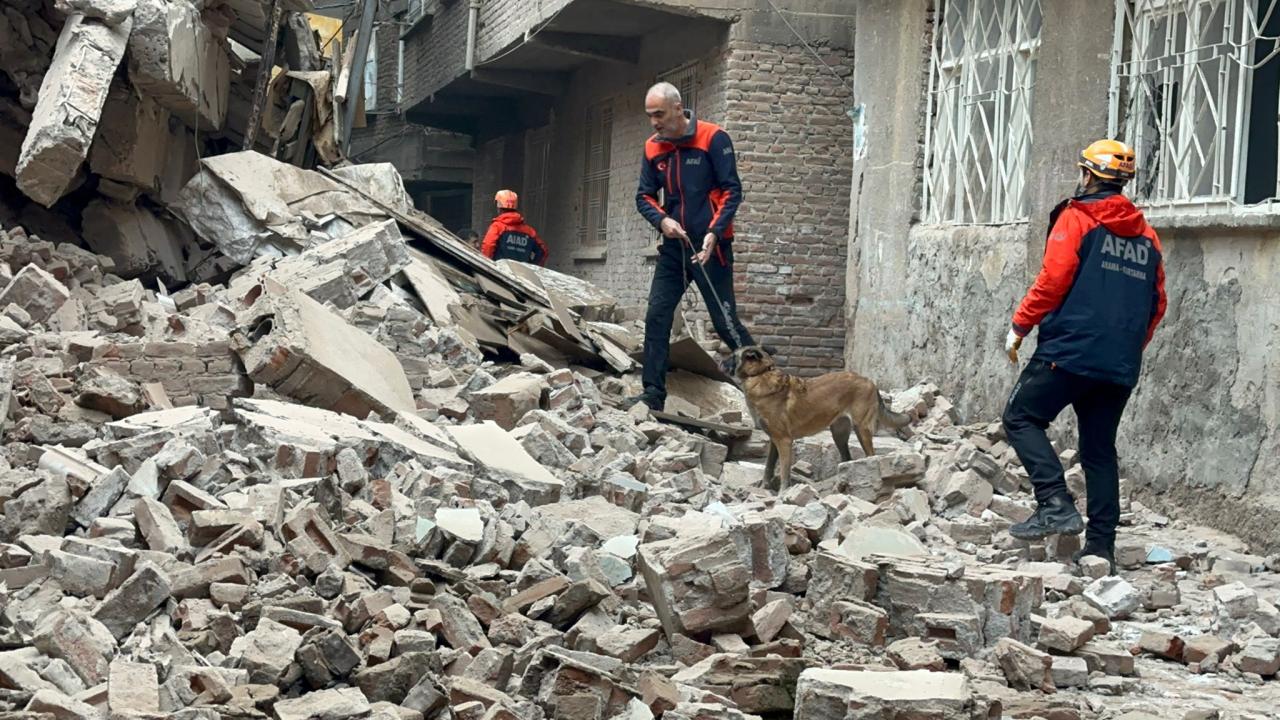 AFAD ekipleri, enkaz altında herhangi birinin kalma ihtimaline karşı köpeklerle arama çalışması yürütüyor.