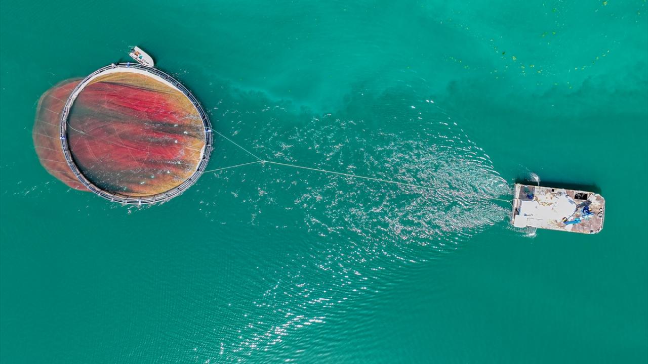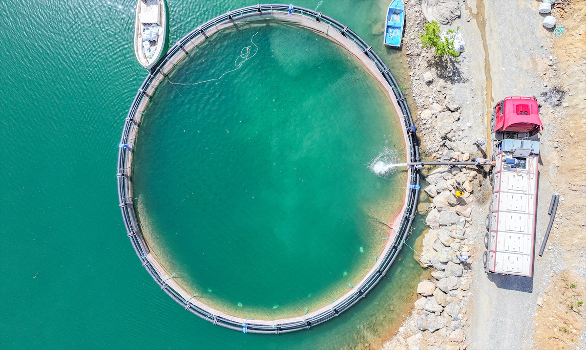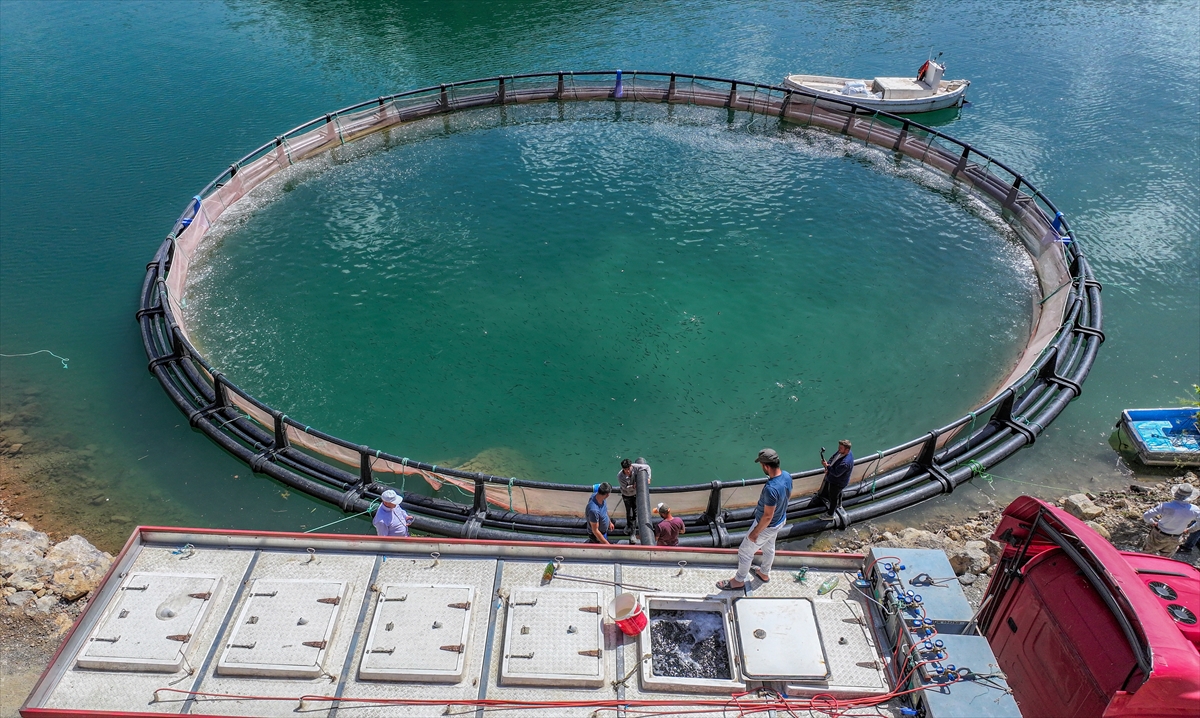 Isparta`daki yavru balık üretim havuzlarında kuluçkadan çıktıktan sonra 300 gram ağırlığa ulaşan balıklar, tırlarla Çüngüş`teki kafeslere taşındı.