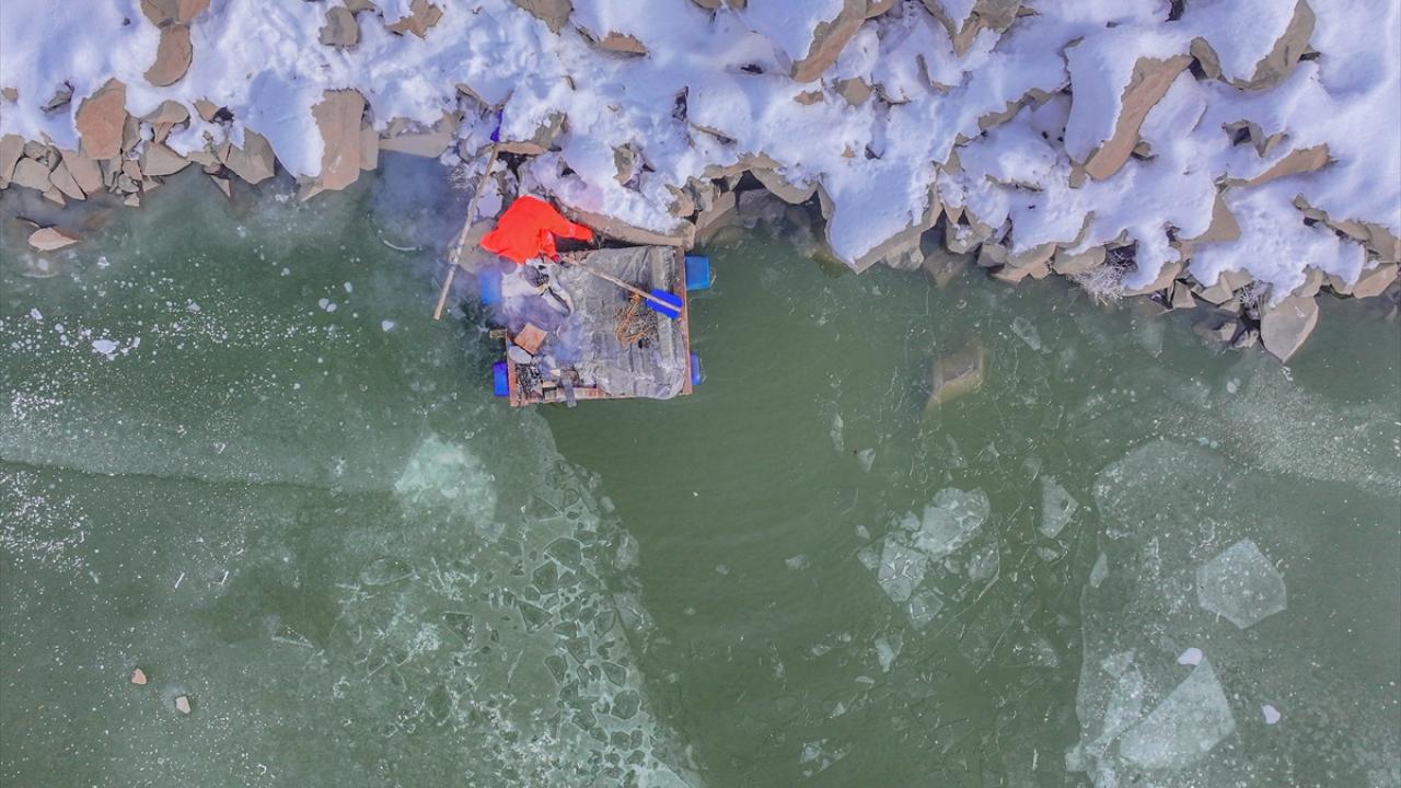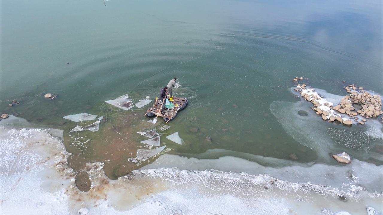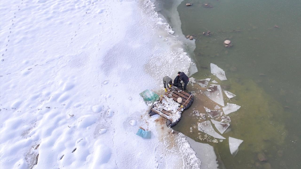 Keleklerini buzların arasından çıkaran balıkçılar, buz tutmayan bölümden göle açılarak ağ atıyor.