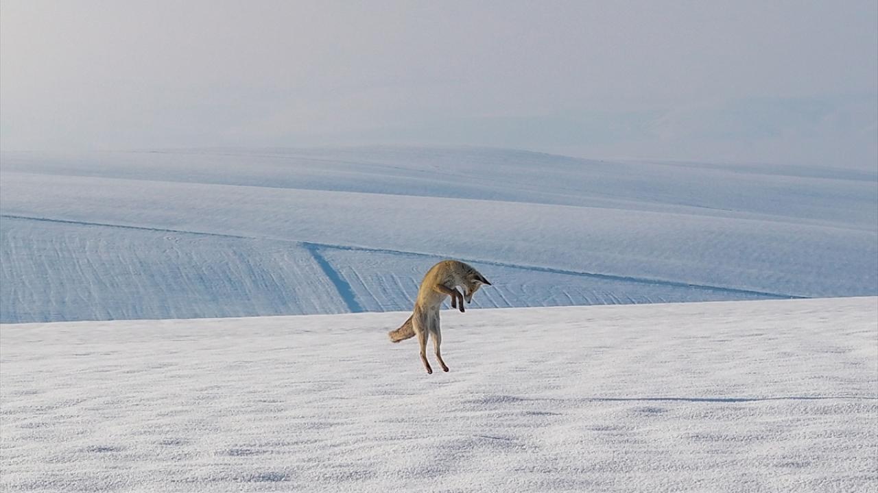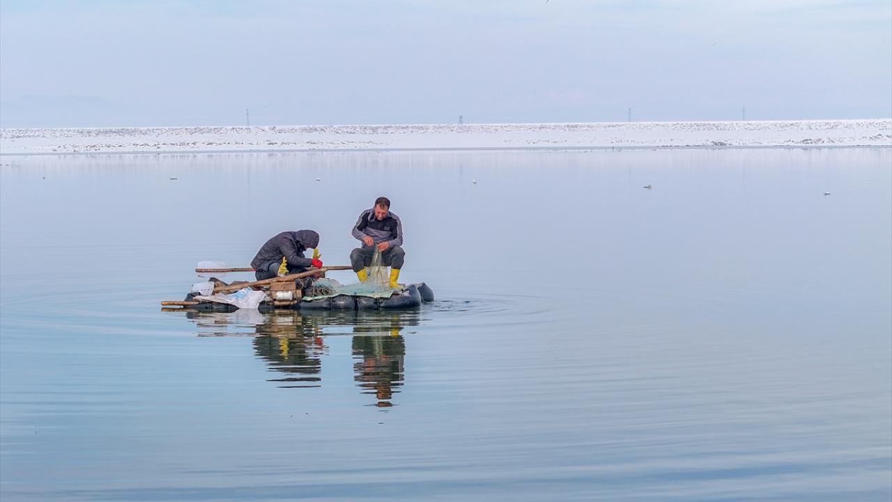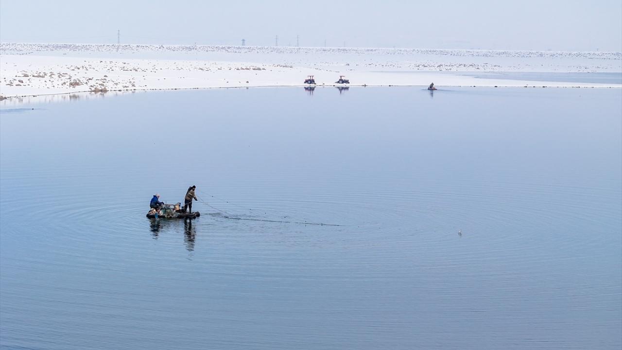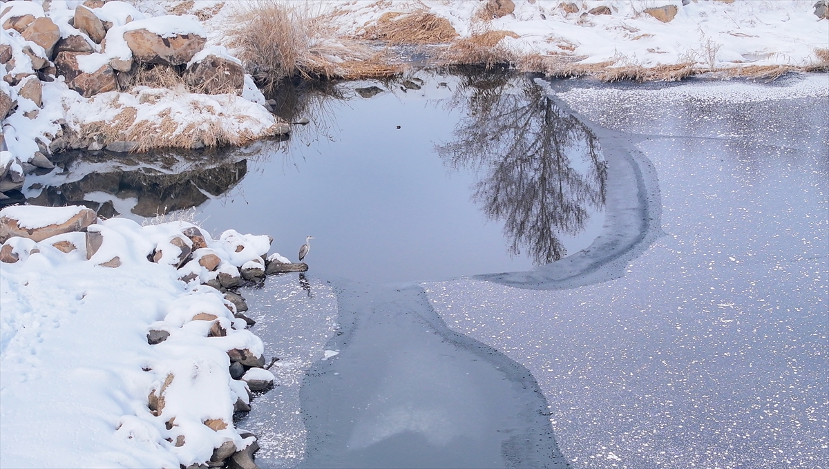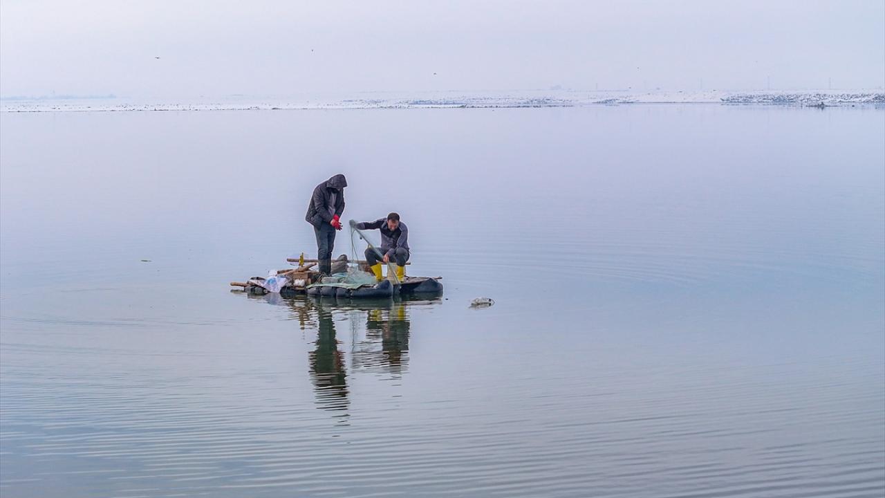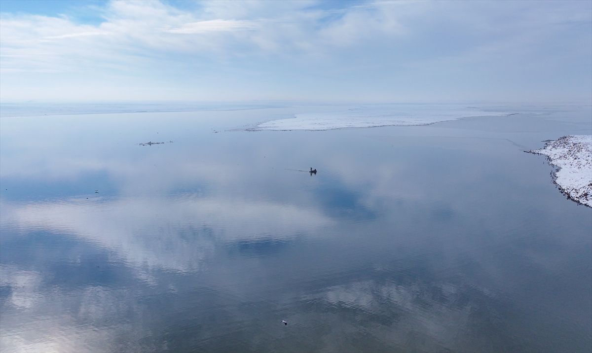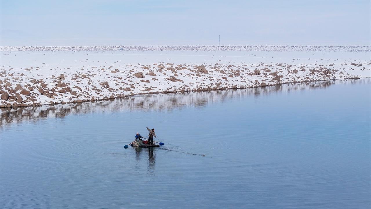 Kelek üzerinde balık tutan balıkçılar, göl kenarında avlanan balıkçıl kuşlar ve kızıl tilkinin beyaz örtü altında tarla faresini yakalama telaşı ise dronla görüntülendi.