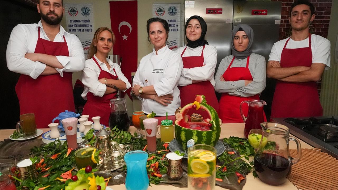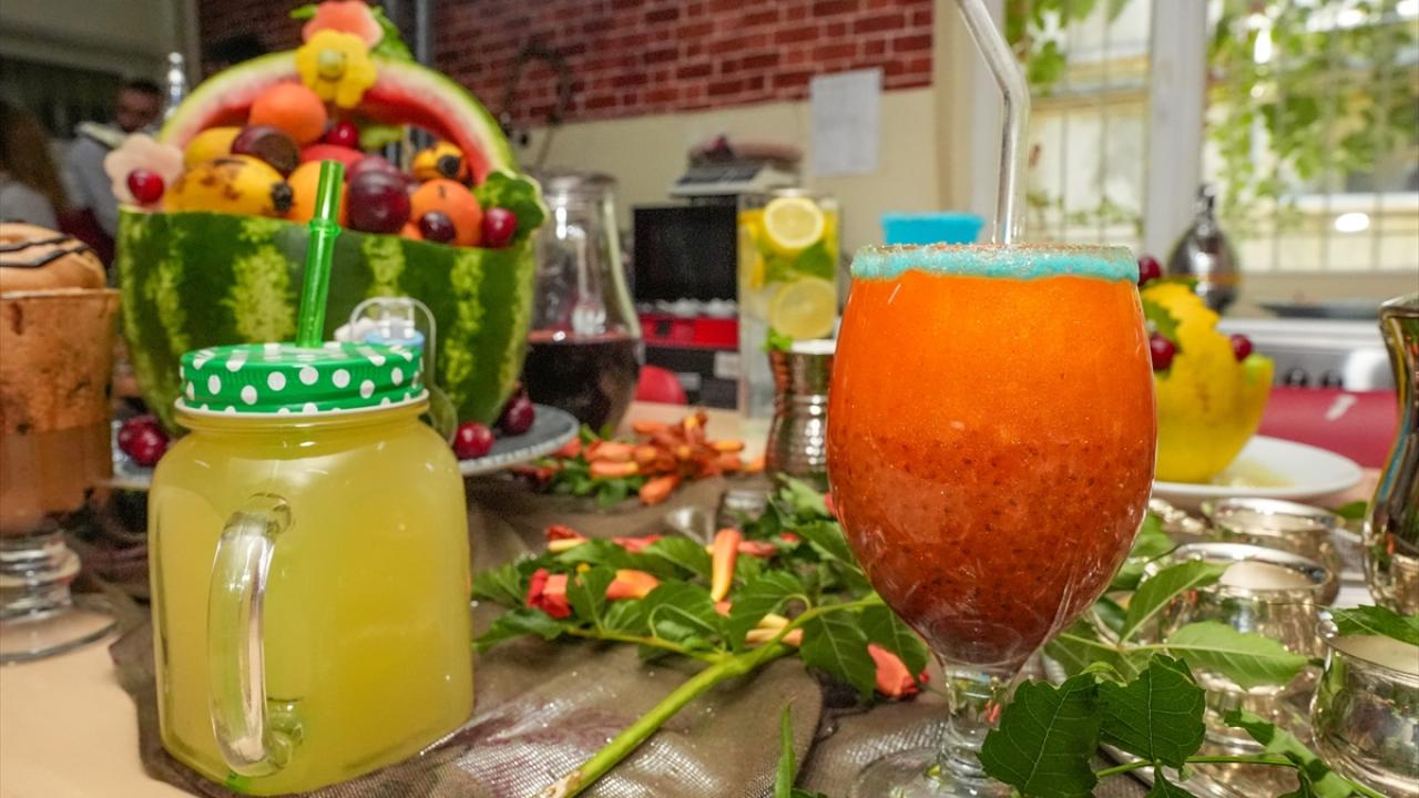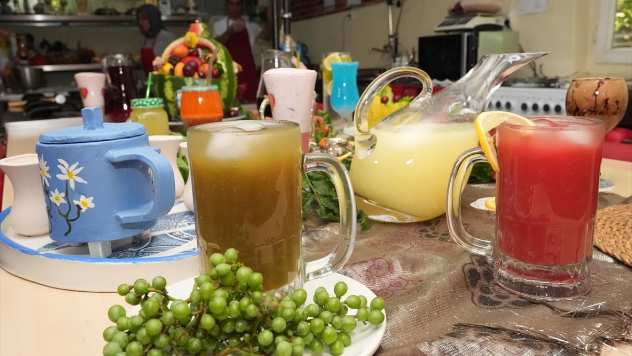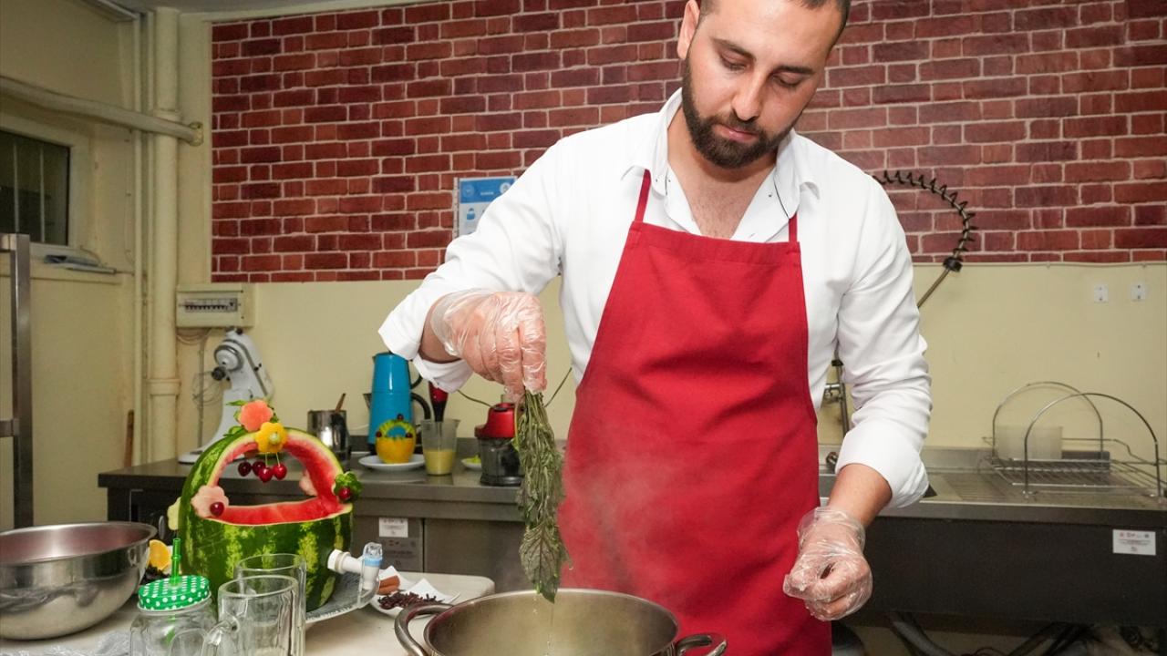 Önlüklerini giyerek uygulama mutfağına geçen eğitmen ve kursiyerler, reyhan, vişne, karpuz, kavun, üzüm, limon, karanfil, meyan, karadut, kızılcık, gül gibi meyve ve şifalı bitkilerle renk renk içecekler hazırlayarak sunum yaptı.