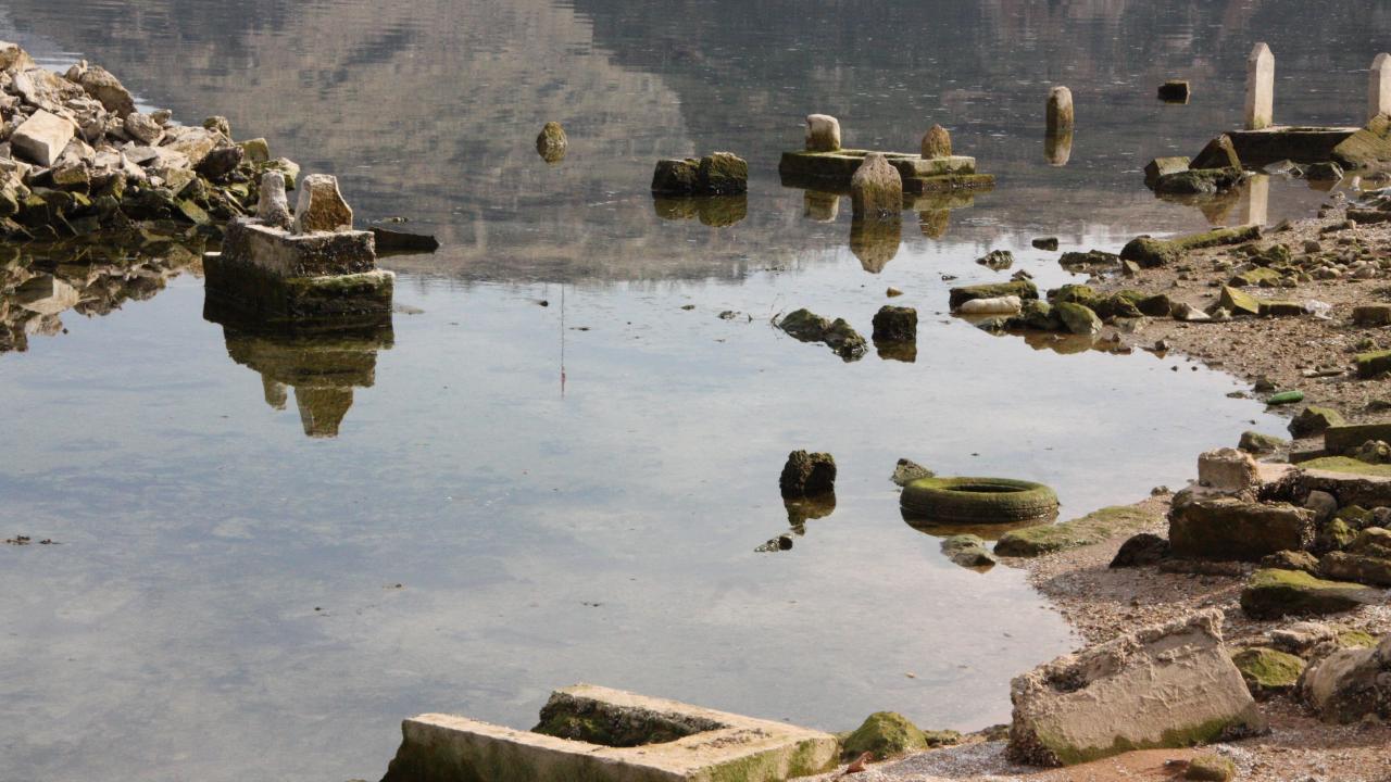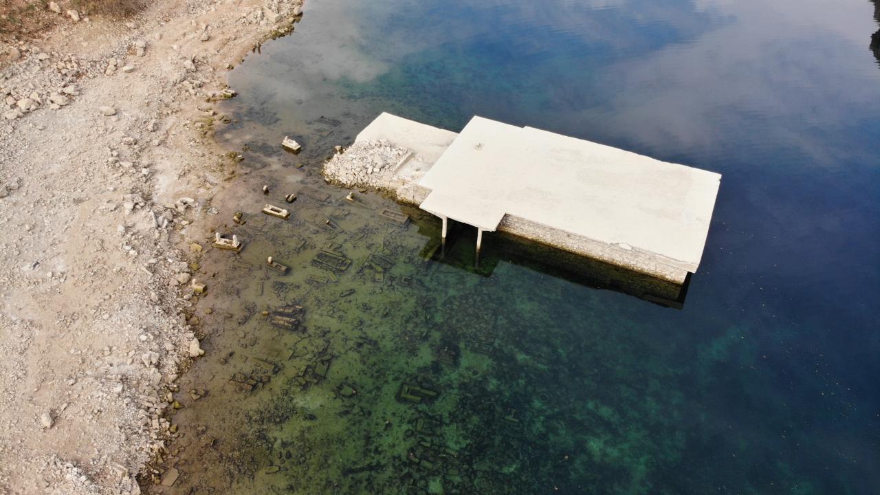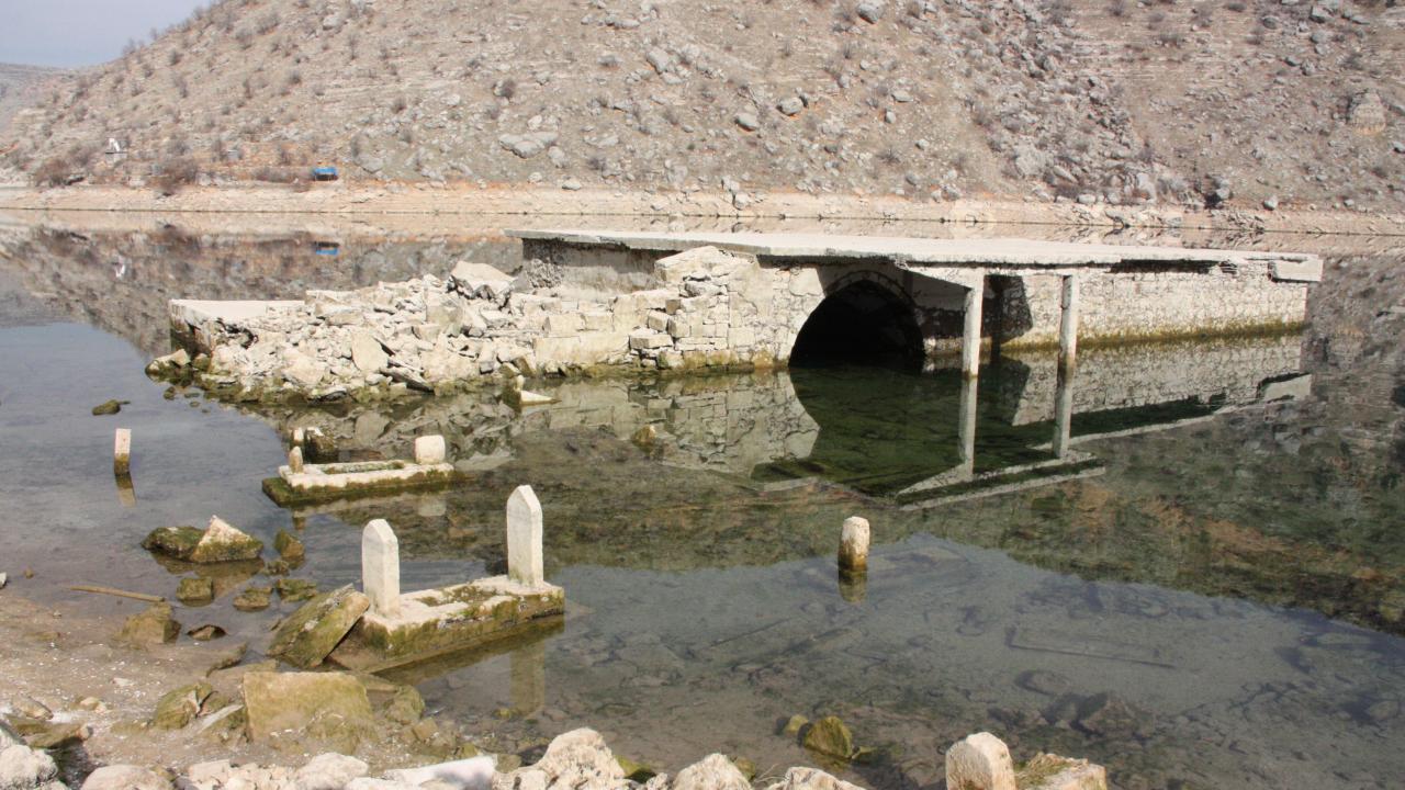 Su seviyesi düşen baraj gölünde, sular altında kalan Çakırören Mahallesi gün yüzüne çıkardı.